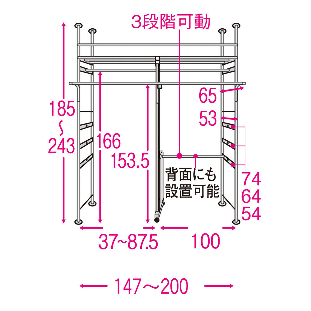 下段ハンガーバーは3段階に高さ調節できます。