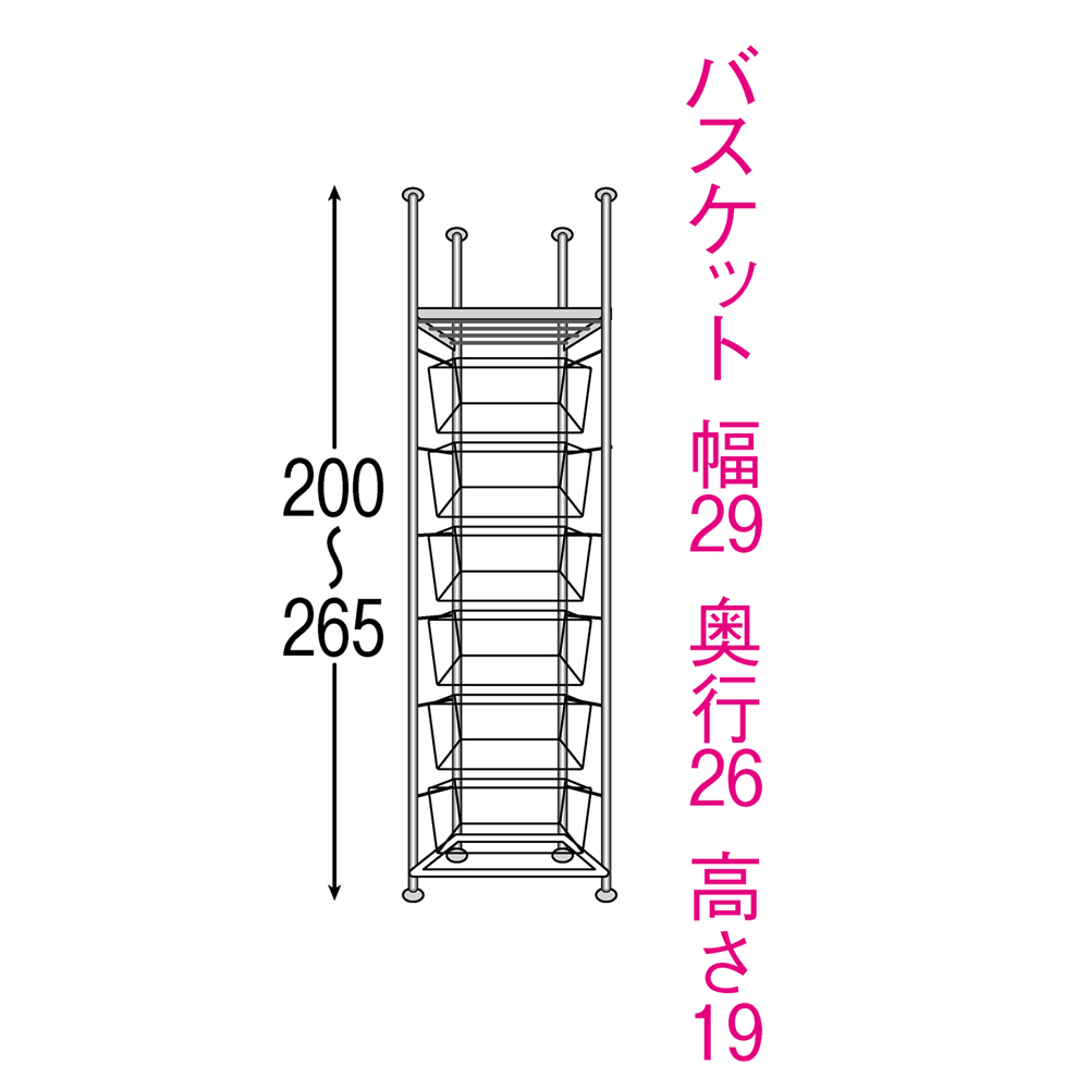 薄型で狭い場所でも大量収納ができる大容量頑丈ダブルハンガーシリーズのバスケットタイプ。バッグや小物、雑貨類をきれいに分けて収納できます。ニットやカーディガンを畳んでしまうのにも便利です。薄型収納ハンガーラックシリーズの小物収納に便利なバスケットタイプ。●通気性の良いバスケットの引き出しはバッグや帽子、タオルなどの小物収納に便利です。●バスケットはスライド式で出し入れも簡単です。●中身が見えるワイヤーバスケットなので収納物がひと目でわかります。●ハンガー掛けでは型崩れしてしまう「セーター」などの編み物にもおすすめです。●サイズは本体のハンガータイプに合わせて設計、奥行41cmとスリムなため狭い空間でも設置可能。●ウォークインクローゼット内や寝室等のお部屋の一角におすすめです。天井の高さに合わせてお選びいただけます。●天井高200〜265cm対応のロータイプはバスケットの個数6個。●天井高220〜285cm対応のハイタイプはバスケットの個数7個。●ハンガー掛けでは型崩れしてしまうセーター、ニットなどにもおすすめです。充実したデザインと機能性で使いやすさもバッチリ●商品本体部はホワイトカラーの少し光沢のある粉体塗装を施しており、清潔感のあるパイプを使用。●ホワイトにすることで壁との相性や馴染みからお部屋の雰囲気を邪魔せず、圧迫感をさらに感じにくくしております。●突っ張り式の商品で、天井でしっかり商品を支え安全性も配慮しております。●天突っ張る支柱は4本それぞれ高さ調整可能なため高さの違う梁にも対応できます。●上部にはスチール棚も付いており、カバンや箱衣装ケースの置き場として重宝します。●脚部はアジャスター付きでぐらつき、がたつきが出ないよう付か都の設置面にしっかり対応するように調整できます。