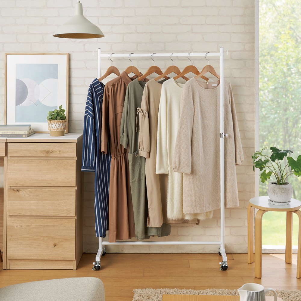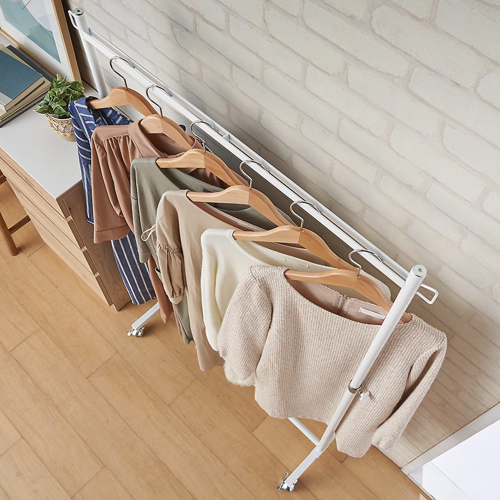 掛けるハンガーがナナメを向く新構造のハンガーラック。ナナメに掛かることで通常のハンガーラックよりも奥行いらずで狭い場所でもすっきり収納することができます。ハンガーがナナメに掛かる省スペース収納●ハンガーバーのすき間にハンガーラックを掛けると自然とナナメに掛かる新設計。●ハンガーがナナメに掛かることで洋服を掛けた時も必要な奥行は30cm前後になるため廊下や、寝室など狭いスペースでも圧迫感なく設置できます。●ハンガーバーがナナメに掛かかることで洋服が正面を向くため洋服が選びもしやすくなります。●ハンガーバーの耐荷重は約25kgあり薄型ながらしっかり洋服を収納できます。高さ調整など便利な機能が備わってます。●本体の高さは114.5cm〜154.5cmまで10cm間隔5段階に高さ調整可能。●高さ調整目印がついているため簡単に調整できます。●ハンガーバー下の最大高さは134cmありロングコートも掛けることが可能。●サイドフック付きでストールやバッグなど雑貨も1台にまとめて収納できます。●キャスター付きで衣替えや模様替え、お掃除のときも洋服を掛けたままスムーズに移動できます。●動かさない場合はアジャスターをお使いください。置き場所、収納量に合わせて2サイズからお選びいただけます。●本体幅は70.5cmと90.5cmの2タイプご用意しており、玄関やリビング、寝室など置きたい場所に合わせてお選びいただけます。