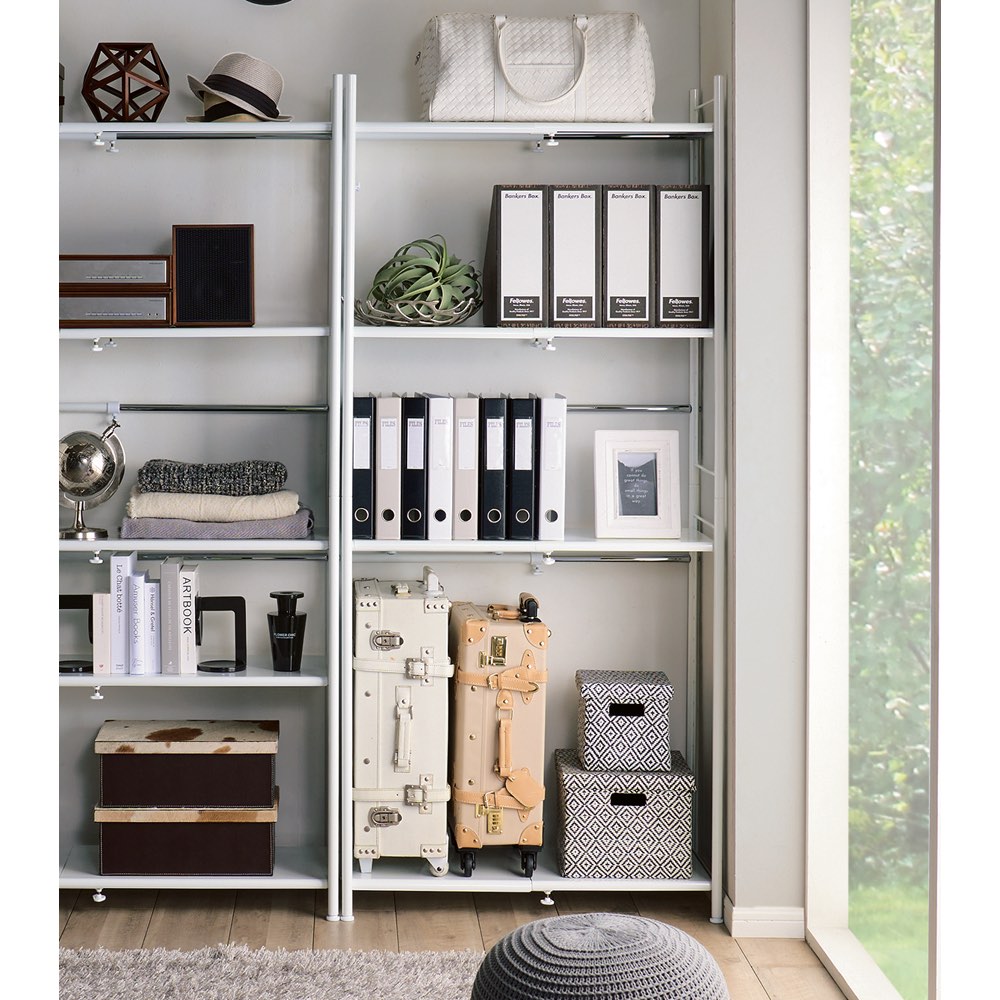 コーディネート例(イ)ホワイト フレキシブルな頑丈棚板で重い本や大きな物にも対応。 ※写真は左から棚5段・幅83〜125cmタイプ、棚4段・幅50〜83cmタイプ
