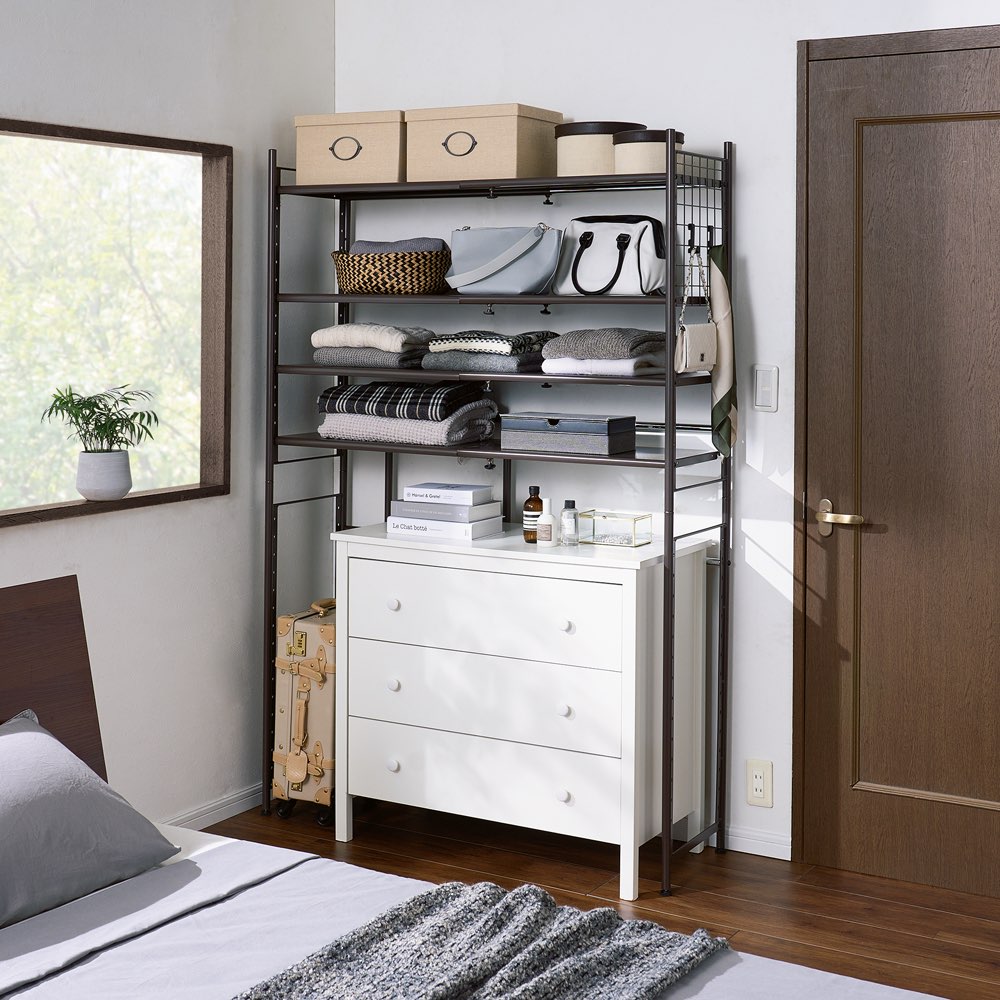 (ア)ダークブラウン ドアやスイッチを避けてぴったり置ける幅伸縮。 ※写真は棚4段・幅83〜125cmタイプ