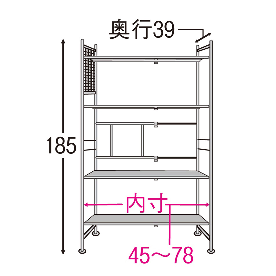 衣類収納、キッチンラック、書棚として等、多用途に使える頑丈伸縮ラック。幅は自在に伸縮でき、収納が欲しい場所の上部の空間を有効活用することも可能です。総耐荷重100kgの強度が自慢の収納ラック。幅伸縮の頑丈ラックでスペースを有効活用●リビングやキッチン等、使用場所を選ばすスペースを有効活用できるフレキシブルラック●設置場所も選べる可動棚なので、様々な用途に対応可能●コンパクトな空間をより有効活用できるのが大きな魅力です幅は2サイズ、棚板は4枚または5枚から選べてさらに伸縮可能●幅は50cm〜83cm、83cm〜125cmの2タイプをご用意●幅は簡単に伸縮可能なので、置きたい場所にピッタリ設置できます●棚板の数は4または5枚付きで、設置場所や収納量に応じてお選びいただけます。タフに使える頑丈仕様も自慢のポイント●パイプの厚みや棚板の裏の補強など、頑丈さにも様々なこだわりが●レンジ等重たい物を置いてもたわみにくいのが自慢です●総耐荷重100kgの頑丈設計です。用途や場所に応じて使い方も幅広いアレンジが可能●頑丈設計なので、大型の洋書や写真集等を収納することも可能です、●棚板の設置場所は5cm間隔で選べるので、 下にオープンスペースを設けてダストボックスやトランクの収納場所にしても〇●レンジ等を置くキッチンラックとしてもお使いいただけます。