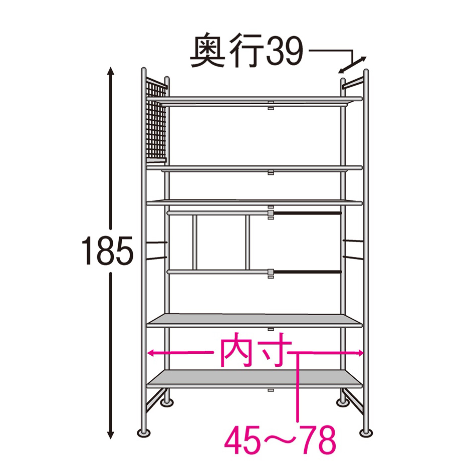 衣類収納、キッチンラック、書棚として等、多用途に使える頑丈伸縮ラック。幅は自在に伸縮でき、収納が欲しい場所の上部の空間を有効活用することも可能です。総耐荷重100kgの強度が自慢の収納ラック。幅伸縮の頑丈ラックでスペースを有効活用●リビングやキッチン等、使用場所を選ばすスペースを有効活用できるフレキシブルラック●設置場所も選べる可動棚なので、様々な用途に対応可能●コンパクトな空間をより有効活用できるのが大きな魅力です幅は2サイズ、棚板は4枚または5枚から選べてさらに伸縮可能●幅は50cm〜83cm、83cm〜125cmの2タイプをご用意●幅は簡単に伸縮可能なので、置きたい場所にピッタリ設置できます●棚板の数は4または5枚付きで、設置場所や収納量に応じてお選びいただけます。タフに使える頑丈仕様も自慢のポイント●パイプの厚みや棚板の裏の補強など、頑丈さにも様々なこだわりが●レンジ等重たい物を置いてもたわみにくいのが自慢です●総耐荷重100kgの頑丈設計です。用途や場所に応じて使い方も幅広いアレンジが可能●頑丈設計なので、大型の洋書や写真集等を収納することも可能です、●棚板の設置場所は5cm間隔で選べるので、 下にオープンスペースを設けてダストボックスやトランクの収納場所にしても〇●レンジ等を置くキッチンラックとしてもお使いいただけます。