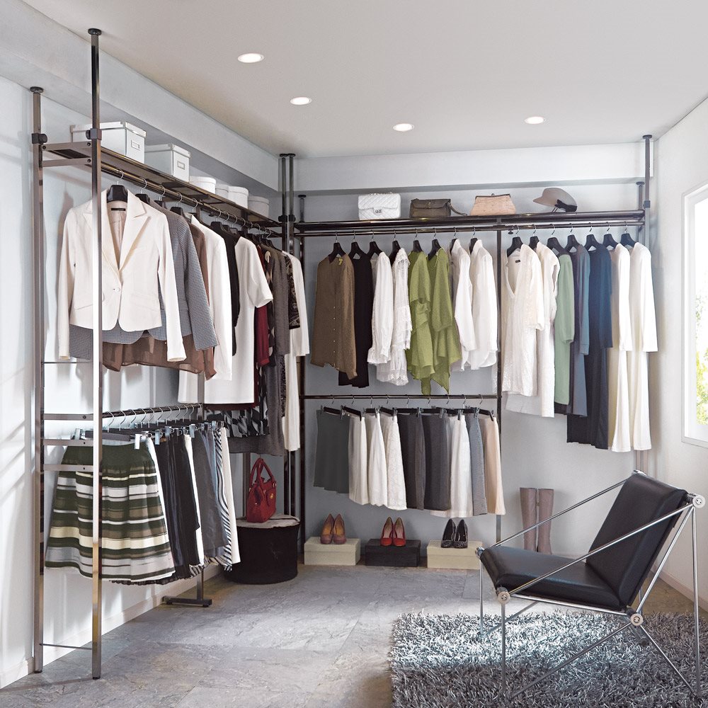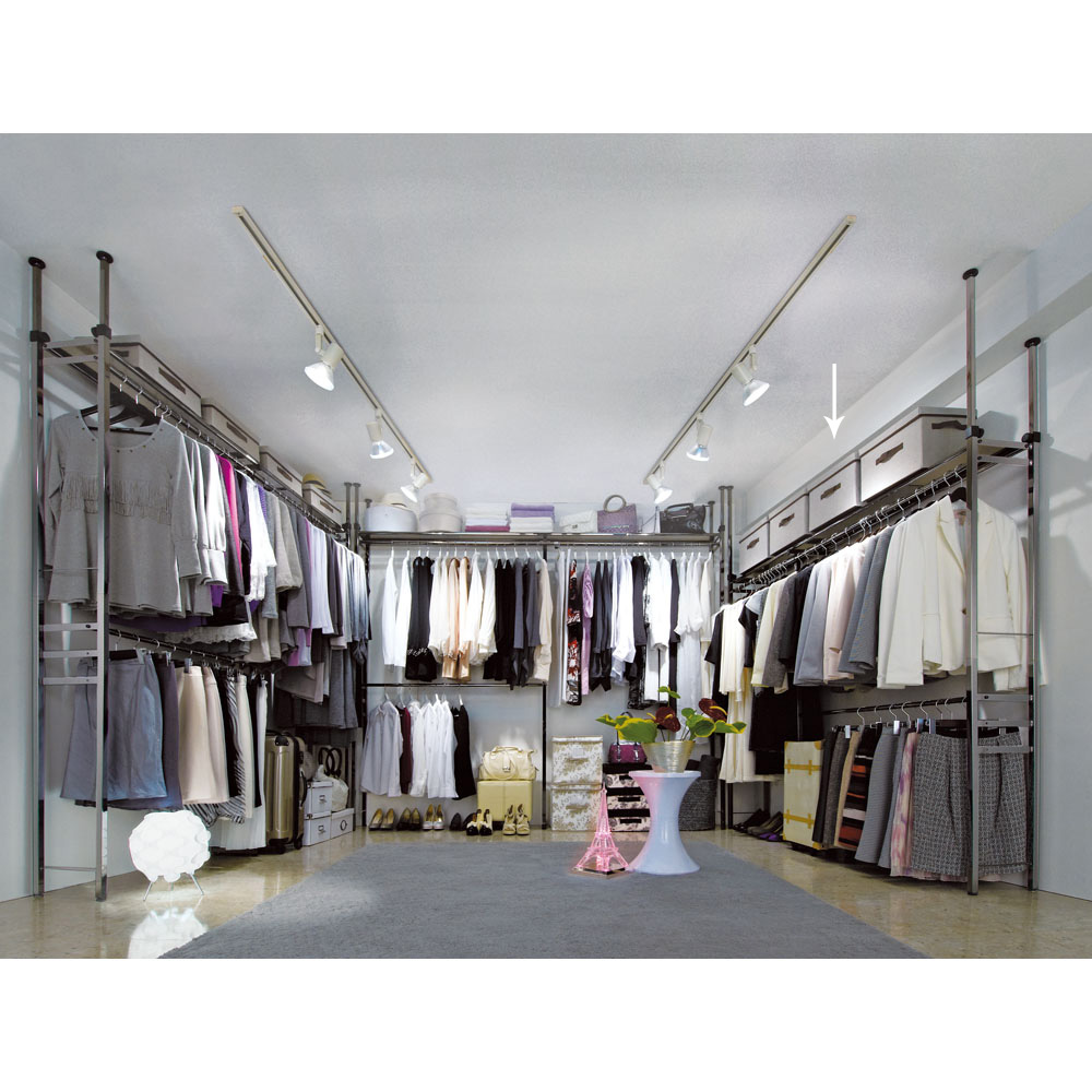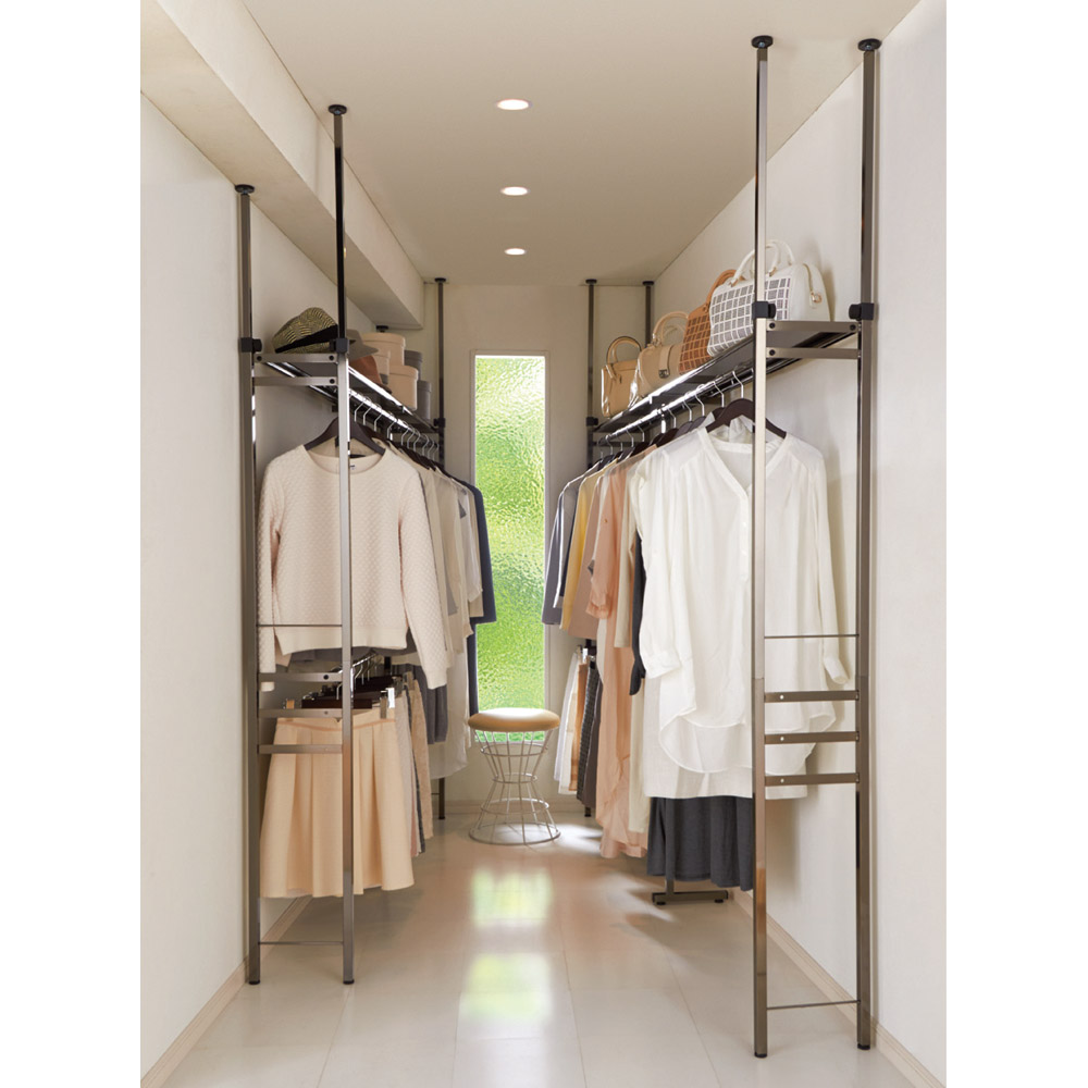 奥行30cmの薄型だからウォークインクローゼットの中での対面使いも可能です。(※写真は左:ロータイプ・幅111〜200cm、右:ロータイプ・幅140〜250cmです)