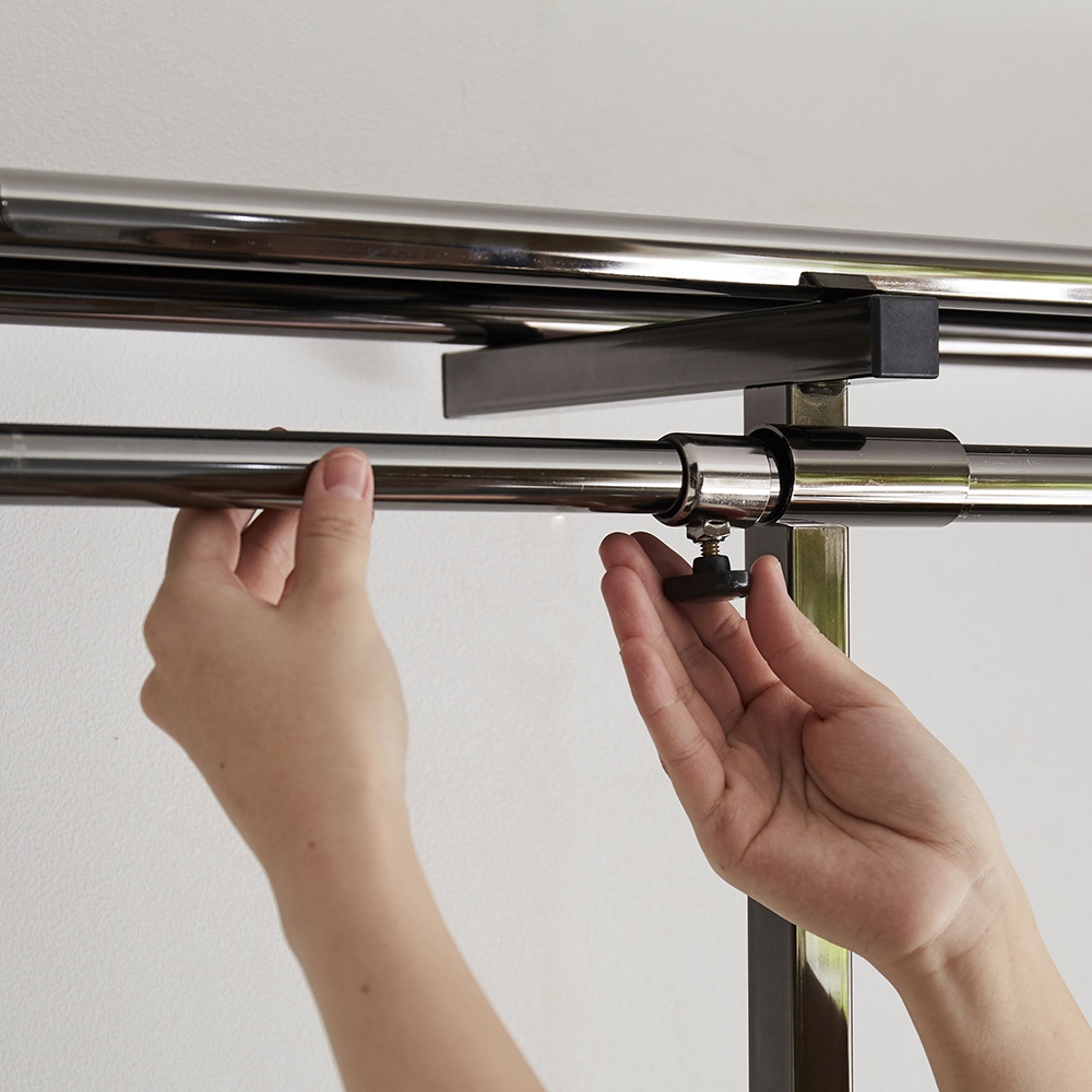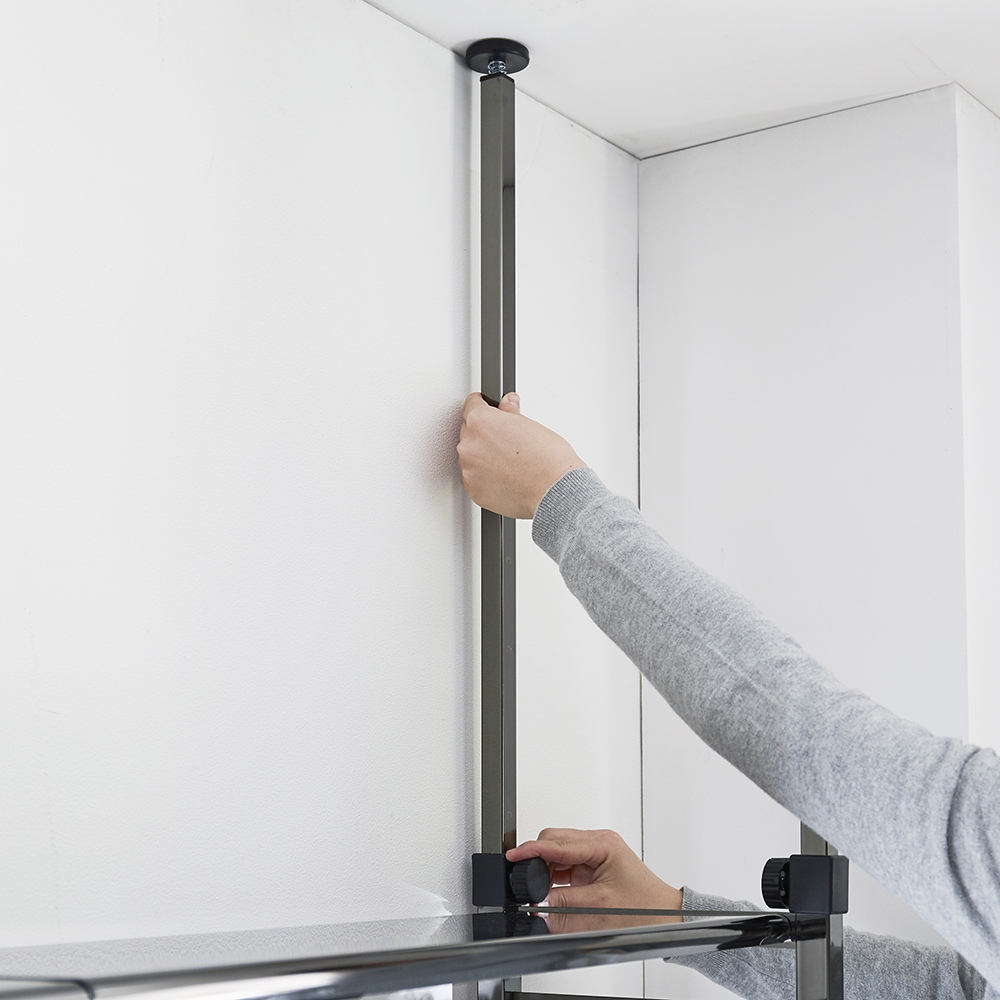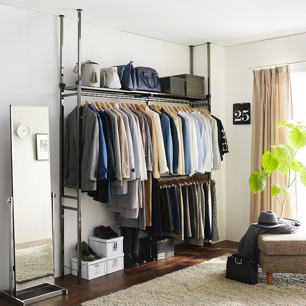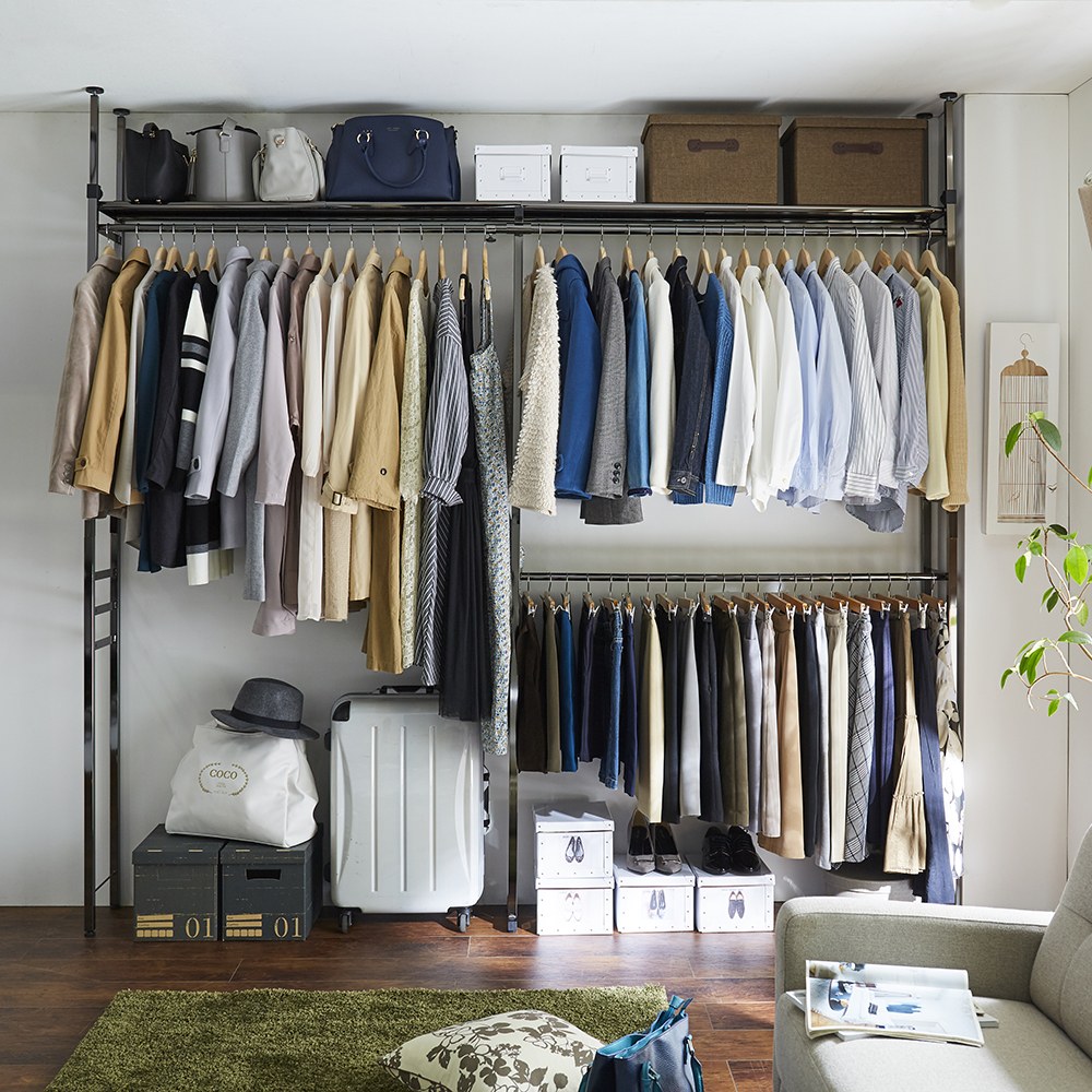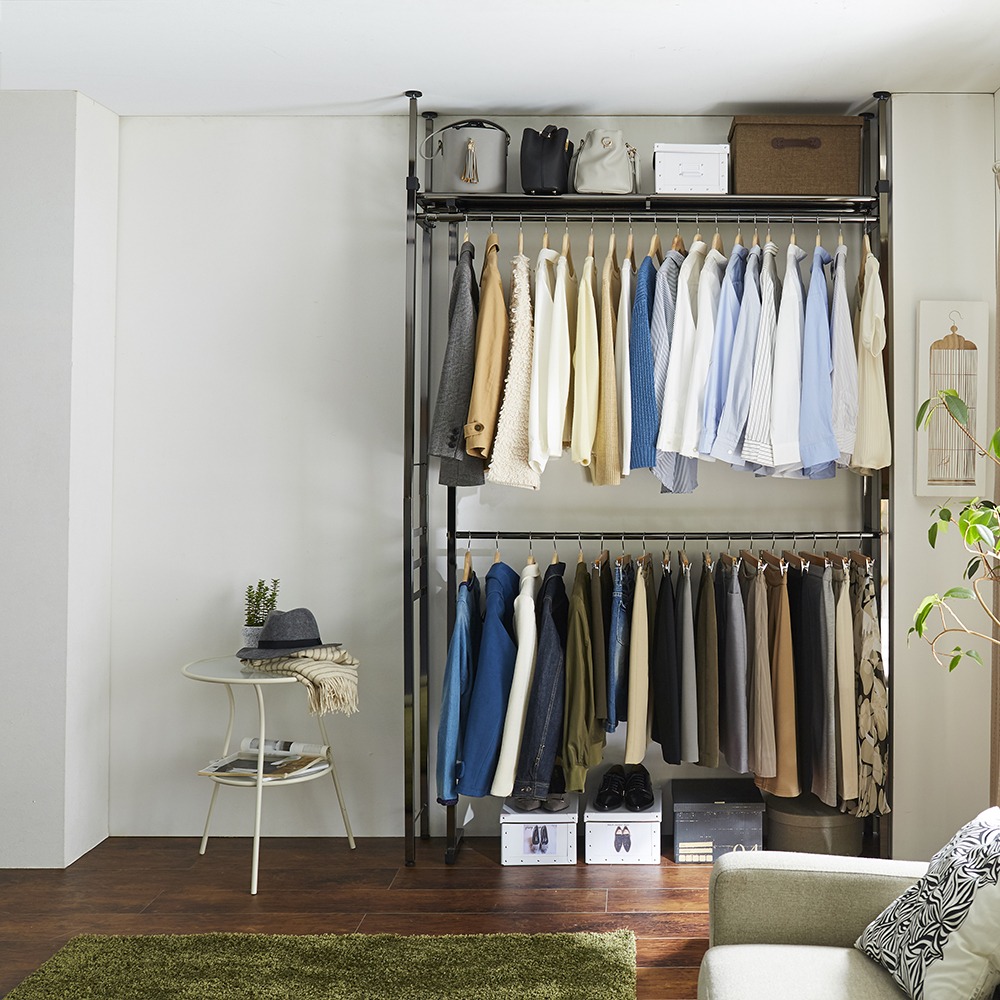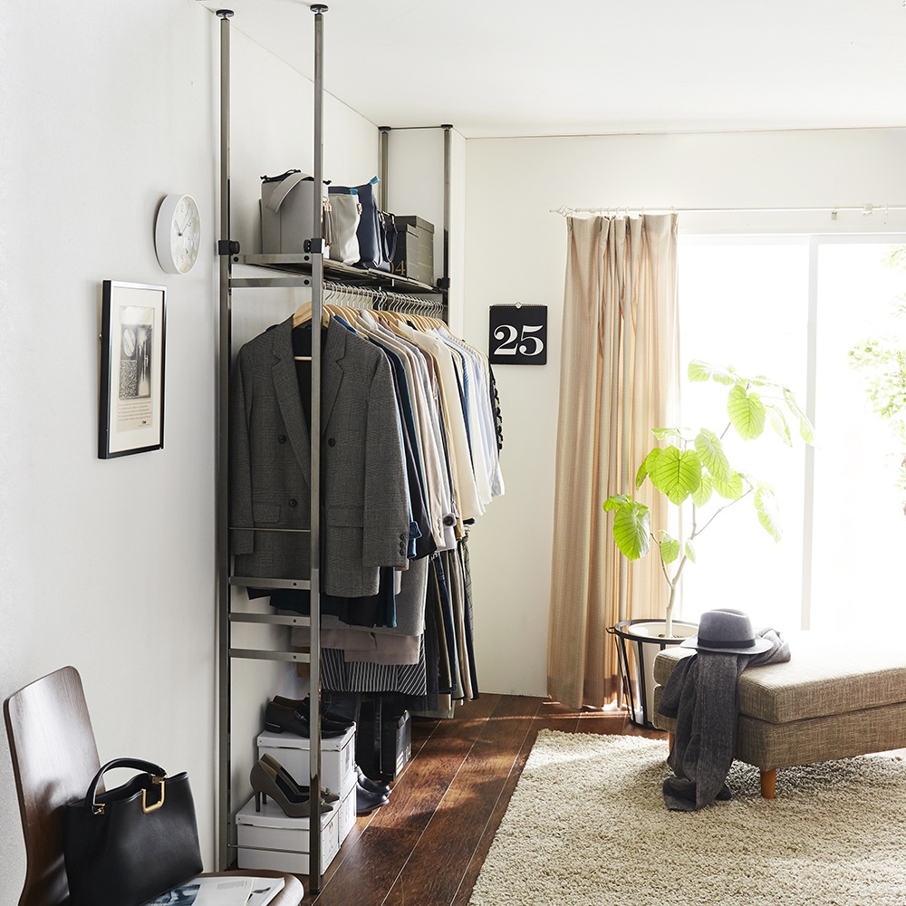 上品な光沢ブラックが洗練された空間を演出する収納ハンガーラック。奥行30cmの薄型だから寝室やウォークインクローゼットなど狭いスペースがおしゃれなワードローブに。幅が伸縮できるから、場所に合わせてぴったり設置できます。〜デザインコンセプト 高級ブランドショップのイメージを〜高級ブランドショップのイメージ。「洗練」「高級感」「上質」そんな言葉が思い浮かびます。そんな言葉を具現化するために何が必要かを考えました。洗練されたイメージを光沢のある仕上げで。高級感の象徴としてブラック色を採用。上質を保つため、第三者公的機関で耐荷重試験を実施。見た目だけでなく、ハイクォリティなクローゼットハンガーラックに仕上がりました。〜ラグジュアリーなデザインが、上質感ただようクローゼットスペースに〜◆高級感のあるブラック色。フォーマルと言えばブラック。そんな言葉を思い起こさせます。◆洗練さを維持する、光沢ブラック仕上げ。都会的なブランドショップを連想させ、大人の雰囲気を大事にしました。支柱・棚・バスケット・補強バーに至るまで光沢ブラック仕上げを採用。◆上質感にこだわったフォルム。直線的なフォルムを出すことで、実を兼ねた上質感を。◆思わずドレスアップしたくなる。いつまでも大人のオシャレを大事にしたい。そんな気持ちにさせてくれるデザインです。◆一日のプロローグもエピローグも、洗練された時間を作り出せそうです。〜洗練されたデザインをバックアップする、信頼の機能〜◆あなたのファッションコレクションをしっかり守るため、第三者公的機関で耐荷重試験を実施しています。◆洋服はやはり増えるもの。伸縮式で収納量に合わせて使えるもの嬉しいです。◆幅111〜200cmと、幅140〜250cmタイプから選べます。◆本体をしっかりと支える突っ張り式。本体を支えるのは当然。梁などにも対応できるのが嬉しい機能です。◆すべての荷重を支える支柱に22mm角パイプを採用。ベースをしっかり作ることで高級感をバックアップしてくれます。◆脚部には高さを約1cm調整できるアジャスター付き。本体をフラットに保つことで、収納するものを更に置きやすく。◆フラットなスペースを確保する、スチール棚を採用。少し小さめの収納物でも設置可能。〜商品担当者 開発ストーリー〜ファッション=私のアイデンティティ。それらを収納するハンガーラックにもこだわりたいものです。洗練された高級ブランドショップの感性と共鳴するクローゼットハンガーを。そんな想いを強くしました。歴史のあるブランドには到底追いつけませんが、「洗練」「上質」という言葉を追いかけて、少しでも近づけるように企画しています。