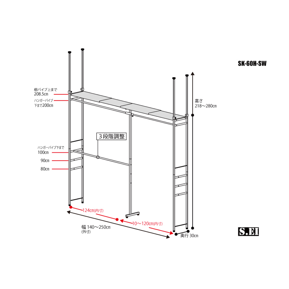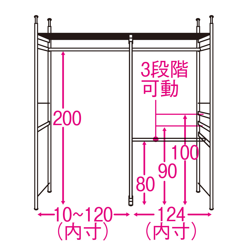 下段ハンガーバーは3段階に高さ調節可能です。