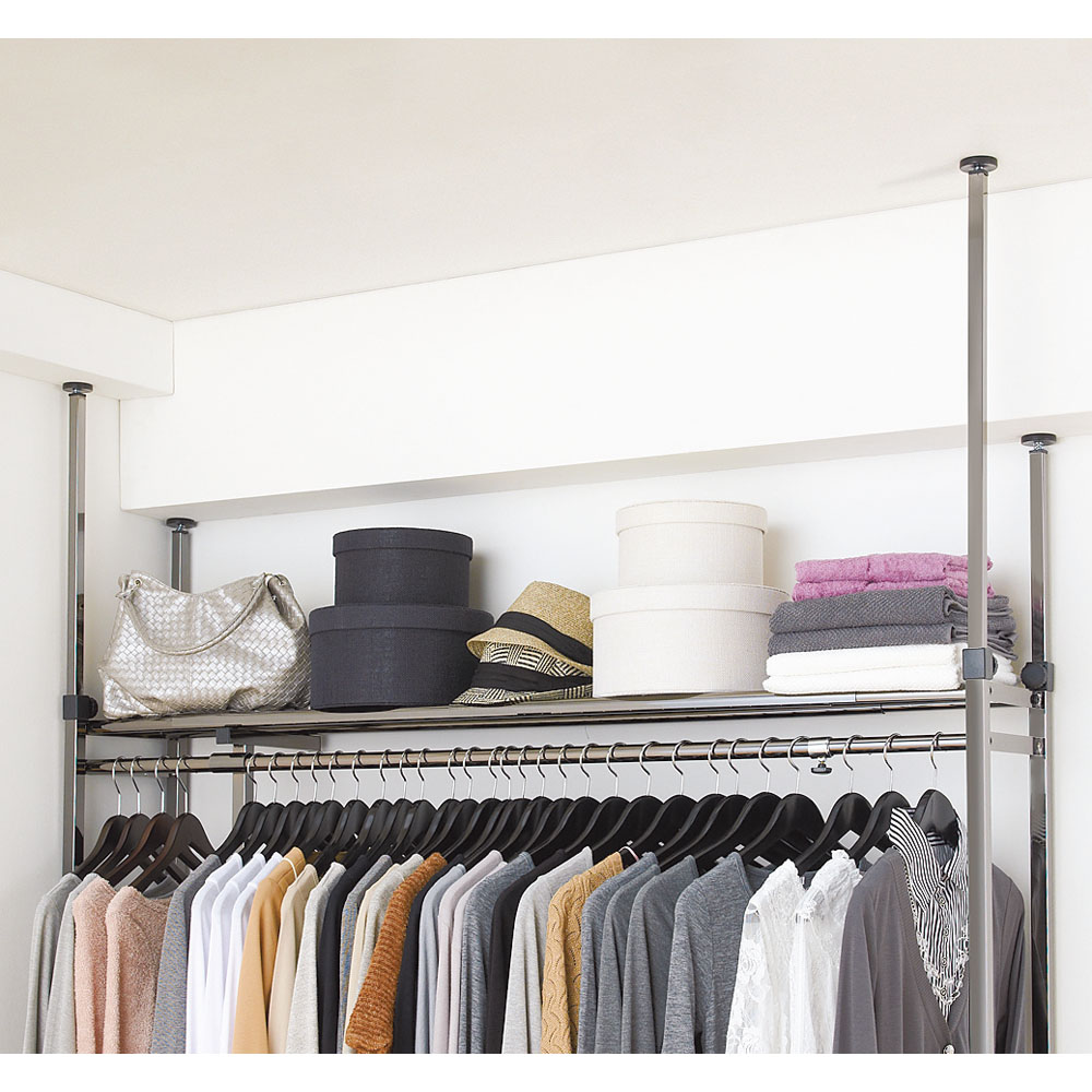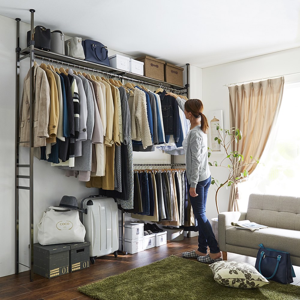上品な光沢ブラックが洗練された空間を演出する収納ハンガーラック。奥行30cmの薄型だから寝室やウォークインクローゼットなど狭いスペースがおしゃれなワードローブに。幅が伸縮できるから、場所に合わせてぴったり設置できます。〜デザインコンセプト 高級ブランドショップのイメージを〜高級ブランドショップのイメージ。「洗練」「高級感」「上質」そんな言葉が思い浮かびます。そんな言葉を具現化するために何が必要かを考えました。洗練されたイメージを光沢のある仕上げで。高級感の象徴としてブラック色を採用。上質を保つため、第三者公的機関で耐荷重試験を実施。見た目だけでなく、ハイクォリティなクローゼットハンガーラックに仕上がりました。〜ラグジュアリーなデザインが、上質感ただようクローゼットスペースに〜◆高級感のあるブラック色。フォーマルと言えばブラック。そんな言葉を思い起こさせます。◆洗練さを維持する、光沢ブラック仕上げ。都会的なブランドショップを連想させ、大人の雰囲気を大事にしました。支柱・棚・バスケット・補強バーに至るまで光沢ブラック仕上げを採用。◆上質感にこだわったフォルム。直線的なフォルムを出すことで、実を兼ねた上質感を。◆思わずドレスアップしたくなる。いつまでも大人のオシャレを大事にしたい。そんな気持ちにさせてくれるデザインです。◆一日のプロローグもエピローグも、洗練された時間を作り出せそうです。〜洗練されたデザインをバックアップする、信頼の機能〜◆あなたのファッションコレクションをしっかり守るため、第三者公的機関で耐荷重試験を実施しています。◆洋服はやはり増えるもの。伸縮式で収納量に合わせて使えるもの嬉しいです。◆幅111〜200cmと、幅140〜250cmタイプから選べます。◆本体をしっかりと支える突っ張り式。本体を支えるのは当然。梁などにも対応できるのが嬉しい機能です。◆すべての荷重を支える支柱に22mm角パイプを採用。ベースをしっかり作ることで高級感をバックアップしてくれます。◆脚部には高さを約1cm調整できるアジャスター付き。本体をフラットに保つことで、収納するものを更に置きやすく。◆フラットなスペースを確保する、スチール棚を採用。少し小さめの収納物でも設置可能。〜商品担当者 開発ストーリー〜ファッション=私のアイデンティティ。それらを収納するハンガーラックにもこだわりたいものです。洗練された高級ブランドショップの感性と共鳴するクローゼットハンガーを。そんな想いを強くしました。歴史のあるブランドには到底追いつけませんが、「洗練」「上質」という言葉を追いかけて、少しでも近づけるように企画しています。