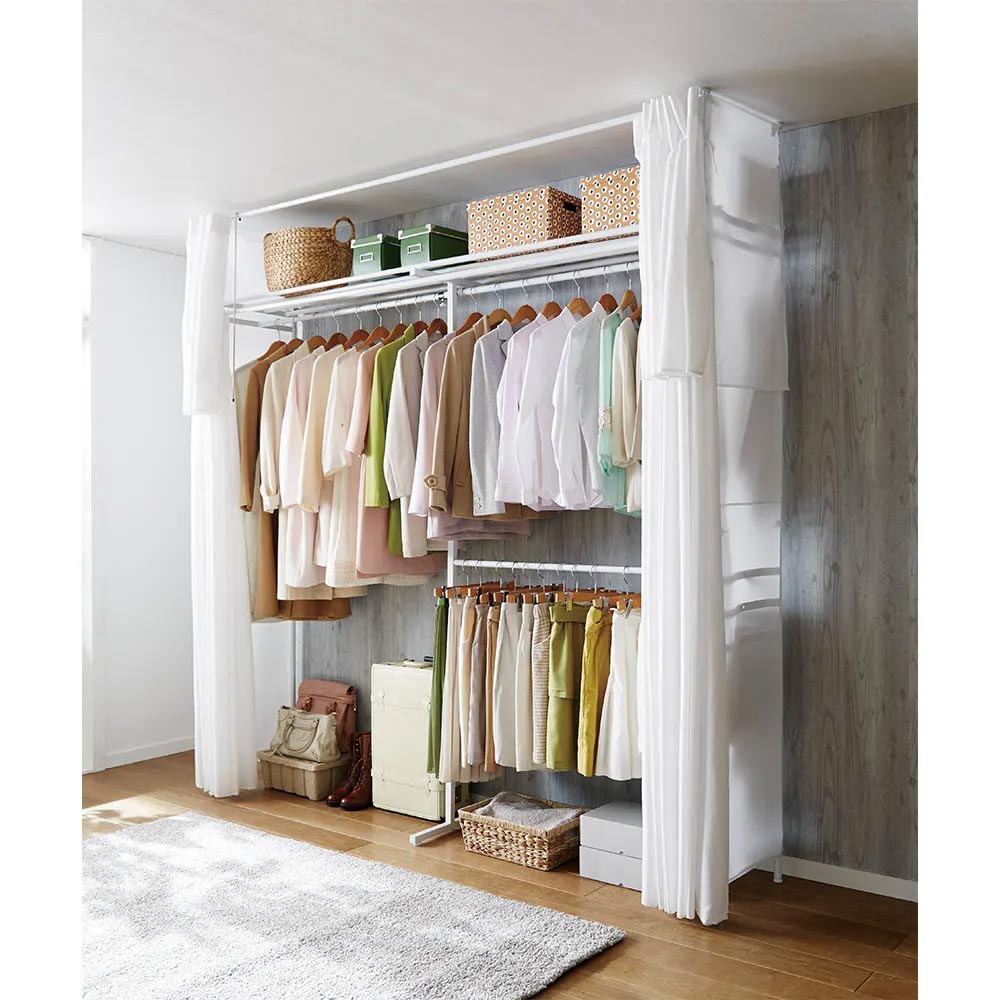 カーテンを閉めれば衣類をスッキリと隠せます。上下左右にカーテン付きで日焼けやホコリから衣類を守ります。急な来客でもサッと隠せて片付けの時短にも。