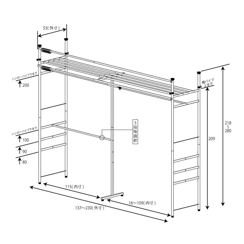 洗練された空間を演出するホワイト色の大量収納ハンガーラックです。総耐荷重約130kgの頑丈な突っ張り式だから、お気に入りの洋服をたっぷり、天井まで収納できます。ホワイト系の収納ケースやバスケットと合わせると、すっきりと統一感のある収納空間をつくれます。お部屋の雰囲気を明るくするホワイト色の突っ張り式ハンガーです●上質なクローゼットルームを思い起こさせる、ホワイトの統一感が特徴です。●「白」でカスタマイズするホワイトハンガーシリーズは、カーテン付き・カーテンなしタイプ、引き出し付き・引き出しなしタイプが選べて、お好みの収納空間にカスタマイズできます。●どんなテイストのお部屋にも合わせやすい、爽やかなハンガーラックです。●上質感を求め、金具や細部のデザインもこだわって作りました。●奥行53cmなのでウォークインクローゼットにもおすすめの商品です。家族の衣類を1台にまとめられる頑丈さ=耐荷重:約130kg●上棚:約55kg、上ハンガー部:約58kg、下ハンガー部:約18kgと頑丈な構造です。●ハンガーバーは厚みのあるパイプを使用し、スチール製の中間リングを使い、荷重をしっかり支えます。●下段のハンガーバーは収納する衣類の長さに合わせて3段階に高さ調整が可能です。●下段のハンガーバーは左右どちらにも設置可能です。●ワードローブや洋服タンス、チェストで購入を考えていたお客様にもおすすめの商品です。幅が伸縮するから、設置スペースに合わせて使えます(幅137〜230cm)●幅が伸縮できるので、ご自宅のスペースに合わせて設置できます。●つっぱり棒部分は4本別々に高さ調整できるので、天井の梁にも対応できます。商品のおすすめポイント●洋服をたくさん掛けたい、見た目はシンプルが良い、という方におすすめのクローゼットハンガーです。●しっかり固定できる突っ張り式なので揺れや荷重に強いので安心してお使いいただけます。●白い壁でも色のある壁にもマッチする、シンプルなホワイトが魅力です。