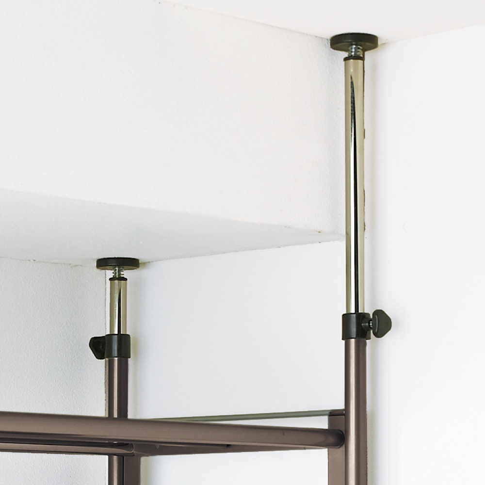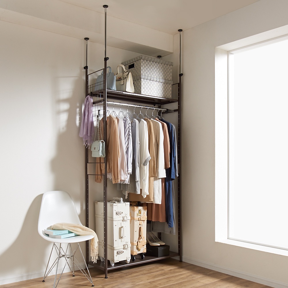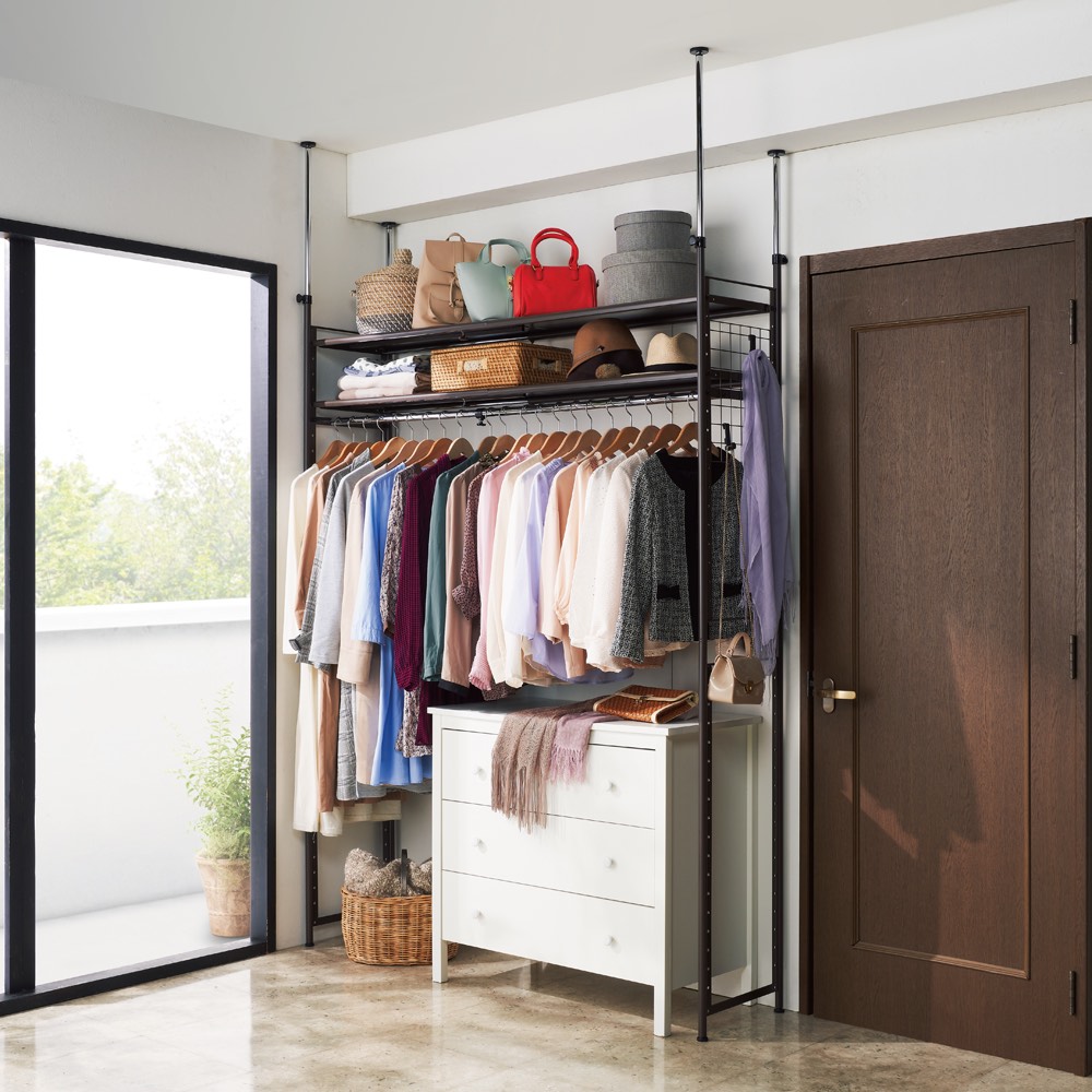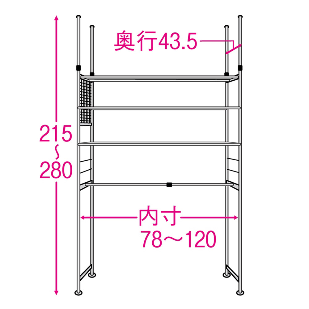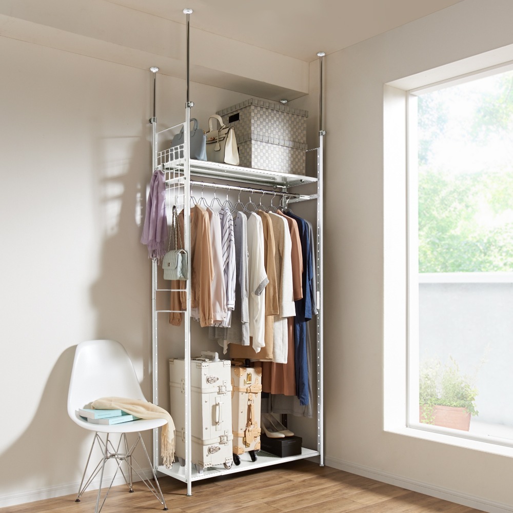 衣類収納、ピアノ上、デスク上、多用途に使える頑丈ハンガーラック。幅は自在に伸縮でき、収納が欲しい場所の上部の空間を有効活用できるマルチ頑丈ラックです。総耐荷重100kgの強度が自慢の収納ラック。デッドスペースを収納空間に大変身できる便利アイテム●ピアノやデスク上、チェストの上を有効活用できるフレキシブルラック●ハンガーバー1本・可動棚は2枚付きで、様々な用途に対応可能●コンパクトな空間をより有効活用できるのが大きな魅力です高さは3サイズ・幅は2サイズから選べてさらに伸縮可能●高さは185cmと突っ張り天井高さ195cm〜265cm・215cm〜280cm対応の3タイプ●幅は83cm〜125cm、103cm〜160cmの2タイプをご用意●幅は簡単に伸縮可能なので、置きたい場所にピッタリ設置できますタフに使える頑丈仕様も自慢のポイント●パイプの厚みや棚板の裏の補強など、頑丈さにも様々なこだわりが●公的機関で耐荷重試験も実施し、総耐荷重100kgを実現●レンジ等重たい物を置いてもたわみにくいのが自慢です用途や場所に応じて使い方も幅広いアレンジが可能●伸縮ラック単品でハンガーバーを使えば、お部屋に大容量のクローゼットが完成●ハンガーバーは取り外せば、ピアノやキッチン収納上を有効活用できる収納に●棚板とハンガーバーは収納物に合わせて5cm間隔で調節できます〜シリーズ品を購入したお客様からの声●しっかりしています。大人二人で組み立てて1時間ちょっとです。見せたくないコタツ机やこどものおもちゃ、クリアボックスなど・・・いろいろ隠せます。お値段がもう少し・・・。(棚付きタイプ・幅128〜205cmを購入)●子供部屋の机の上に棚が欲しいとずっと思っていましたが、マンションなので天井に梁がありなかなか合うものが見つかりませんでした。これは、高さも段差に対応し、横幅も調整できるので、狭い部屋にもぴったりでした。組み立ても簡単で、長男と主人で組み立てることができました。強度もしっかりしていて大満足です。本や趣味のフィギュアを飾り、子供達も喜んでいます。(突っ張り式・幅103〜160cmを購入)●サイズ感がぴったりで、気に入っています。組み立ては、女性一人で約1時間で完成しました。組み立ては2人でできればもっといいと思いました。今までは、洋服を脱ぎっぱなしだった家族もオープンラックなので脱いだ服もすぐハンガーにかけて、部屋が片付いてきれいになりました。棚にハンカチかごや靴下かごを用意したものを置けるので、便利に使えるのがうれしいです。(突っ張り式・幅103〜160cmを購入)