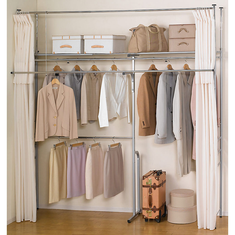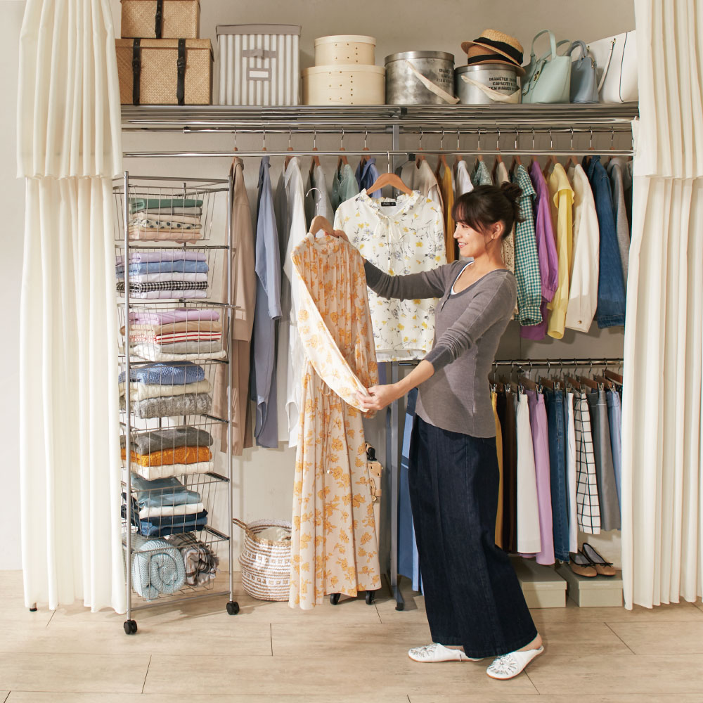部屋に合わせて無段階に幅伸縮するワードローブ。天井の梁をよけて、突っ張り式の頑丈ハンガーラックです。壁面収納ハンガーをお探しの方に厳しい耐荷重試験をクリアした品質を。カーテン付きの衣類収納です。自分で簡単に作れるワードローブ。大容量の壁面収納クローゼットハンガーです●オーダー感覚で壁一面をクローゼット収納にできるロングセラー商品です。●「収納力」と「頑丈さ」が特徴。季節の衣類もたくさん収納することができます。●収納ハンガーをお探しの方におすすめのディノスで人気のハンガーラックです。【ポイント 1】「天井の高さ」に合わせてお選びいただけます●マンションの低い天井の梁にも対応する高さ「185cm〜243cm」の方は「ロータイプ」。●ロング丈のコートも掛けられる、大容量の高さ「218cm〜277cm」の方は「ハイタイプ」。●天井に梁があっても設置可能、カーテンバーを外せば左右の段差にも対応できます。【ポイント 2】「幅」に合わせてお選びいただけます●4〜6畳のワンルームや寝室におすすめの「標準幅(147〜200cm)」。●8〜10畳の寝室やウォークインクローゼットにおすすめの「ワイド幅(195〜273.5cm)」。●ウォークインクローゼットなど壁一面を収納のしたい方は「超ワイド幅(260〜340cm)」。【ポイント 3】大量収納にぴったりな「頑丈さ」…第三者機関の耐荷重試験をクリア●突っ張り式だから洋服をたくさん掛けてもしっかり支えます。●中央のパイプには強度に優れたパイプを使用しています。●前面には便利なちょっと掛けサブハンガー付き。取り外してご使用可能です。●下段ハンガーは丈の長さに合わせて3段階の高さ調節ができます。【ポイント 4】ホコリや日焼けから衣類を守る「カーテン付き」●前面にはご自宅の洗濯機で洗えるカーテン付きです。●カーテンでサッと目隠し収納ができます。●また、市販のカーテンに付け替えることができます。(※サイドカーテンは別売りです)