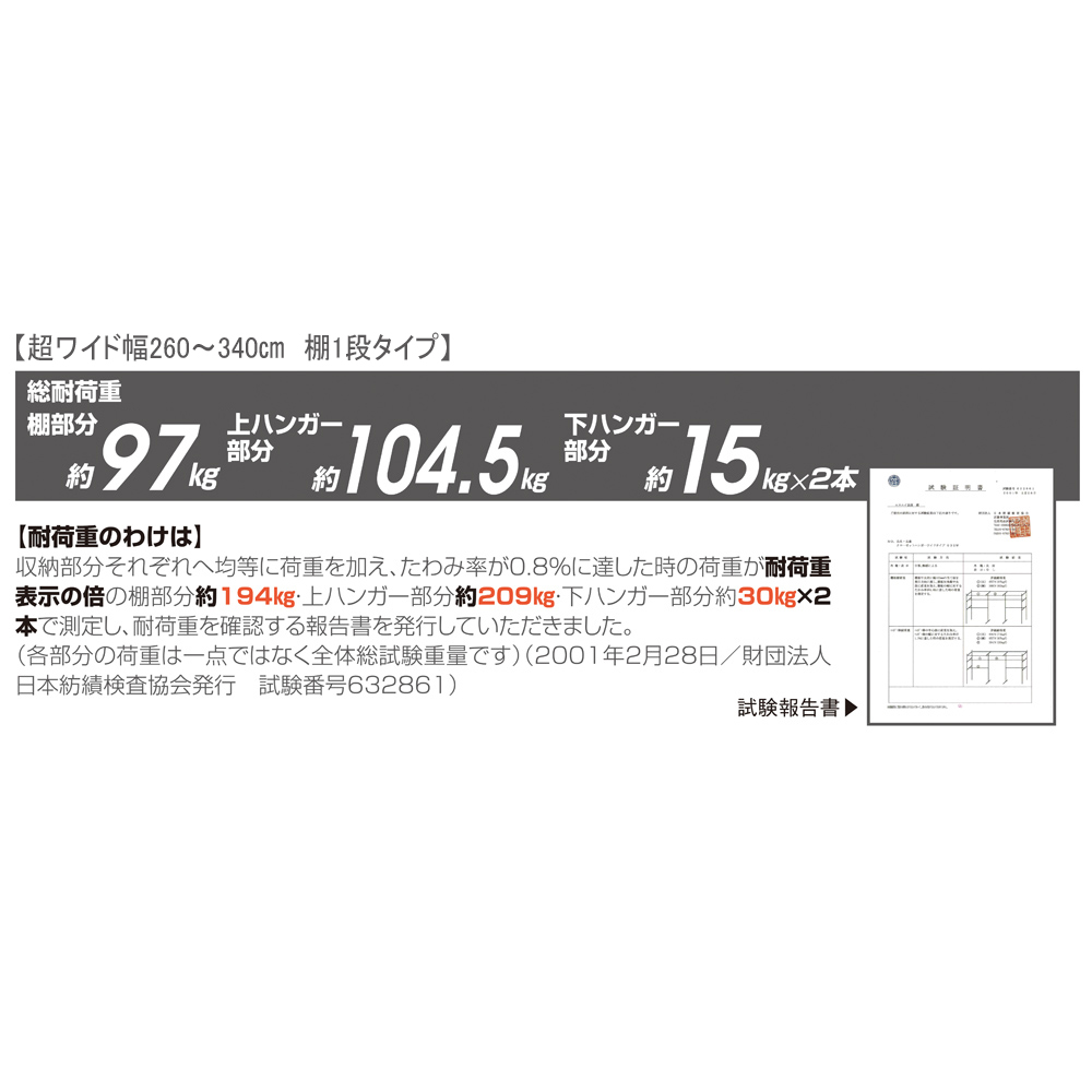 第三者公的機関の耐荷重試験を実施し、頑丈なハンガーに仕上げました。※画像はハイタイプ・超ワイド幅です。