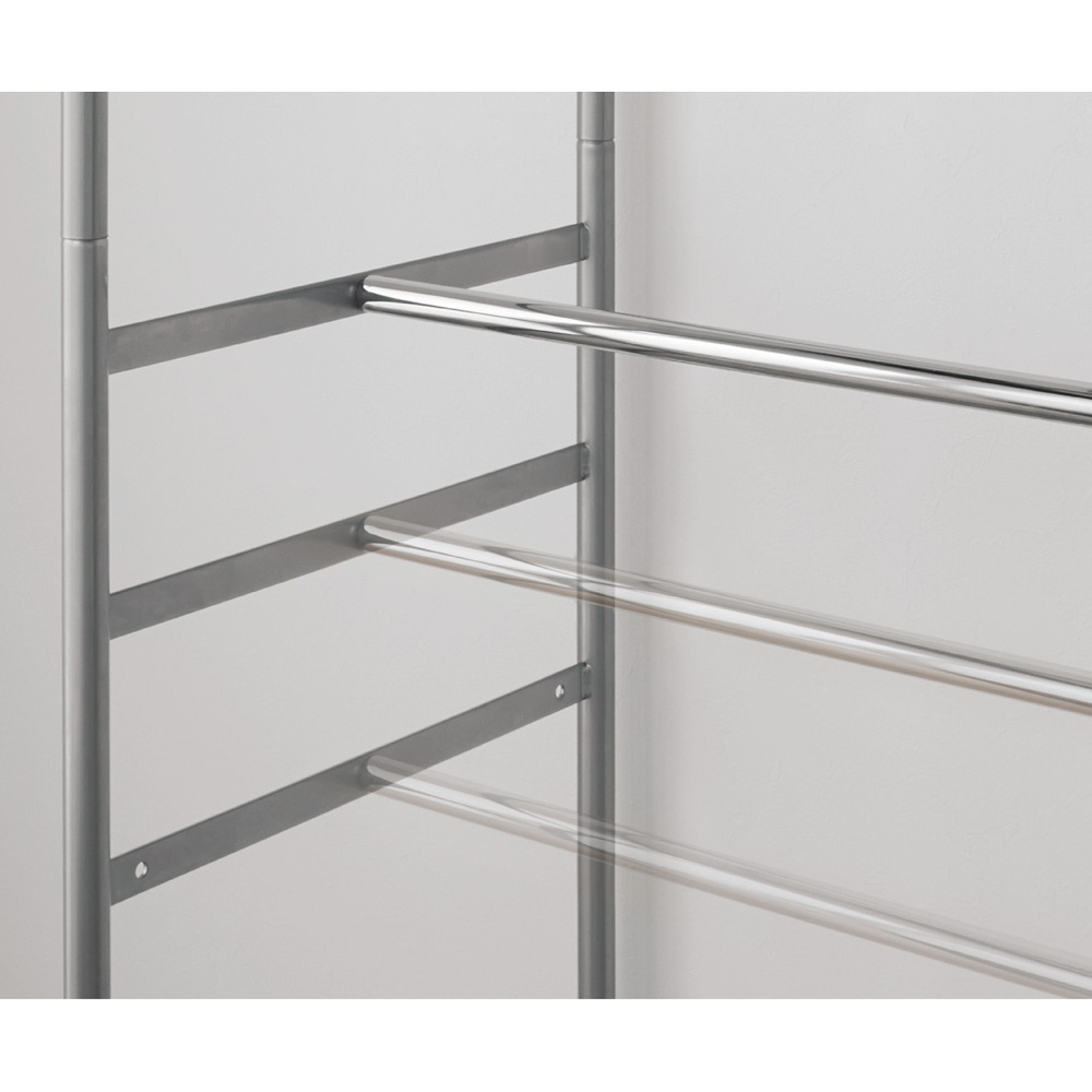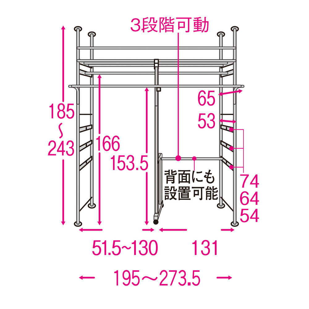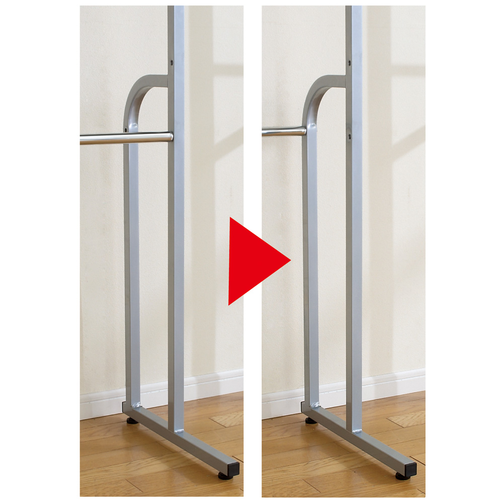 下段ハンガーバーは支柱と背面のどちらにも設定できます。背面に取り付けた場合、ロング丈のコートも掛けられます。