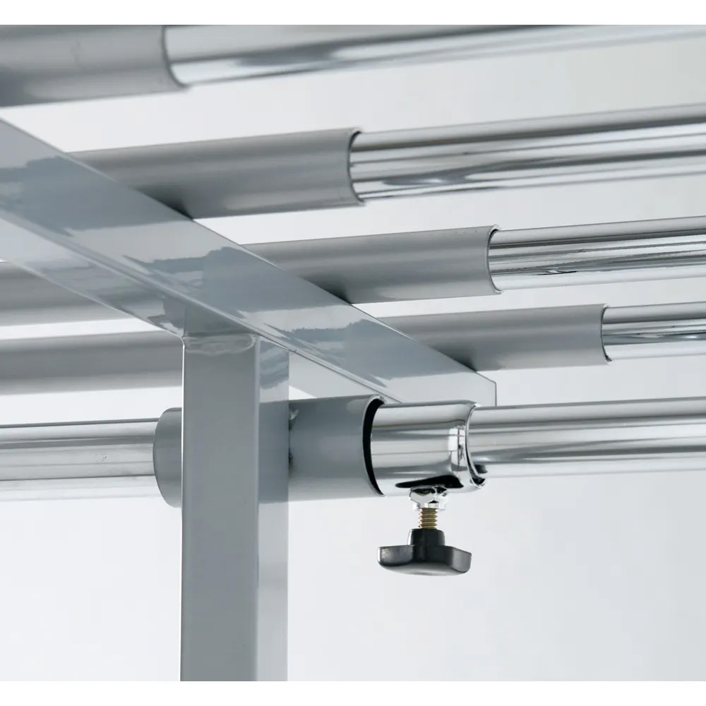 大型で頑丈な突っ張り式だから、バスタオルも布団も干せて梅雨時も花粉の季節も大活躍。 ※写真は別売りの【幅111cm〜200cm・ハイタイプ(高さ218〜280cm)・カーテンなし】タイプです。