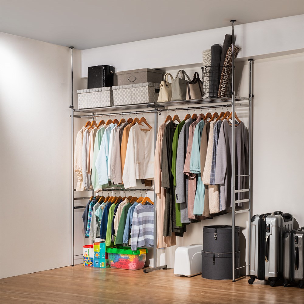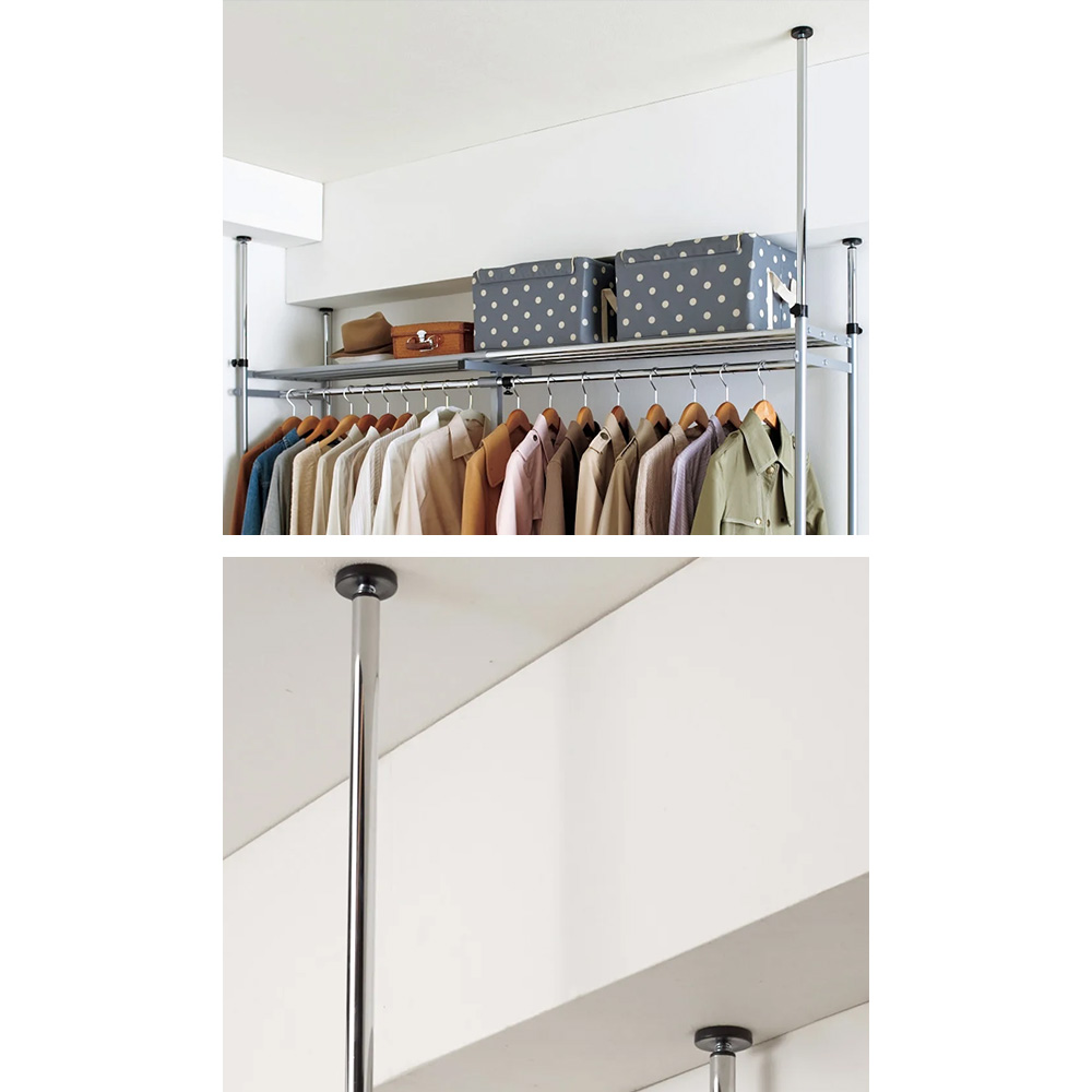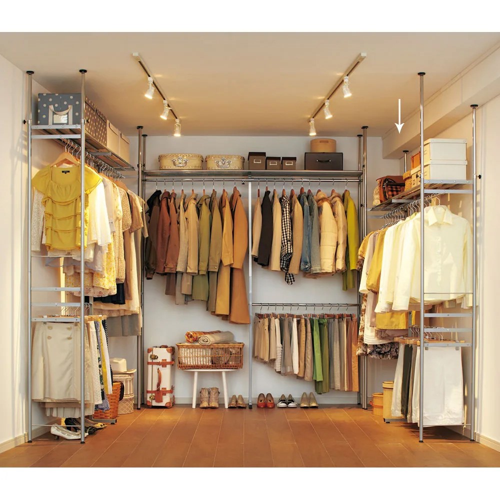 本商品は「ウォークイン突っ張りハンガー 幅111cm~200cm・ロータイプ(高さ185cm~245cm)・カーテンなし」です。簡単にウォークインクローゼットが作れる人気の突っ張り式ハンガーです。厳しい耐荷重試験をクリアした自信の品質でお手持ちの洋服がたっぷり掛けられます。奥行は43.5cmのスリムタイプ。本体の幅も空間に合わせて伸縮できるので、置きたい場所にぴったり設置できます。対面やL字、コの字置きなど、自由に組み合わせることで間取りに合わせて大容量の収納空間もカスタマイズ可能。ロータイプは梁天井にも対応でき、ウォークインクローゼット内での使用もおすすめです。壁一面が素敵な大量収納ワードローブに!奥行43.5cmの薄型タイプの突っ張りハンガーラックです●クローゼット内で対面使いもできる薄型の大量収納ハンガーラックです。●突っ張り式なので天井まで無駄なく洋服をたっぷり収納することができます。●ロング丈のコートからジャケット、ワンピースなど様々な衣類が収納可能です。上段ハンガーバー耐荷重は約50kgでお持ちの衣類がすっきり収納できます●第三者機関の厳しい耐荷重試験をクリアした自信の品質で洋服がたくさん掛けられます。●上の棚は約80kgまでOK。重たい収納ケースやバッグ、リュックなどを置いても丈夫でグラつきません。●下段のハンガーバーは約12kg。スカートやパンツを掛けるのに十分な強度があります。●下段バーは3段階で高さが調整できるので、メンズのスラックスやロングスカートの丈にも合わせて収納することができます。部屋のスペースに合わせて本体の幅が伸縮できます●突っ張り部分は4本とも別々に高さが調節できるので、天井に複雑な梁がある部屋でもOKです。●家具と家具の間の狭い「すき間」にもぴったり設置することができます。●天井の対応高さは185cm〜245cmなので様々な間取りに設置できます。●足下にはアジャスターが付いているので高さの微調整ができます。リフォームより断然リーズナブルで、造り付け家具よりフレキシブル◆衣類収納のスぺパとコスパ両面ともに優秀な、ウォークイン突っ張りハンガーシリーズ。天井までの高さを生かせる大容量収納を、リフォームよりもぐっと低予算で実現できます。限られた広さでも置ける薄型の奥行43.5cmと、設置場所や衣類の量に合わせて自由に幅伸縮できるのもポイントです。◆置き場所を変更したい時や引っ越しで環境が変わっても、何度でも設置し直してお使いいただけます。頑丈さに加え、暮らし方の変化にフレキシブルに対応できるから、長くお使いいただけます。こんな便利な使い方も!大容量の部屋干しハンガーとして●大型の頑丈な突っ張り式だから、布団もバスタオルも室内で干すことができます。●梅雨時や台風シーズン、秋の長雨、花粉の季節など、一年を通して物干しに困る時季に大活躍。〜発売以来大好評!嬉しい声が届いてます〜●限られたスペースを最大限に活用できるので、買ってよかったです☆ (埼玉県 女性)●これひとつでクローゼット部屋がかなりすっきり片付きました! 上の棚だけでなく、棚の下の部分にいろいろ物を置けるのが、特に気に入っています (宮城県 女性)●この手の商品で、男性用ジャケットが上下段で掛けられるものに初めて出会いました。 (兵庫県 男性)※お買い上げいただいたお客様の個人の感想です
