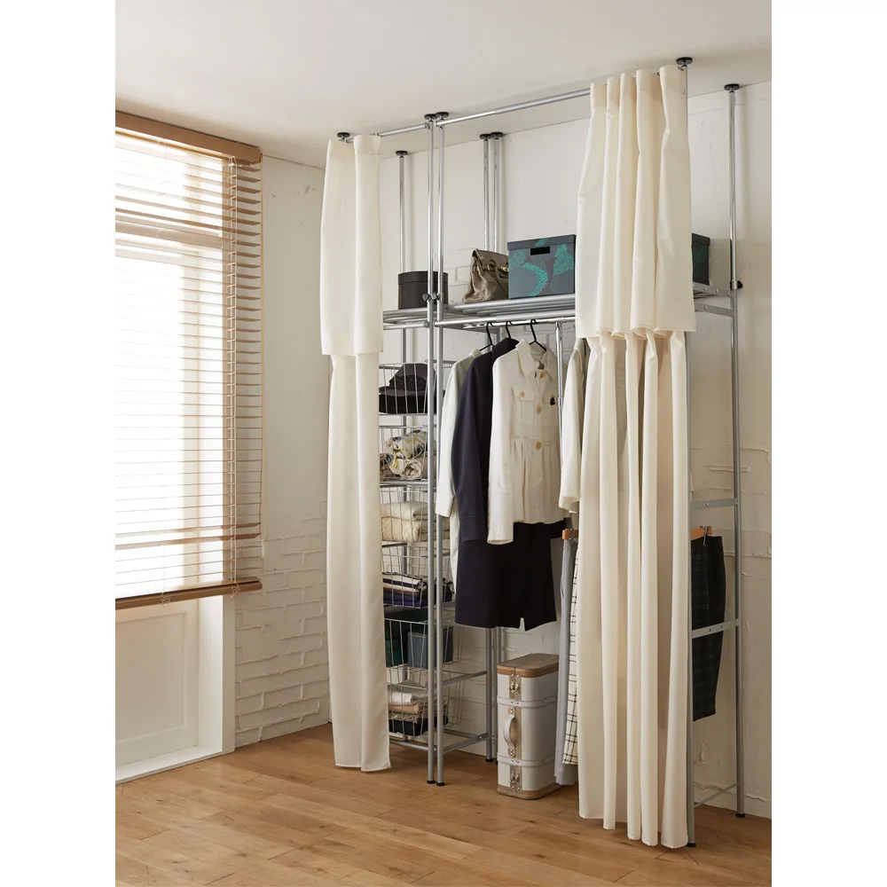 簡単にウォークインクローゼットが作れる突っ張り式ハンガーのバスケットタイプです。ついつい買って増えてしまうバッグや小物、雑貨類をきれいに分けて収納できます。ニットやカーディガンを畳んでしまうのにも便利です。対面やL字、コの字置きなど、自由に組み合わせることで間取りに合わせて大容量の収納空間もカスタマイズ可能。ロータイプは梁天井にも対応でき、ウォークインクローゼット内での使用もおすすめです。置くだけでウォークインクローゼットが叶う大型のハンガーラック●設置するだけで簡単に空いているお部屋をウォークインクローゼットにできる人気商品です。●幅・高さ伸縮のためスペースに合わせてぴったり設置することができます。●大型のハンガーラックをお探しの方におすすめのディノスで人気のハンガーラックです。●奥行43.5cmのため、省スペースにも設置でき圧迫感なく使用いただけます。小物収納に便利なバスケット●通気性の良いバスケットの引き出しはバッグや帽子、タオルなどの小物収納に便利です。●バスケットはスライド式で出し入れも簡単です。●中身が見えるワイヤーバスケットなので収納物がひと目でわかります。●ハンガー掛けでは型崩れしてしまう「セーター」などの編み物にもおすすめです。天井の高さに合わせてお選びいただけます●高さ「185cm〜243cm」の「ロータイプ」はバスケットの個数6個。●高さ「218cm〜277cm」の「ハイタイプ」はバスケットの個数7個。●突っ張りは4本別々に調整できるため梁の段差にも対応します。ホコリや日焼けから衣類を守るカーテン付き●ご自宅の洗濯機で洗える前面カーテン付きです。●カーテンでサッと目隠し収納ができます。●市販のカーテンに付け替えることができます。(※サイドカーテンは別売りです)リフォームより断然リーズナブルで、造り付け家具よりフレキシブル◆衣類収納のスぺパとコスパ両面ともに優秀な、ウォークイン突っ張りハンガーシリーズ。天井までの高さを生かせる大容量収納を、リフォームよりもぐっと低予算で実現できます。◆置き場所を変更したい時や引っ越しで環境が変わっても、何度でも設置し直してお使いいただけます。頑丈さに加え、暮らし方の変化にフレキシブルに対応できるから、長くお使いいただけます。