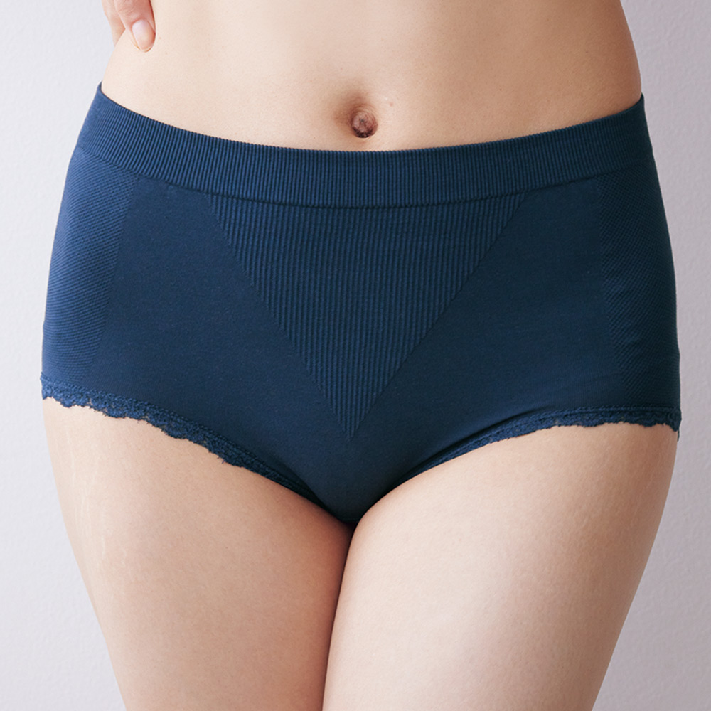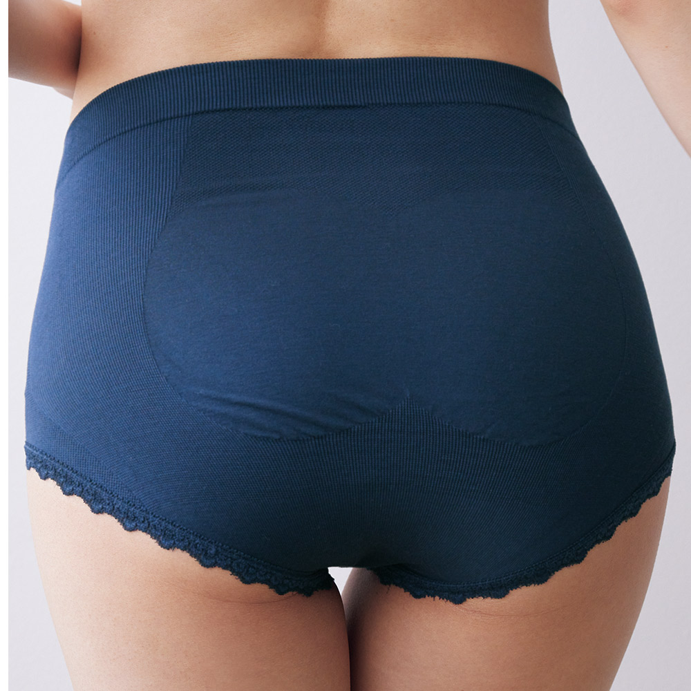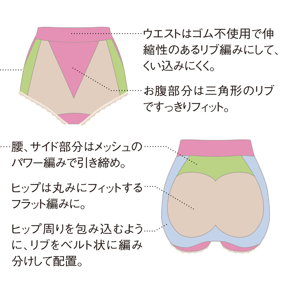 お肌にやさしいモダールコットン使用の深ばきすっぽりショーツ!ブナの木を原料に作られた天然素材「モダール」は、シルクのように滑らかな肌触りと光沢が特長。このモダール混コットンを立体編みで仕立てたショーツは、おしりを優しく包み込んで、まぁるく可愛く整えます。よく伸びるストレッチ素材だから、締め付けなくフィットする絶品のはき心地。【商品POINT】●ウエストはゴム不使用でおなかにくいこみにくい。●フロント中心の三角形リブがおなかにやさしくフィット。●クロッチはやわらかパイル生地で1枚編み立てなのでもたつきにくい。●お尻の丸みをつぶさない編み分け構造。☆ヒップ中心部はフラット編みで丸みにフィットする仕様に。☆ヒップまわりはリブ編みでサイドと下側から包むような設計。