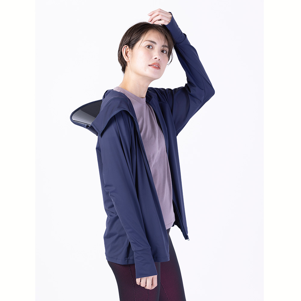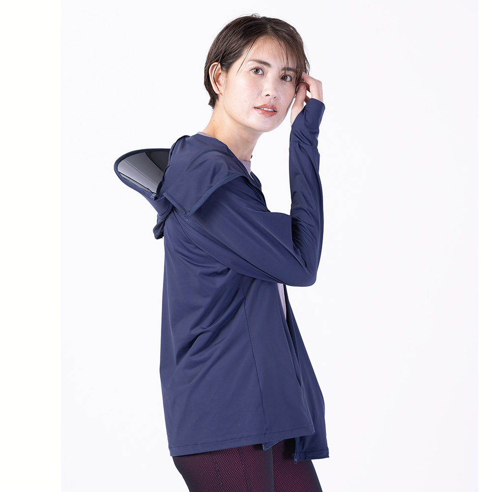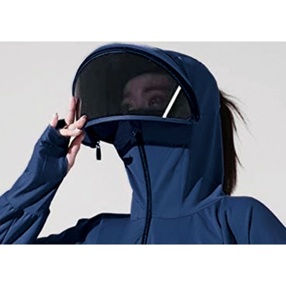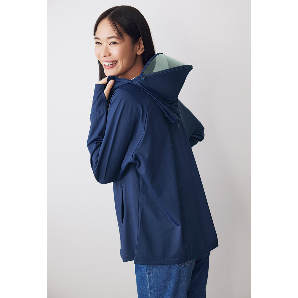 顔まわりは隙なく日差しをシャットアウト! バイザーはファスナーで取り外しOK。サムホール付きの袖仕様だから、手の甲から首元までしっかりカバー。 ネイビー コーディネート例