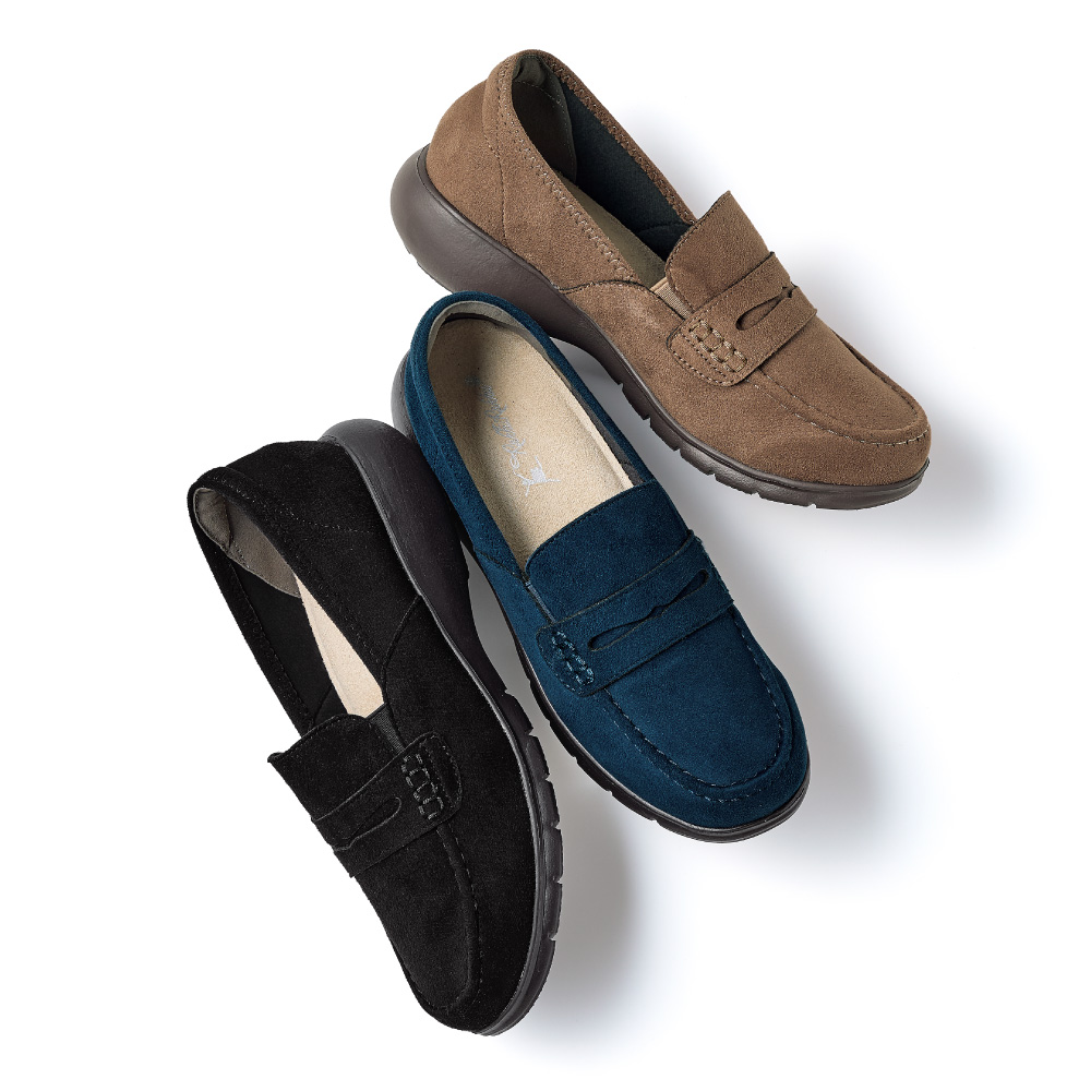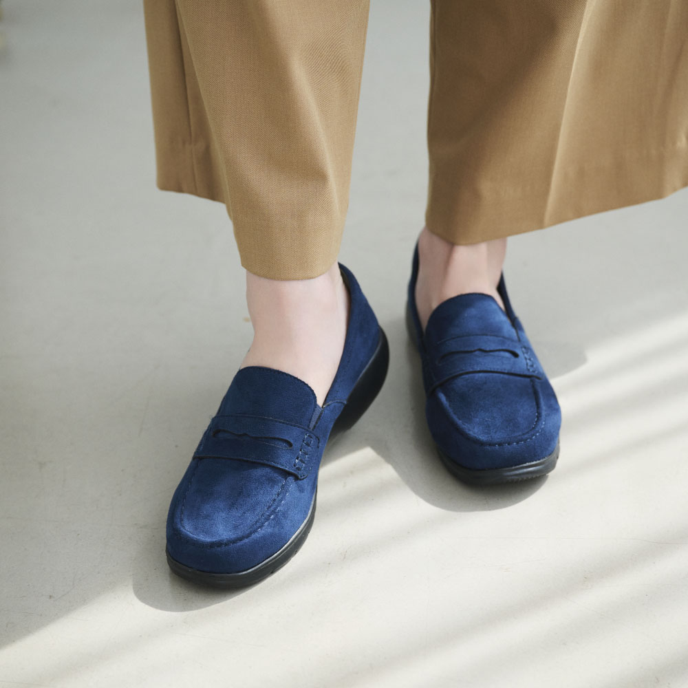 スエード調のローファーで足元から秋冬らしく。軽量はっ水で、さまざまな場面で活躍。オンでも履けるきちんと感のあるローファーが秋冬らしいスエード調素材で登場。タブのデザインでスッキリとした印象に仕上げました。ラックラックの機能はそのままにかかとにやわらかいクッションを搭載。長時間でもストレスなく軽やかに歩けます。