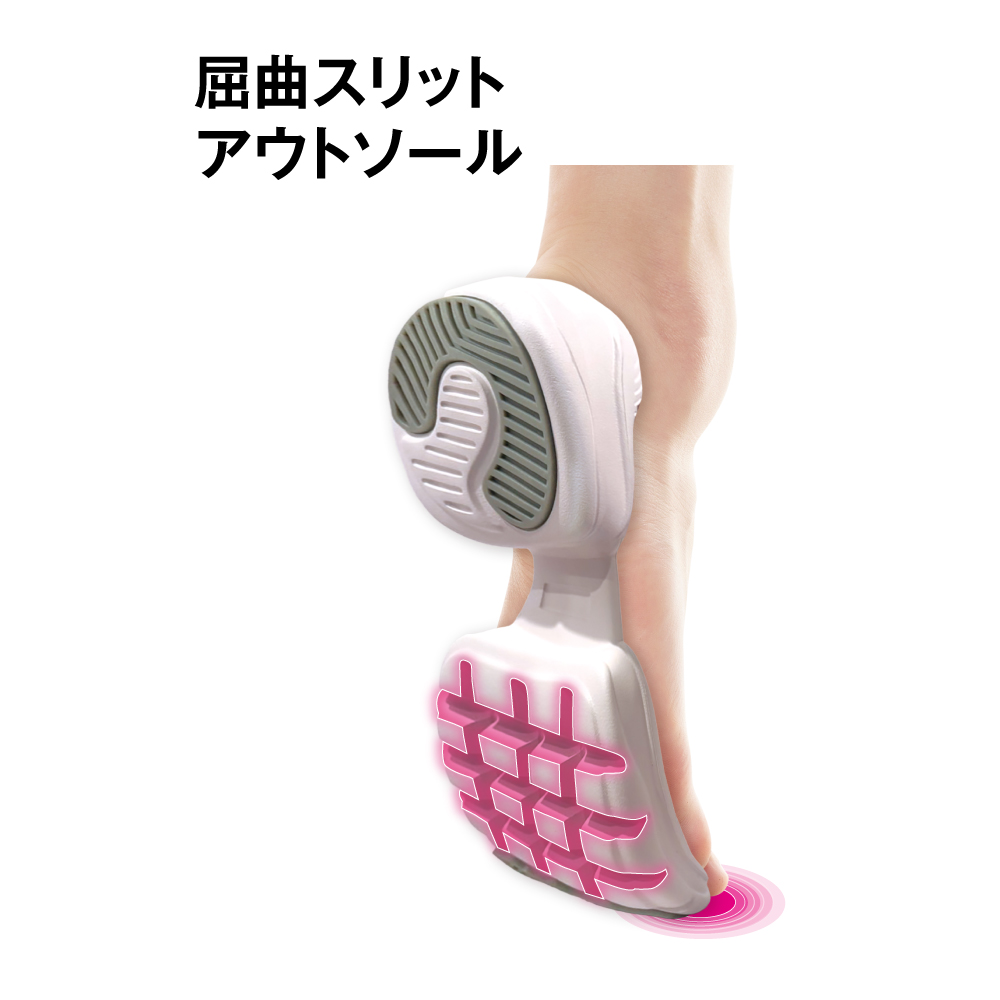 厚みを前後に分け、しっかり屈曲溝を入れることで歩行に合わせて曲がるように設計。