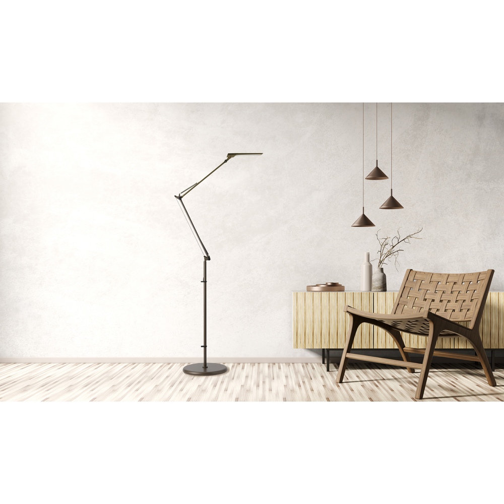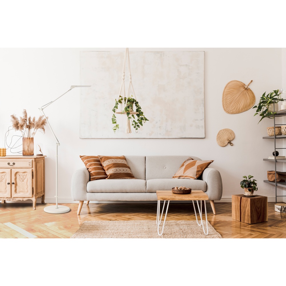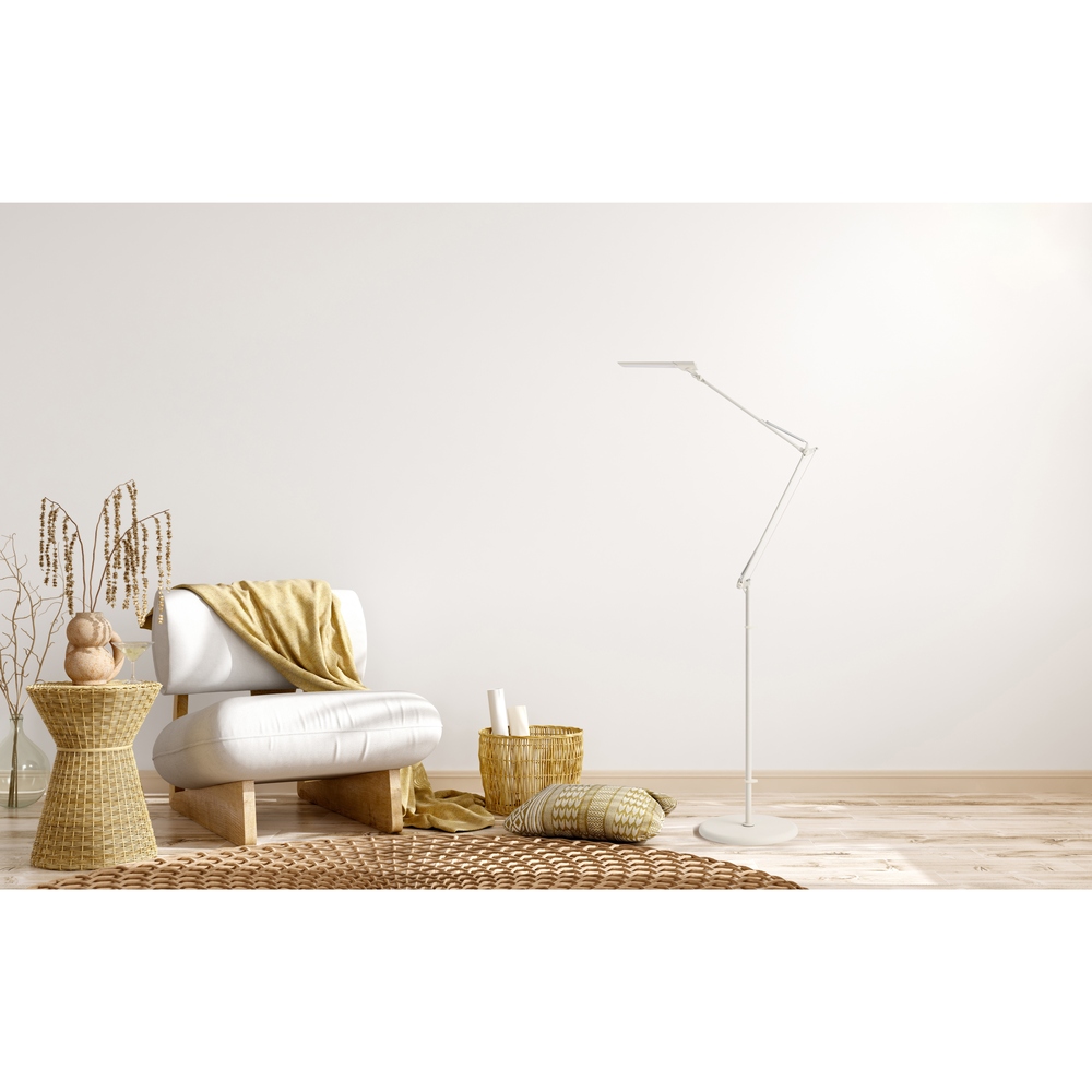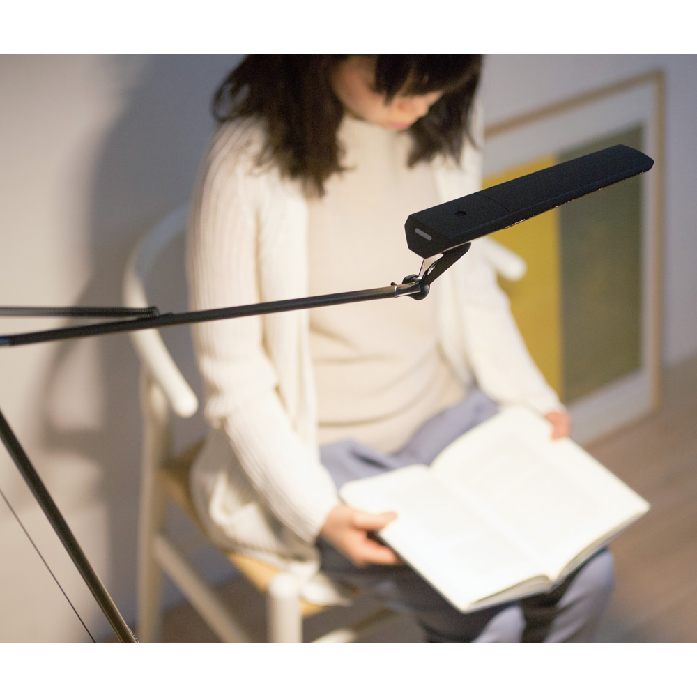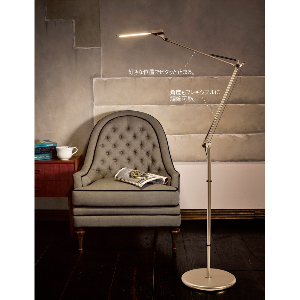 手をかざすだけでON・OFF、25パターンの調光・調色が選べる日本製LEDデスクライト。軽い力で自在に動かせるアーム設計で、ピンポイントで照らしたい場所をしっかりサポート。前回の明るさも記憶して再度調整不要。目にやさしい光で快適な作業空間を実現します。夜の読書や細かな手仕事のとき、「必要な部分だけを明るく、まぶしくない光で照らしたい」と感じることはないでしょうか。出会ったのが、自在に動いてピタリと止まるフロアライト《LED エグザームDIVA》。触れずにON・OFF、25パターンの調光・調色、前回設定を記憶する賢さ。しかも日本製のやさしい光です。ディノスだけの《シャンパンゴールド》は、明かりを点けていないときもインテリアとして美しい…その佇まいに心を奪われました。高精度アームで狙い通りに照射|軽い力でスッと動かしピタッと止まるアームは少ない力で滑らかに動き、狙った位置でしっかり保持。読んでいる本や手元作業を“スポット”で照らせます。床置きのフロアタイプなのでソファ横やデスク脇でも取り回し良く、角度・高さをフレキシブルに調整できます。25パターンの調光・調色×省エネ6.4W|白色5段階×明るさ5段階で目にやさしくヘッド側面のプッシュスイッチで色温度5段階(白色?電球色)と明るさ5段階を直感操作。作業は白色でくっきり、くつろぎは電球色でふんわり。合計25通りから“今の目にちょうどいい”光が選べ、省エネ設計で日常使いにも適しています。タッチレスON・OFF+メモリー機能|“触れずに操作、点けたらいつもの光”ヘッドのタッチレスセンサーに約5cmで手をかざすだけで電源を切り替え。衛生的でスマートです。明るさと色合いはメモリー機能が前回設定を再現。毎回の微調整が不要で生活のリズムに寄り添います。(コードを抜いた場合は再設定が必要です)上質デザインの安定設計|径30cm台座・最大高さ約155cm・約4kgで安心感支柱・台座はスチール、シェードはABS樹脂他。径約30cmの安定感あるベース、最大高さ約155cm、重さ約4kgで使い勝手良好。コード約1.8m・ACアダプター付きで設置もスマート。インテリアになじむ端正な佇まいです。日本製LED×限定色《シャンパンゴールド》|長く安心の品質と美しさ目にやさしい日本製LEDを採用。ヘッド一体型は交換不可ですが修理対応で長く愛用できます。カラーは《シャンパンゴールド(ディノス限定)》・《ブラッキーグレー》・《ホワイト》。点灯していない時間も絵になる上質感を大切にしました。ソファでページをめくる夜、手元だけが明るく、周りはほどよい陰影…“静かな集中”が生まれます。ダイニングでは料理本を白色で、食後は電球色に落として会話をゆったりと。在宅ワークでは画面の照り返しを抑え、書類にだけスポットを。ひとつのライトで「仕事モード」と「くつろぎモード」を丁寧に切り替える暮らしは、心地よいメリハリをもたらします。上質な《シャンパンゴールド》と賢い機能を、毎晩の灯りに。ぜひ一度、その“ちょうどよさ”を体験してみませんか。