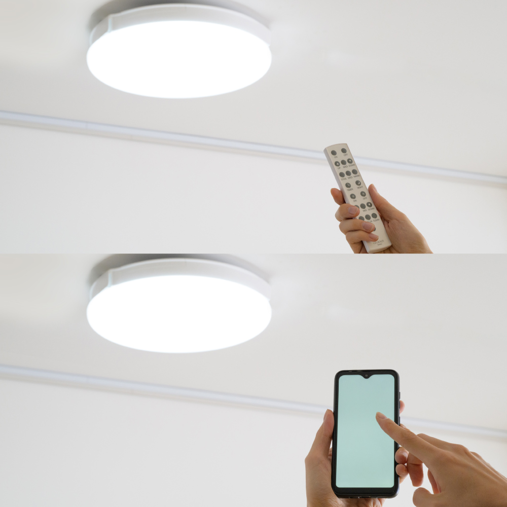 専用リモコンのほか、スマホやタブレット、AIスピーカーでも操作可能。調光、調色、タイマー機能など便利な機能が。