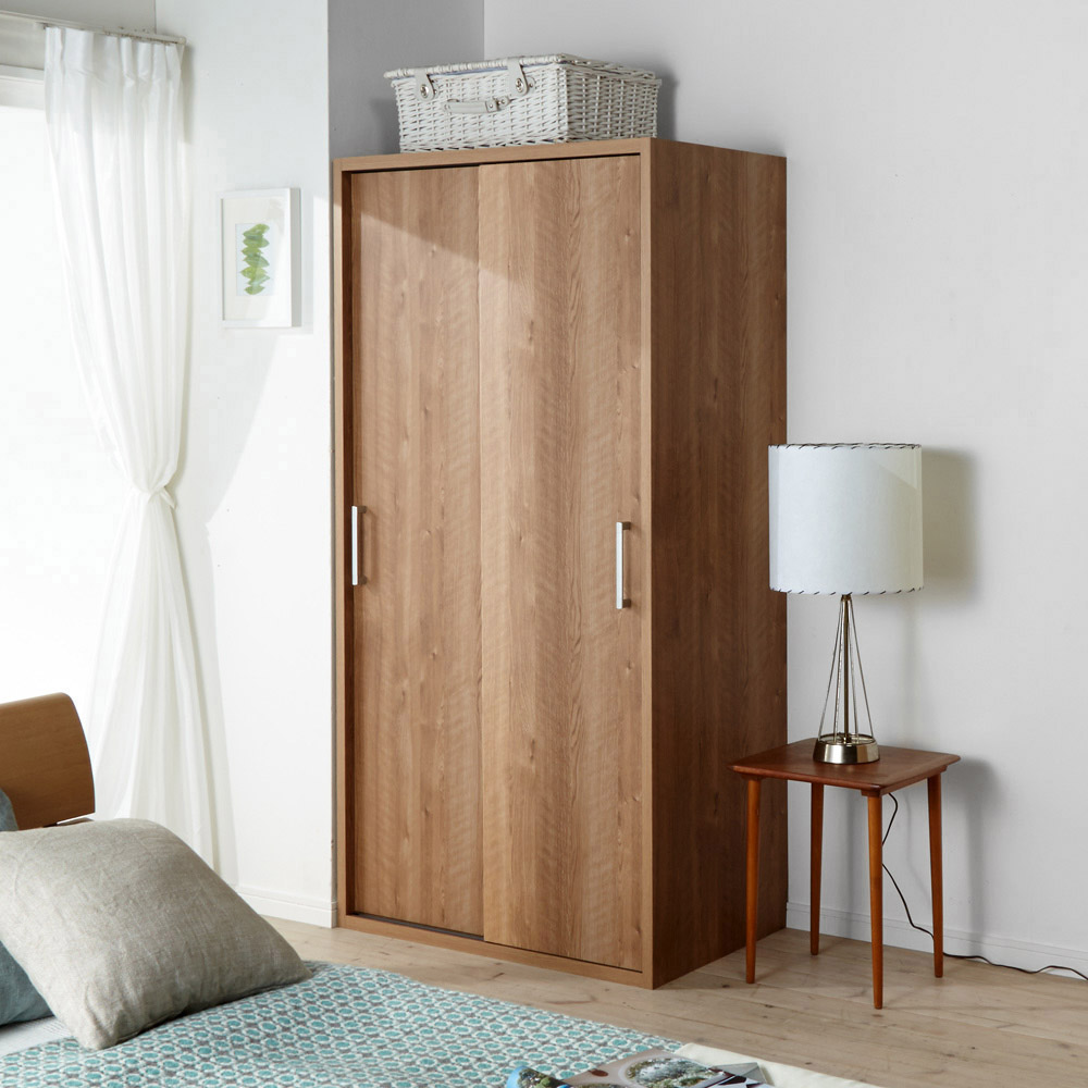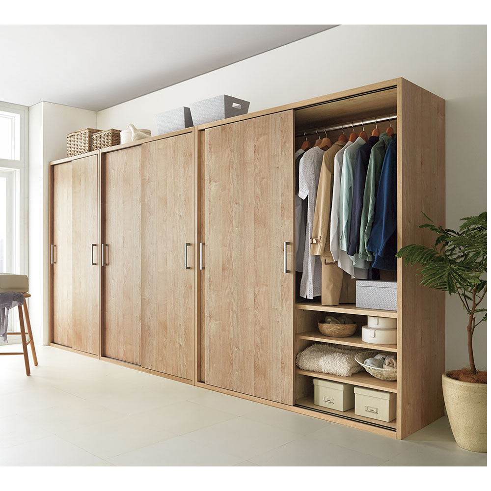 扉が前に出てこない寝室にも置きやすい引き戸を採用した衣類収納です。扉の開閉スペースが不要で狭い場所でも使える収納クローゼットです。ナチュラルモダンな木目調のナチュラル色とブラウン色の2色をご用意しました。お部屋のインテリアに合わせて、癒しのワードローブが作れます。大量収納できる北欧テイストのワードローブナチュラルモダンな雰囲気が魅力の収納クローゼットです。扉の開閉スペースが不要で置き場所を選びません。国内の工場で製造された国産家具なので安心してお使いいただけます。引き戸だから省スペースが実現扉が前に出ない引き戸なので、狭いウォークインクローゼットにもおすすめです。省スペースなので手前にベッドがある寝室の壁面でもお使いいただけます。開閉がスムーズなレール式スムーズに開閉するレール式の引き戸を採用しました。引き戸は滑車付きで滑らかにスライドできます。シンプルなデザインの取っ手すっきりした印象のアルミ製取っ手を採用。太い径の頑丈なハンガーバーでたっぷり収納できますハンガーバーは耐荷重20kgあり、多くの洋服を掛けられます。またバー下の高さは105cmで、ロングコートも掛けられます。扉の中央に仕切りがないので無駄な収納スペースがありません。高さ調整が可能な収納棚付き下部の棚4枚は、3cm間隔での高さ調整と取り外しが可能です。ワンピースやパンツなどたたむ収納や、奥行があるのでバッグなども収納できます。コーディネート例木目調がおしゃれな北欧風デザイン明るくやさしい色合いでどんなインテリアにもなじむナチュラルと、落ち着いた大人な印象でウォルナットなど濃い色の家具と相性がよいブラウンの2色をご用意しました。