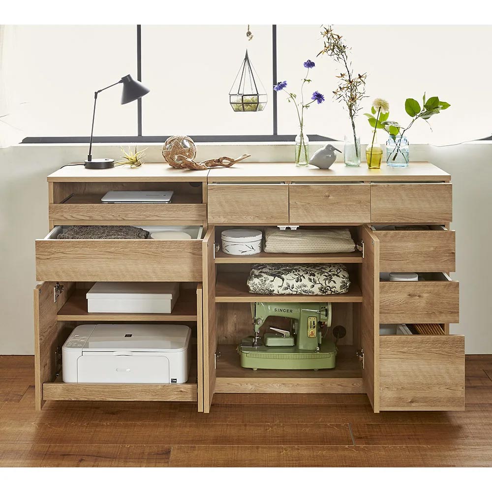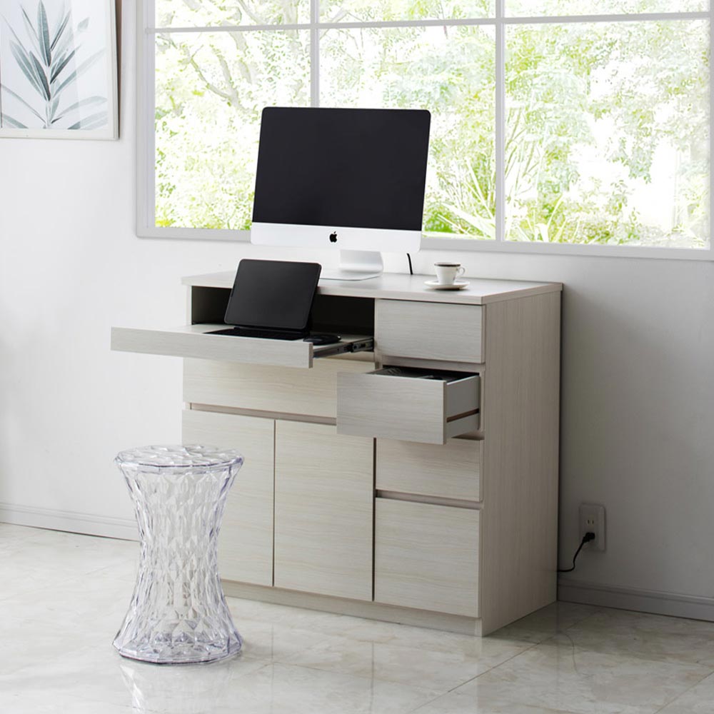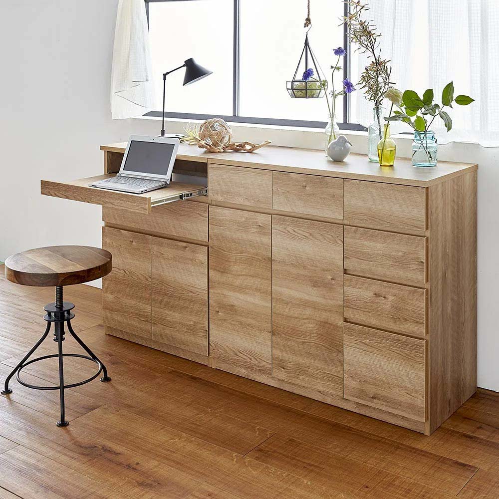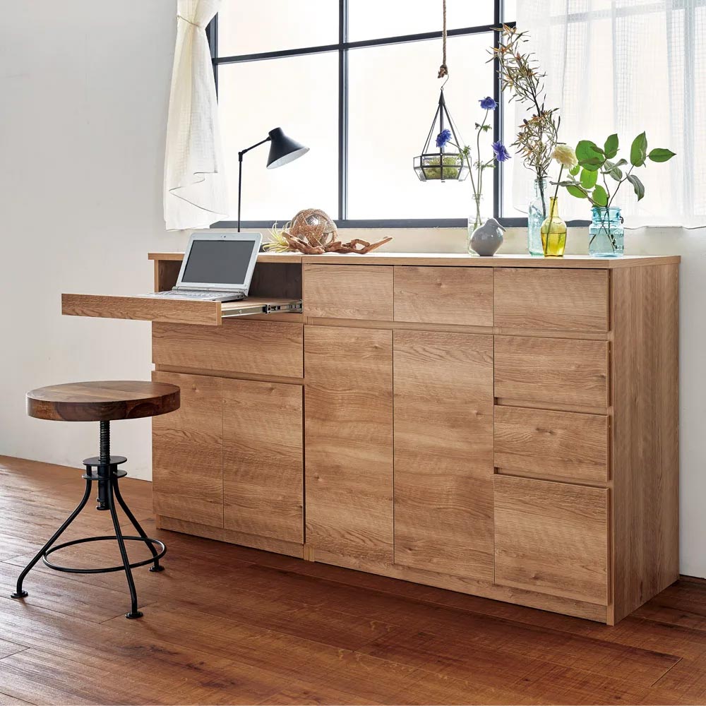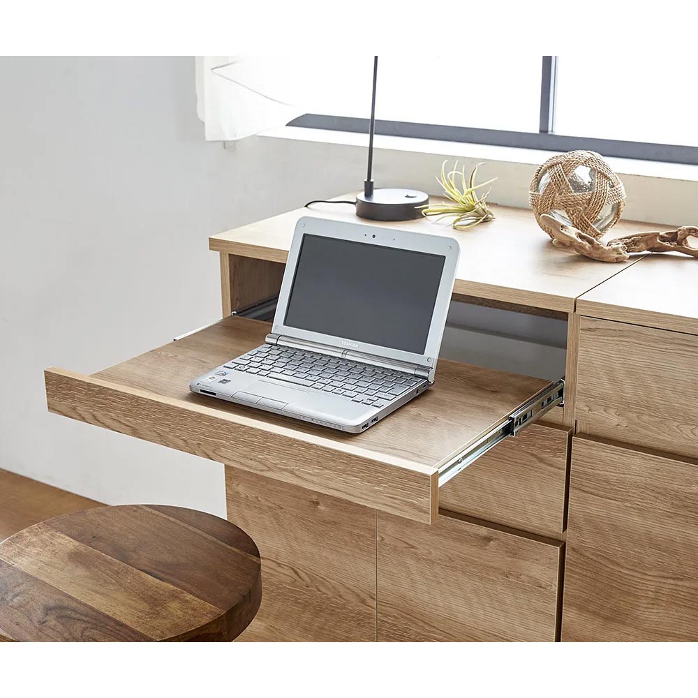 カフェでのひとときを思わせるやすらぎのワークスペースをご自宅に。ラフな素材感が楽しめる、天然木調のナチュラルな風合いで、パソコン作業も心地よく。リモートワーク、在宅勤務、テレワークでの利用にもぴったりのパソコンデスクです。リビング周りの家電類は、まとめてこの1台にスライドトレー部にノートパソコンを収納。キーボードを収納して、デスクトップ型にももちろん対応。扉部にはプリンターが収納できます。プリンター収納部もスライドトレー式。スキャナー使用や紙の補充もストレスなく。可動棚板部にコピー用紙や補充インクカートリッジを収納すれば、周辺機器もまとめて片付きます。引き出し部には、普段使いの筆記用具や、メモリ・スマホの充電ケーブルなど細々したモノの収納に重宝します。北欧風のあたたかみあふれるデザインリビング小物や家電類はすっきり収納、PCワークも心地よく。あたたかみのあるブラウン、明るい空間を演出するナチュラル、清潔感のあるホワイト木目の3色をご用意。お部屋のイメージに合わせてお選びいただけます。こだわりの機能で、PCまわりもスッキリ片付きますルーターや電源タップは背面に収納。上下段の家電と内部配線できます。天板後方には、コード通し穴があり、壁にぴったりつけられます。扉内のオープンスペースは配線用コード穴付き。オープン部は可動棚板が1枚付属します。扉部はプッシュオープン式。突起が無くスッキリした印象に仕上げました。安心で造りもしっかり。安心の国産家具管理の行き届いた日本国内の木工所にて、一つ一つ丁寧に仕上げております。本体は、届いたらすぐ使えるのが嬉しい完成品でお届けします。集い、語らい、くつろぐひとときを、味わい深い家具と共に、ぜひお過ごしください。