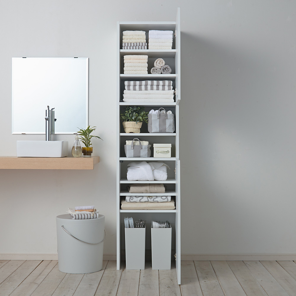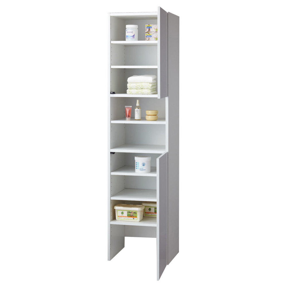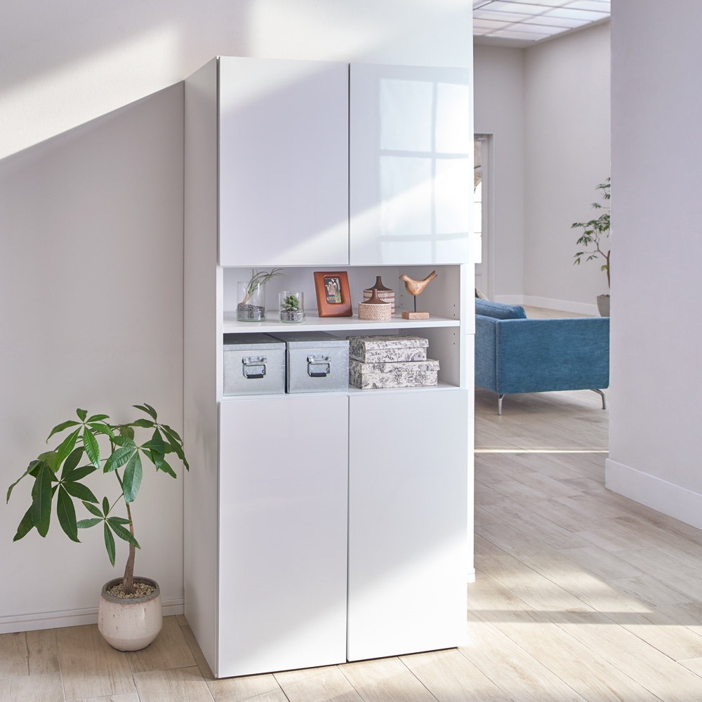 洗面所や脱衣所の収納しにくいものや、外に出しっぱなしにしがちなものをすっきり隠せる快適収納庫。底に板がないので掃除機やランドリーバスケットも持ち上げずにスッキリ収納できます。6枚の棚は収納物の大きさに合わせて自由に調整できます。光沢感が美しい収納庫。多彩な収納力で様々なものがスッキリ入ります。●収納物のサイズに合わせて分類して収納できる洗面所収納です。●幅30cm、45cm、60cm、80cm、奥行は35cmと45cmからお選びいただけます。●床に板がないので、掃除機等の洗濯かごなど収納しにくいものの出し入れもスムーズです。●可動棚は6枚付き。収納したいものの大きさに合わせて高さが調整できます。●扉を閉めるとすっきり美しい光沢仕上げ。清潔感があるので、お部屋が明るくなります。収納棚の高さが変えられるからレイアウト自在。お好みの収納庫が作れます。■洗面所の収納庫として・家族のタオルからお風呂上がりの衣類までたっぷり収納できます。・洗面台に収納しきれない化粧品やコンタクト、ティッシュなどのストック類もたっぷり入ります。・床にゴミ箱や掃除機がそのまま置けて、扉ですっきり隠すことができます。■ランドリーや脱衣所の収納庫に・市販の洗濯カゴ(ランドリーバスケット)が置けて扉で隠せます。・棚板の高さを調整して、背の高いボトル洗剤やハンガーが収納できます。■リビングの収納スペースとして・アイロン台やミシンなどのリビング用品を見やすく整理収納できます。・中央部分がオープンなので飾り棚のように美しくディスプレイすることもできます。