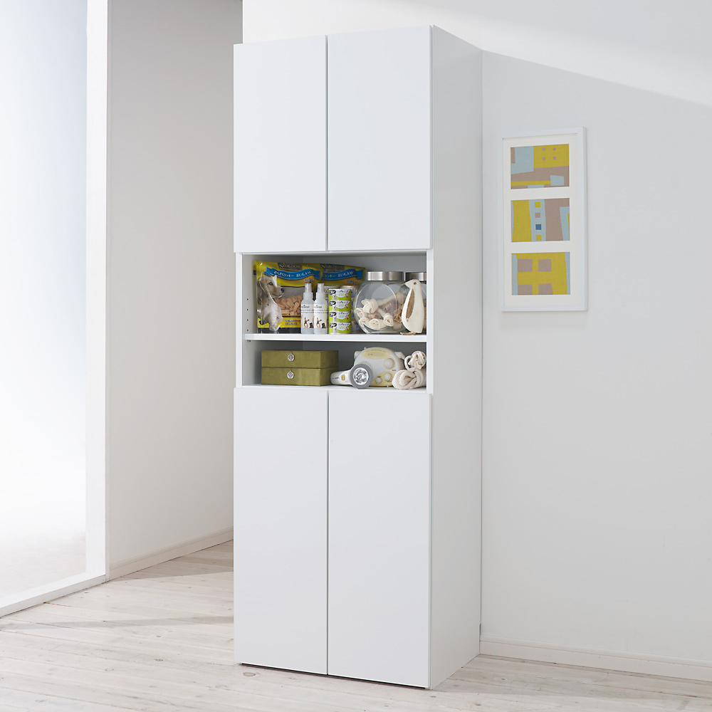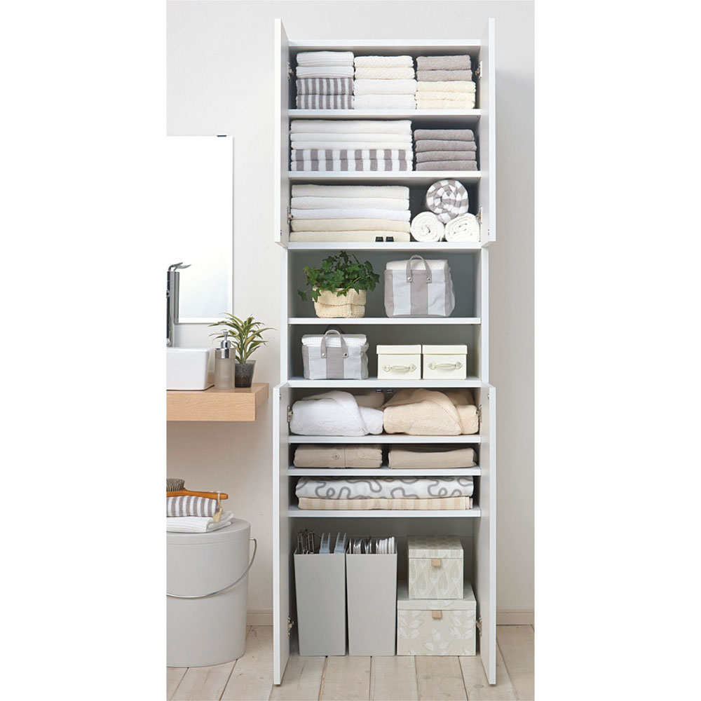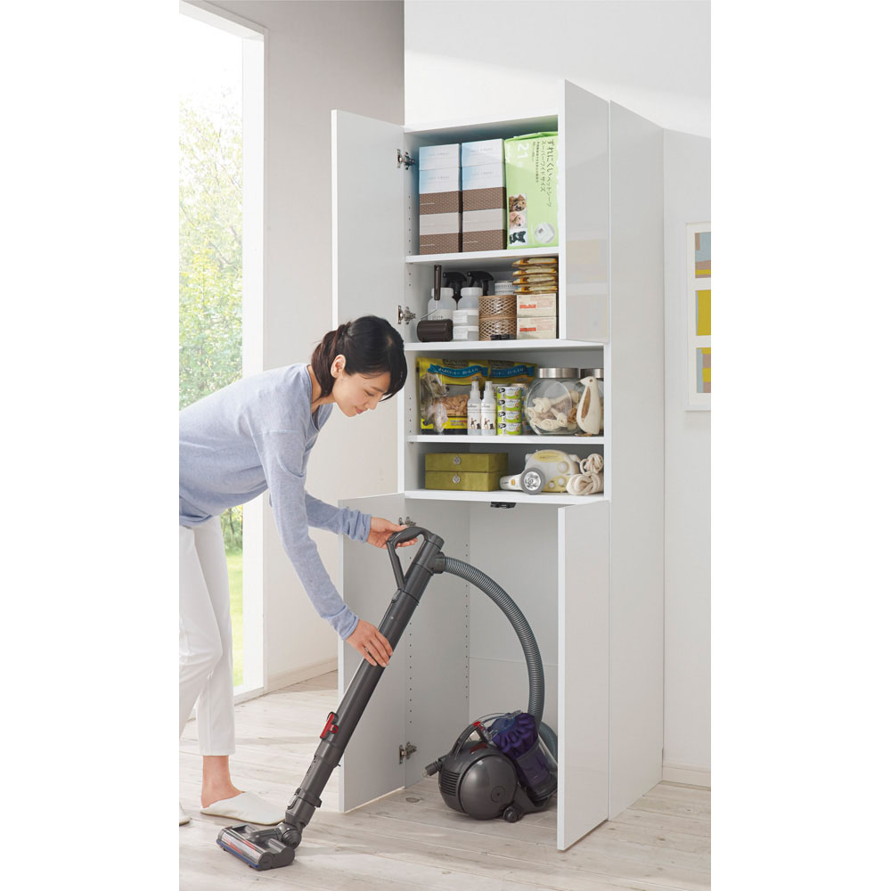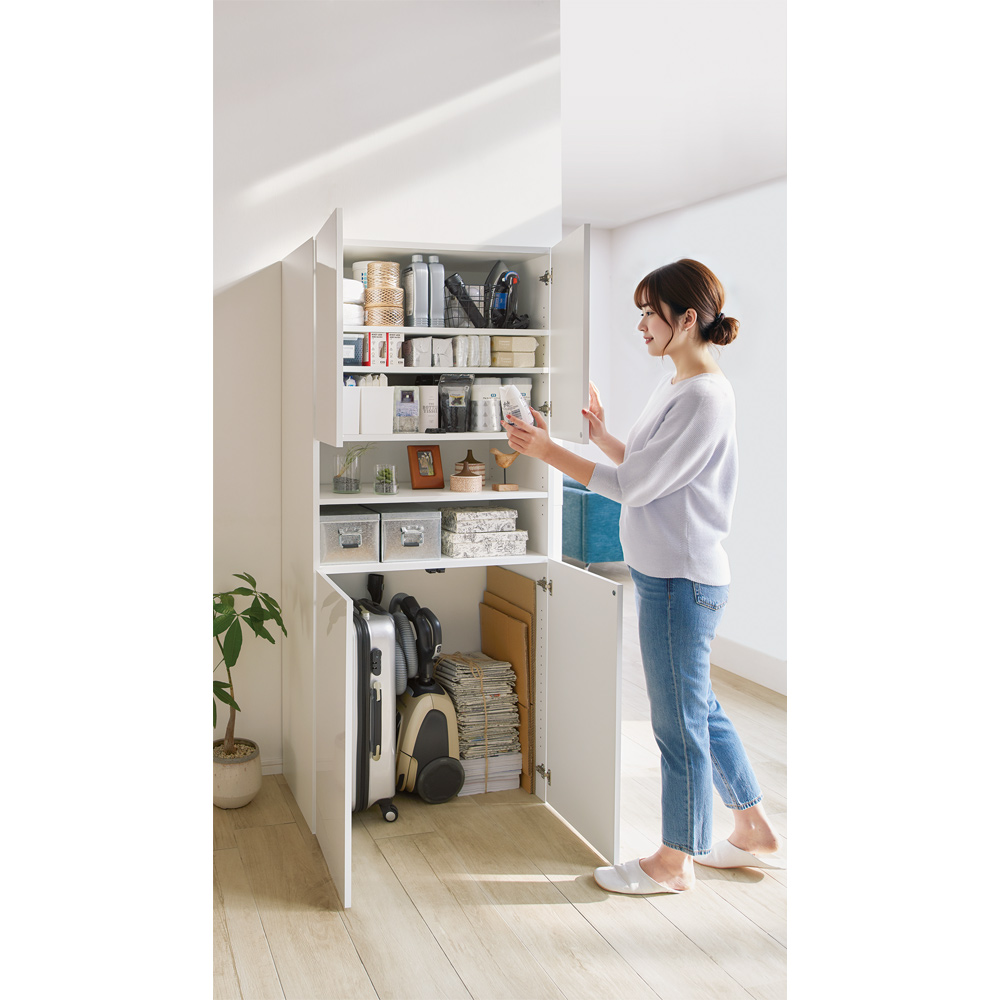 洗面所や脱衣所の収納しにくいものや、外に出しっぱなしにしがちなものをすっきり隠せる快適収納庫。底に板がないので掃除機やランドリーバスケットも持ち上げずにスッキリ収納できます。6枚の棚は収納物の大きさに合わせて自由に調整できます。光沢感が美しい収納庫。多彩な収納力で様々なものがスッキリ入ります。●収納物のサイズに合わせて分類して収納できる洗面所収納です。●幅30cm、45cm、60cm、80cm、奥行は35cmと45cmからお選びいただけます。●床に板がないので、掃除機等の洗濯かごなど収納しにくいものの出し入れもスムーズです。●可動棚は6枚付き。収納したいものの大きさに合わせて高さが調整できます。●扉を閉めるとすっきり美しい光沢仕上げ。清潔感があるので、お部屋が明るくなります。収納棚の高さが変えられるからレイアウト自在。お好みの収納庫が作れます。■洗面所の収納庫として・家族のタオルからお風呂上がりの衣類までたっぷり収納できます。・洗面台に収納しきれない化粧品やコンタクト、ティッシュなどのストック類もたっぷり入ります。・床にゴミ箱や掃除機がそのまま置けて、扉ですっきり隠すことができます。■ランドリーや脱衣所の収納庫に・市販の洗濯カゴ(ランドリーバスケット)が置けて扉で隠せます。・棚板の高さを調整して、背の高いボトル洗剤やハンガーが収納できます。■リビングの収納スペースとして・アイロン台やミシンなどのリビング用品を見やすく整理収納できます。・中央部分がオープンなので飾り棚のように美しくディスプレイすることもできます。