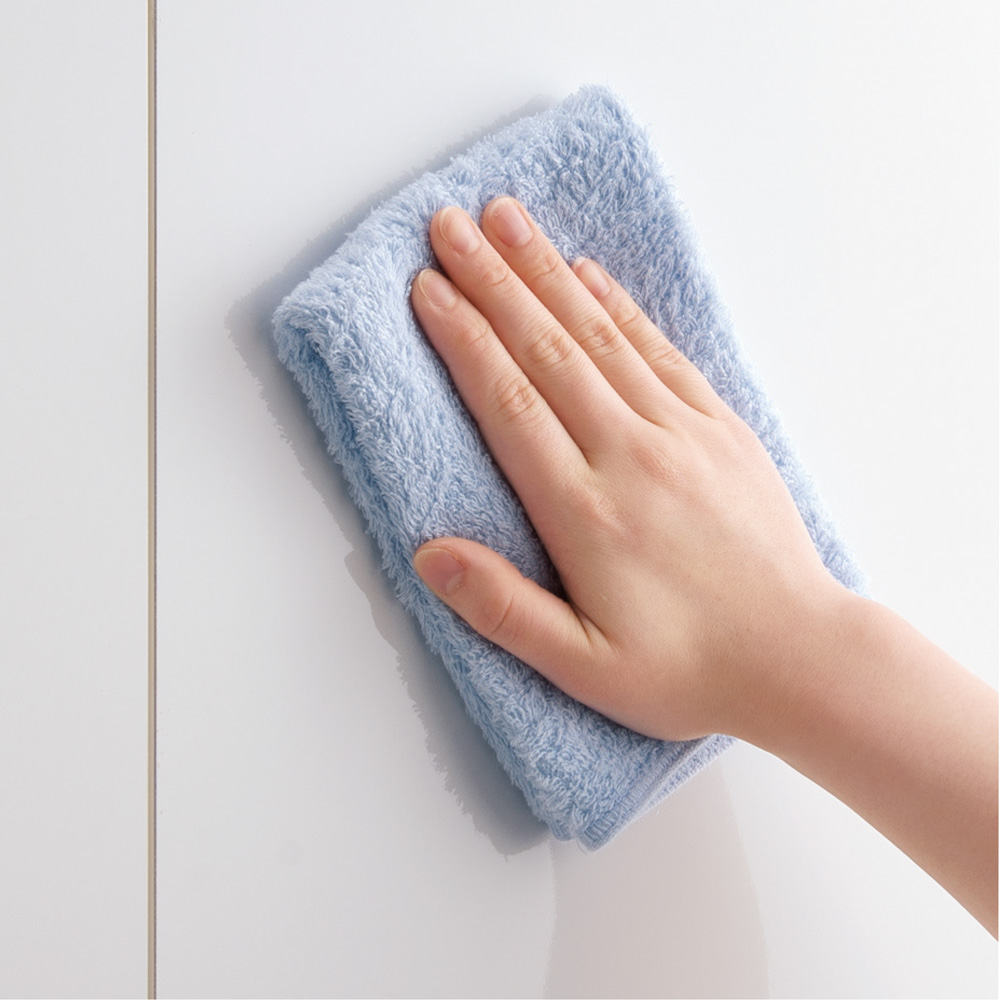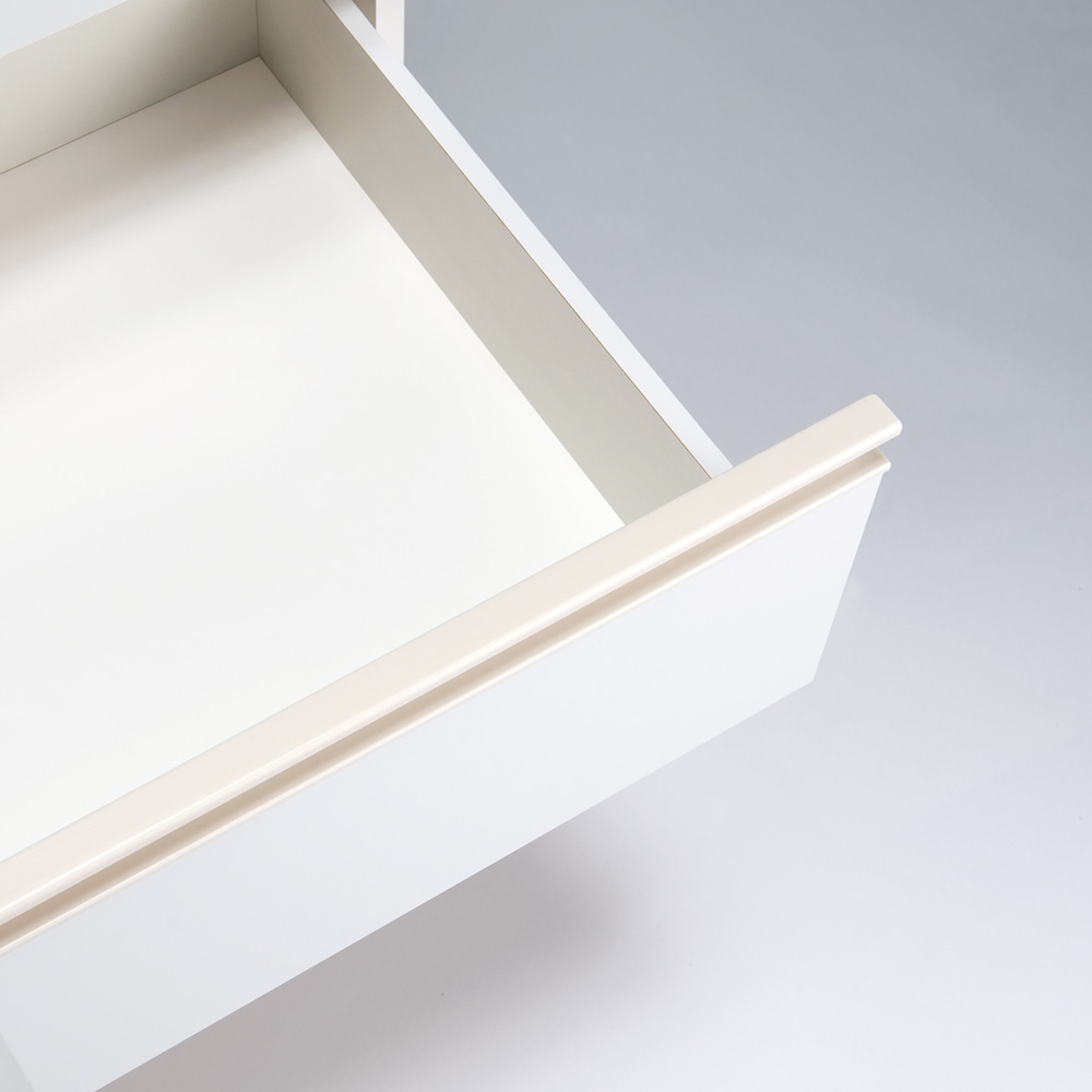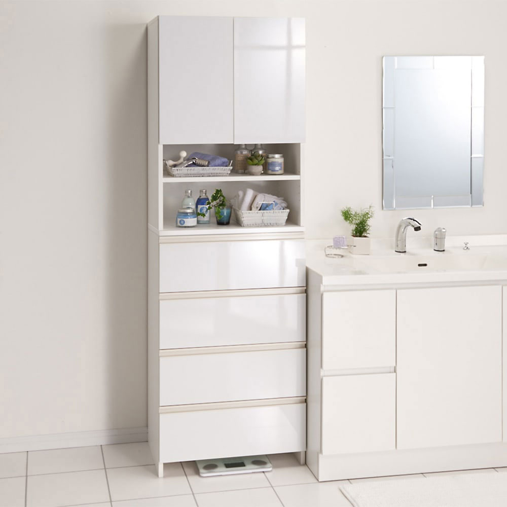 洗面台脇にもぴったり馴染む。扉・引出しを閉じれば清潔感あふれる光沢感が際立ちます。