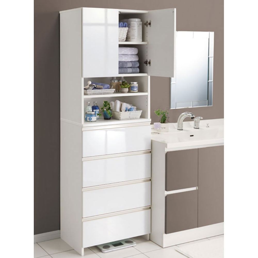薄型の31cmから51cmまで10センチ刻みで奥行が選べるサニタリー収納庫。収納力たっぷりの引出しは大判バスタオルや大きめの家電もしっかり入るサイズです。ご自宅に着いてからすぐに使える完成品でお届けいたします。サイズ豊富でスペースに合わせてぴったり設置が実現●幅は45cm、60cm、75cm、奥行は31cm、41cm、51cmから選べるので 狭い脱衣所や洗面所、洗面台脇の隙間など場所を問わずに収納場所をつくることができます。●奥行31cmの引出しはタオルや小物がコンパクトにしまえるサイズ、 奥行41cmはバスタオル、美容家電がすっきり入るサイズ、 奥行51cm大判バスタオルやドライヤー、衣類が入るサイズです。●上の扉収納は3cm間隔で調整できる収納棚付きなので、 高さを合わせながらシャンプーやストック類をきれいに隠して収納が出来ます。●真ん中のオープン部分はよく手に取るタオルや小物類をしまう場所として、 着替えやパジャマを置く脱衣所のちょい置き場としてお役立ちします。●本体下はスペースがあるので体重計やスリッパをしまう場所として便利です。細部までこだわったアイデア溢れるランドリーシェルフ●前面は水に強い素材なので洗濯機・脱衣所周りでもリネン庫として安心して使えます。●扉はワンタッチで開け閉めができるプッシュ式です。●扉・引出しの中は全て内部化粧をしているので中の物を清潔に保ちます。●引出しは全てスライドレール付きなので開閉しやすくスムーズです。●側面・天板はすり傷や汚れに強いクリーンイーゴスを使っているので水周りでもお手入れらくらくです。●洗練された光沢デザインが美しい安心・安全の日本製家具です。リビング・ダイニングの収納チェストとしても●アイロン、ミシンや散らばる小物など、収納場所の困るリビング用品を隠してすっきり収納できます。●真ん中は可動棚付きのオープン部なので、好みの物を美しく飾るディスプレイラックとして見せる収納を楽しむことができます。●普段は収納に困る取扱説明書や郵便物、書類関連も幅・奥行に合わせてきれいに収納ができます。