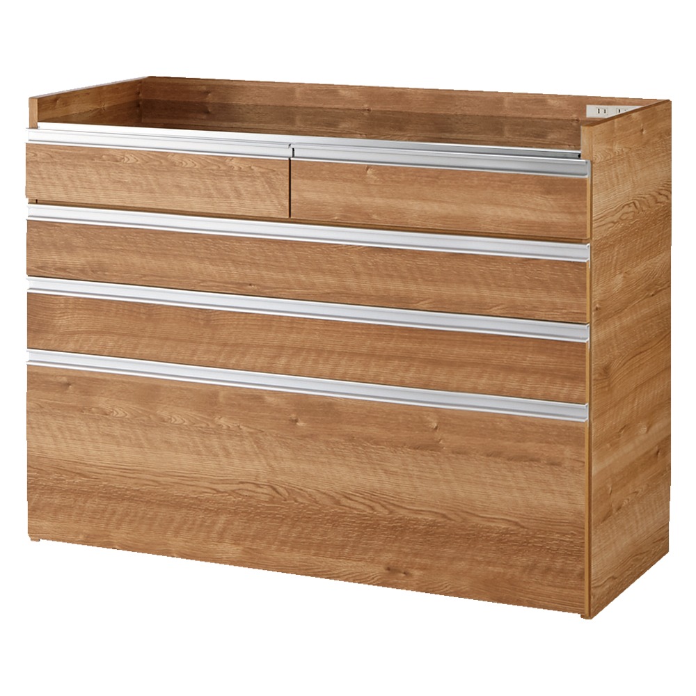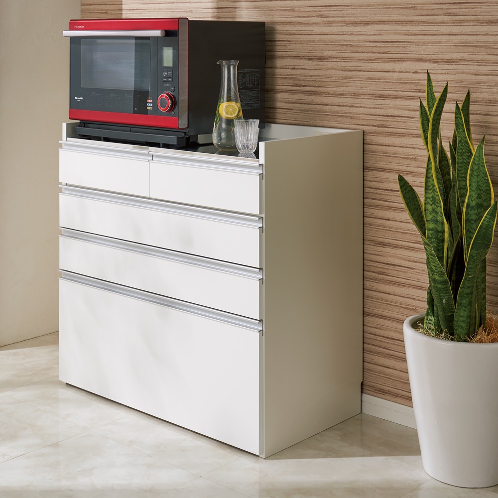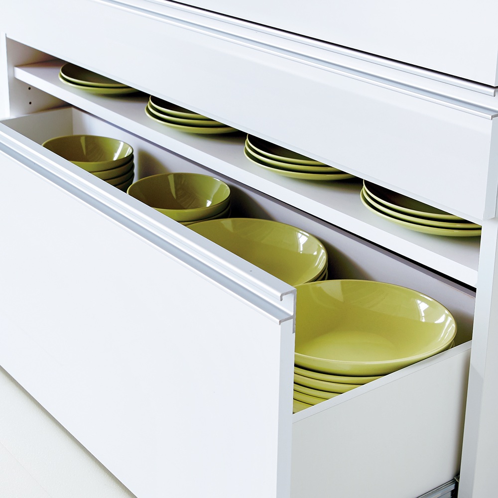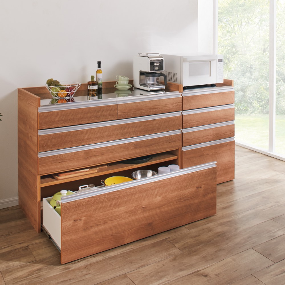 整理収納もお手入れもしやすいモデルルームのようなキッチンに。大きさや形の異なる調理道具をすっきり、使いやすく収納。汚れてもお手入れしやすいから、いつも清潔に気持ちよく使えます。明るく清潔なキッチンを簡単に 大型レンジ対応ステンレスクリーンキッチン 大型レンジもすっきり収まる家電収納シリーズ。オープン部の奥行内寸が45cmで大型レンジはもちろん、大容量収納できる食品庫としても魅力的なアイデア収納です。モダンでシンプルな見た目でおしゃれなキッチンをかなえつつ、収納しやすい小ワザやお掃除ラクラクの秘密もたくさん隠れているカップボード・食器棚です。大型スチームレンジ対応!奥行内寸45cm◆置き場所に困ってしまう大型スチームレンジ。◆大型スチームレンジは通常のレンジに比べ奥行が広く、普通のレンジ台には収まらないことも。◆このシリーズの家電ラックはステンレス天板部分の奥行内寸が45cmと広々。諦めていた大型レンジも収まる心強い家電台です。◆もちろんコンセント付きでレンジラックとしてはもちろん、コーヒーメーカーなども。◆レンジ、トースター、炊飯器、ホットプレートなど巣ごもりの季節に増えるキッチン家電は全てこれ1台にまとめて収納できます。整頓しやすい引き出しの秘密で誰でも収納上手に。◆引出し5杯の小分け収納で、何かと大きさがバラバラなキッチン用品を小分け収納でき、食品ストッカーとしても優秀。◆最下段の引き出しにはさらに整頓のためのキッチン収納術が。◆最下段はフルスライドレールで奥まですっきり見渡せ、さらに引き出し内部に可動棚を設置。◆深引き出しの中を2段使いすれば、空間を無駄なく活用できて収納力アップ!◆可動棚を外せば2Lペットボトルなど背の高いものも収納できますのでお好みに合わせてカスタマイズして、自分ぴったりのキッチンストッカーに。◆空間を無駄にしない棚づかいで、狭いキッチンにもピッタリ。ステンレス天板で清潔、明るいキッチンに◆キラリと光るステンレス天板は、汚れやすい台所の味方。水や汚れに強く、さっと拭いてお手入れ簡単。◆ステンレス天板部までの高さは85cmで、作業台としても使いやすい高さです。◆家電置きスペースとしてはもちろん、調理台としてお使いいただくにもピッタリです。いつまでもきれいに、適材適所の素材選び◆長くきれいにお使いいただくために、素材選びのもこだわったキッチンカウンターです。◆引き出しや扉内部には、汚れと傷に強いクリーンイーゴスを採用。油や輪染みも簡単に拭きとれる素材です。安心と信頼の職人技が光る国産のキッチン収納庫◆熟練の家具職人がひとつずつ丁寧に仕上げたワンランク上のダイニングボード・キッチンラックです。◆細部の丁寧な仕上がりなど日本製ならではの高品質なキッチン収納棚をお楽しみください。
