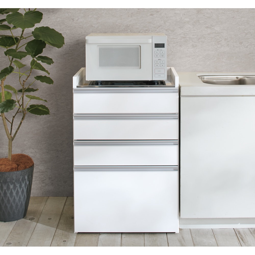 (ア)ホワイト 天板の奥行内寸45.5cmで大型レンジもはみ出さず収納。 ※写真は幅90cmタイプです。