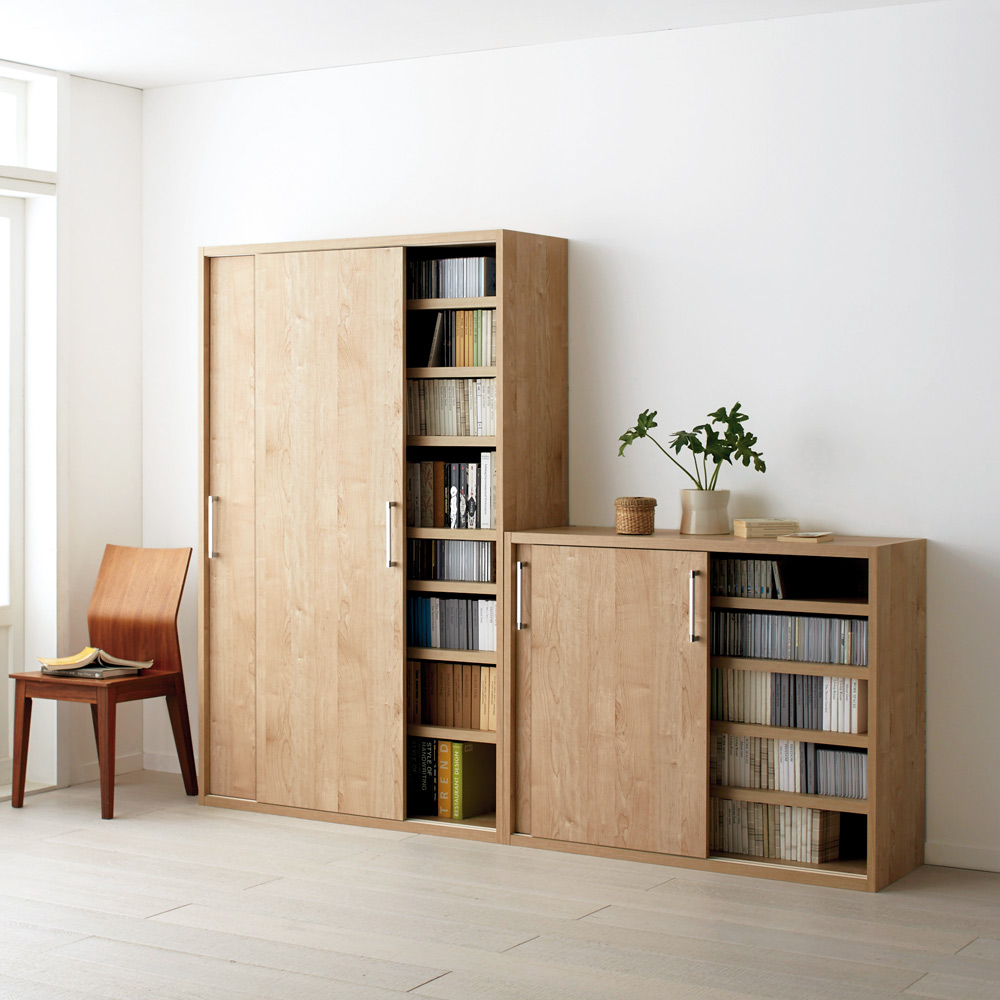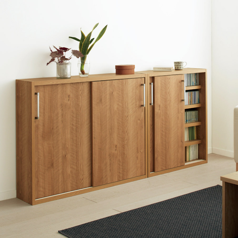 人気の天然木調引き戸本棚のロータイプ。増え続ける本を大量収納できる頑丈さが自慢。収納物をやさしい色合いで包み込みながら、開閉に場所をとらない引き戸式で、省スペースで設置できます。〜優しい色合いと木目調が魅力〜開閉に場所をとらない引き戸式の本棚です。頑丈棚板で、省スペースで大量収納できる木目調本棚がリビングや書斎、オフィスを彩ります。あたたかみと味わいを感じるブラウンと、明るく開放感のある色合いのナチュラルで、北欧調の柔らかな雰囲気に。【POINT 1】「本を快適にしまう」ための機能◎軽い力で開閉する引き戸書棚引き戸の裏側に下部に車輪が付いており、引っかかることなく軽い力でスムーズに開閉できます。扉付なので本を日焼けや埃から守ります。シルバーの取っ手もアクセントになります。◎棚板耐荷重約20キロで頑丈なつくり頑丈な棚板を採用。雑誌・文庫本・コミック・CD・DVDはもちろん、蔵書や写真集、アルバムなどの重い本も安心して収納していただけます。【POINT 2】省スペースにも置きやすいスリム設計◎使用時も場所をとらない引き戸引き戸で薄型デザインのため、狭い場所でも使いやすいブックシェルフです。廊下や子供部屋、ダイニングや寝室などの限られた場所にも設置できる設計です。【POINT 3】国産ならでは丁寧な仕上げ◎安心の日本製安心の国産商品。国内の職人が心を込めて丁寧に仕上げている国産家具です。[ラインナップ]◎色ナチュラル…明るくやさしい色合いでどんなインテリアにもなじみます。ブラウン…落ち着いた大人な印象。ウォルナットなど濃い色の家具と相性がよいです。◎サイズロータイプ(高さ90cm)窓下の設置におススメです。圧迫感がなく、お子様のお部屋に置いて教科書を収納するのも◎ハイタイプ(高さ180cm)更にたっぷり収納できるハイタイプで、壁一面に本を収納ができる壁面収納としてもお使いいただけます。奥行40cmタイプはレターボックスも収納できるので、オフィスでの使用にもおすすめです。