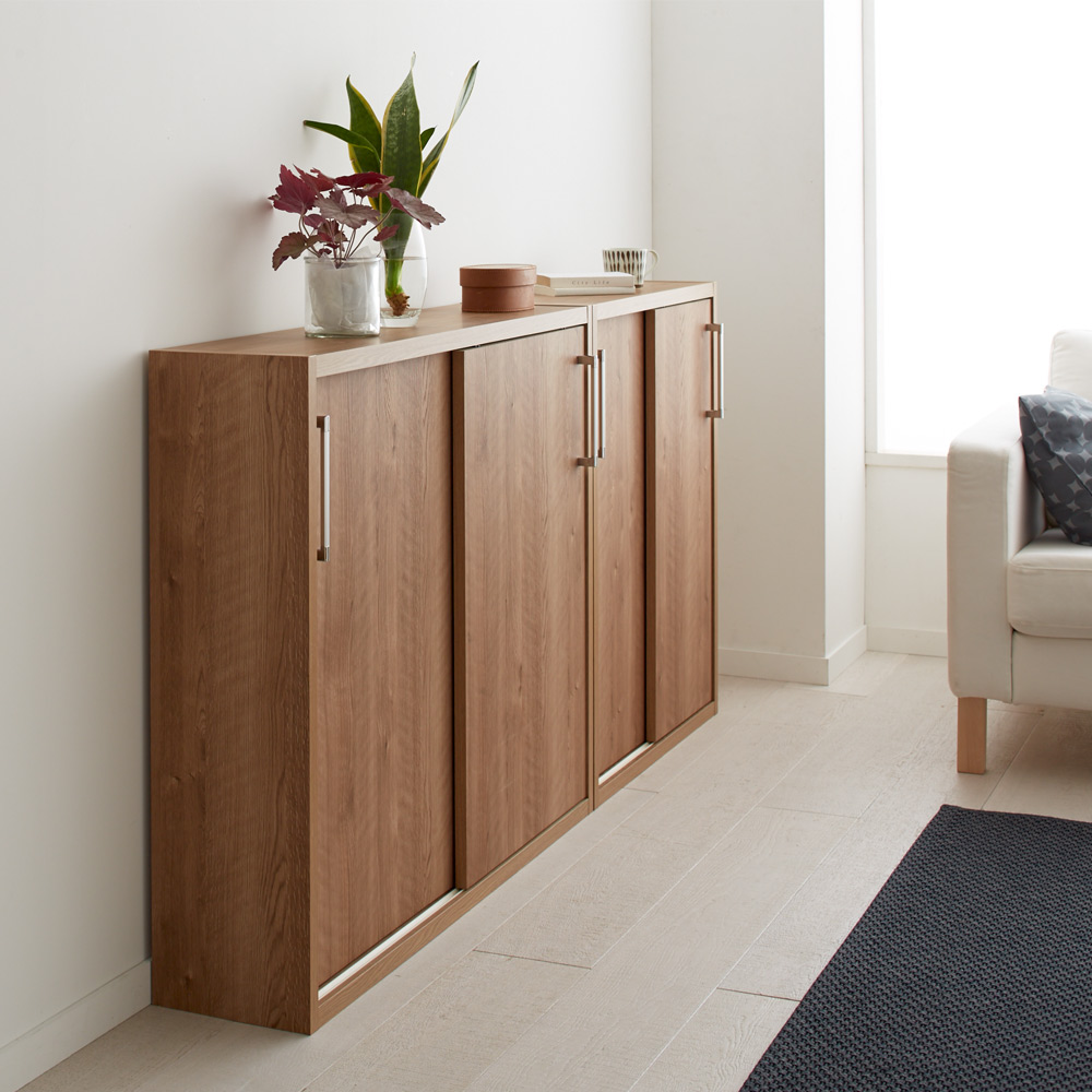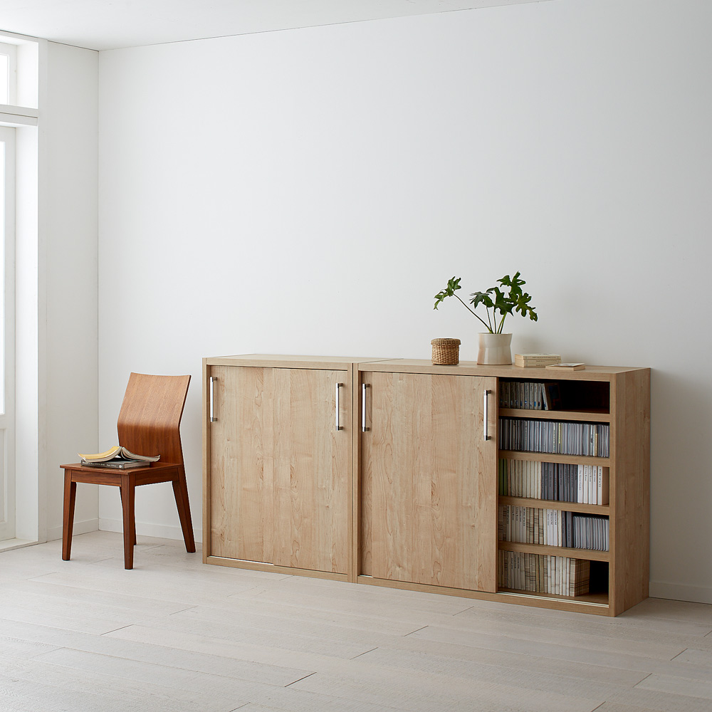 人気の天然木調引き戸本棚のロータイプ。増え続ける本を大量収納できる頑丈さが自慢。収納物をやさしい色合いで包み込みながら、開閉に場所をとらない引き戸式で、省スペースで設置できます。〜優しい色合いと木目調が魅力〜開閉に場所をとらない引き戸式の本棚です。頑丈棚板で、省スペースで大量収納できる木目調本棚がリビングや書斎、オフィスを彩ります。あたたかみと味わいを感じるブラウンと、明るく開放感のある色合いのナチュラルで、北欧調の柔らかな雰囲気に。【POINT 1】「本を快適にしまう」ための機能◎軽い力で開閉する引き戸書棚引き戸の裏側に下部に車輪が付いており、引っかかることなく軽い力でスムーズに開閉できます。扉付なので本を日焼けや埃から守ります。シルバーの取っ手もアクセントになります。◎棚板耐荷重約20キロで頑丈なつくり頑丈な棚板を採用。雑誌・文庫本・コミック・CD・DVDはもちろん、蔵書や写真集、アルバムなどの重い本も安心して収納していただけます。【POINT 2】省スペースにも置きやすいスリム設計◎使用時も場所をとらない引き戸引き戸で薄型デザインのため、狭い場所でも使いやすいブックシェルフです。廊下や子供部屋、ダイニングや寝室などの限られた場所にも設置できる設計です。【POINT 3】国産ならでは丁寧な仕上げ◎安心の日本製安心の国産商品。国内の職人が心を込めて丁寧に仕上げている国産家具です。[ラインナップ]◎色ナチュラル…明るくやさしい色合いでどんなインテリアにもなじみます。ブラウン…落ち着いた大人な印象。ウォルナットなど濃い色の家具と相性がよいです。◎サイズロータイプ(高さ90cm)窓下の設置におススメです。圧迫感がなく、お子様のお部屋に置いて教科書を収納するのも◎ハイタイプ(高さ180cm)更にたっぷり収納できるハイタイプで、壁一面に本を収納ができる壁面収納としてもお使いいただけます。奥行40cmタイプはレターボックスも収納できるので、オフィスでの使用にもおすすめです。