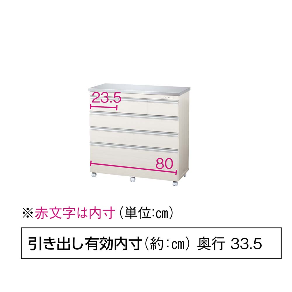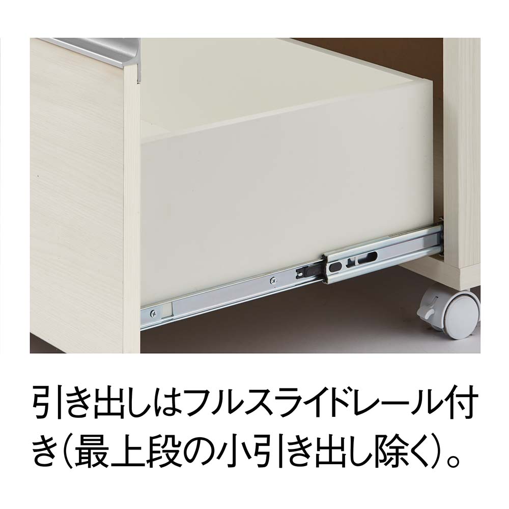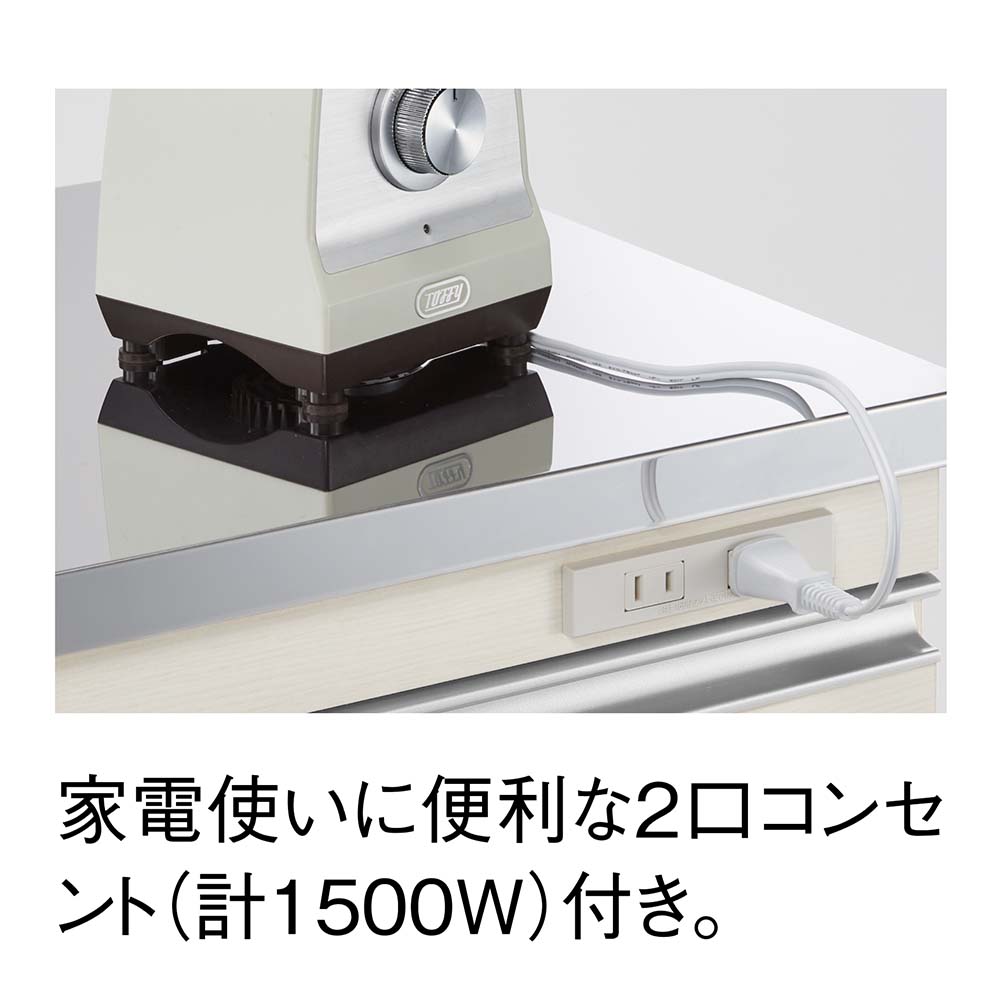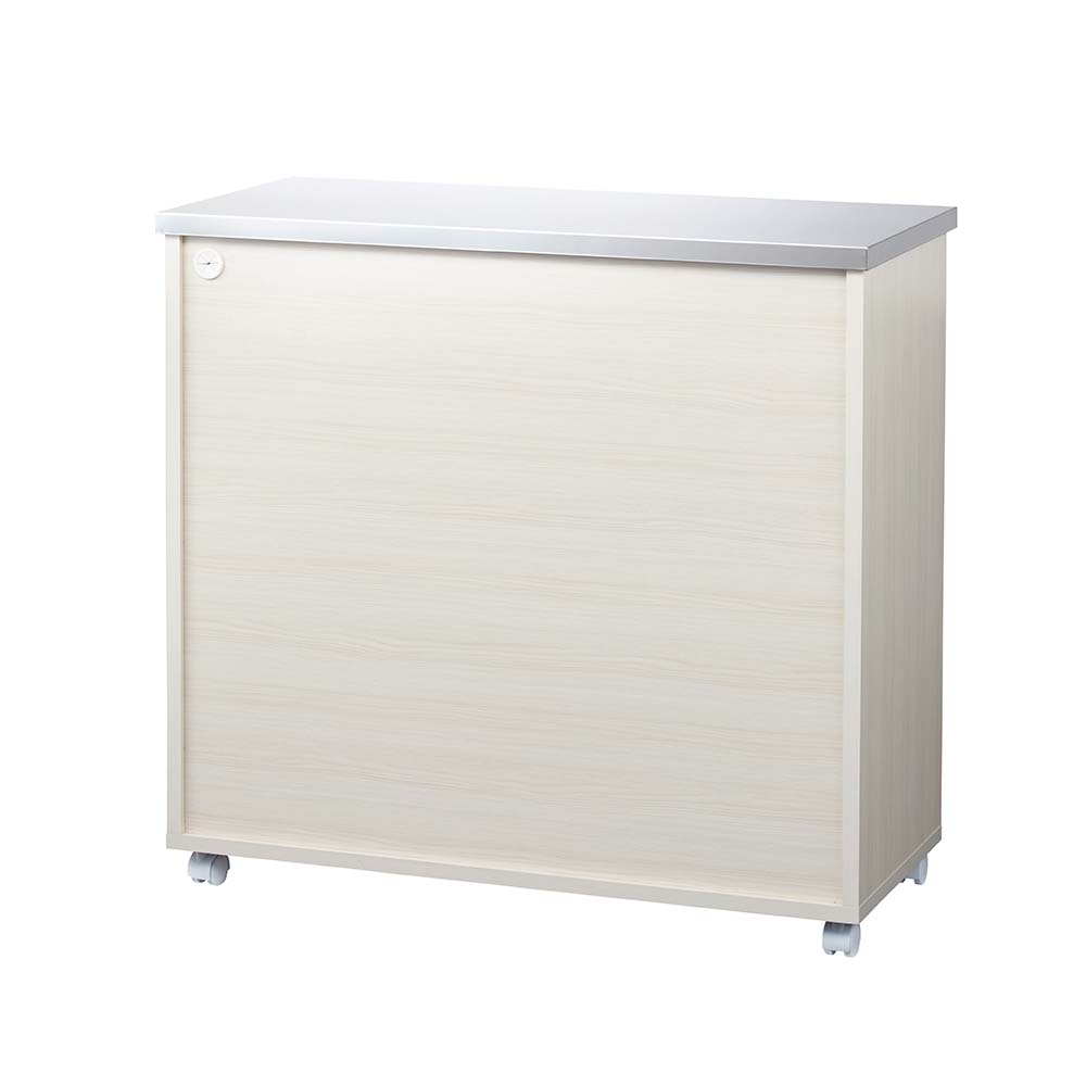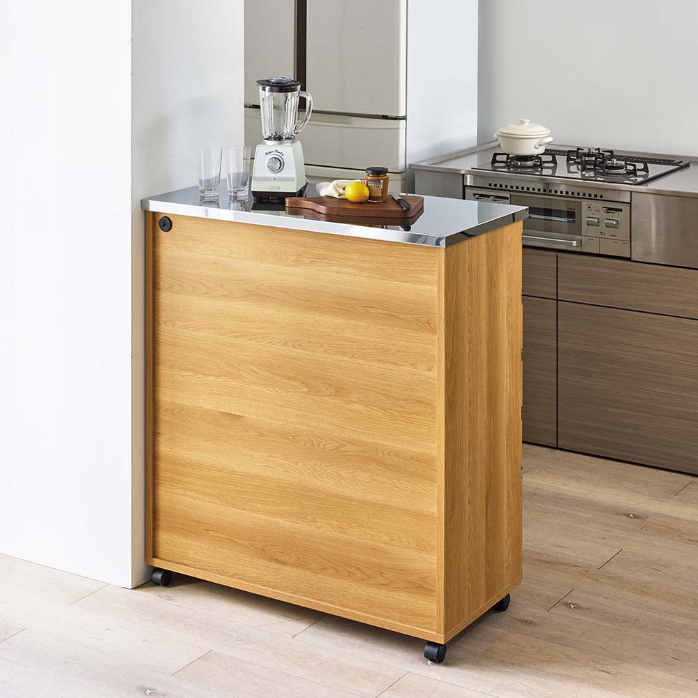 使いやすさと安心感を両立したステンレス天板カウンター。天板は作業台として使いやすく、深さの違う引き出し付き。作業と収納と収納がこれ一台でこなせます。高さは4段、5段の2タイプ、幅は、60cm・90cm・120cmの3タイプ。キャスター付きなので、簡単に移動が出来てお掃除もラクラク。背面も化粧仕上げでキッチンとダイニングの間仕切りにしてアイランドキッチンのようにも使えます。天板までしっかり使えるから、作業スペースも広がる水や熱に強いステンレス天板は、調理中の一時置きにも頼れる存在。熱い鍋も濡れたままの食器も気兼ねなく置けるので、キッチンの作業台としても重宝します。圧迫感がないから、空間も広々背の高い一般的なキッチンボードや食器棚と比較し、カウンタータイプの本商品は重心が低いので、万が一の災害時にも転倒リスクが少なく安心です。背が高くないのでキッチンやダイニングにゆとり感が生まれ、部屋全体が明るく見えるのも嬉しいポイント。出し入れしやすく、使いやすい高さ上段はカトラリーや調味料などの小物類に、下段のフルスライドレール付き引き出しは、かさばるストック食材や調理器具までしっかり収納。高い位置に手を伸ばすことなく、毎日の家事をラクにしてくれます。清潔感と高級感を両立した、ステンレス天板キラリと輝くステンレスは、水や汚れに強く、さっと拭くだけでお手入れも簡単。作業台としても、小型家電を置くレンジ台としても、幅広く活躍します。背面もきれいだから、間仕切り使いにも背面まで化粧仕上げされているので、キッチンとダイニングの間に置いても美しく。生活感の出やすいキッチン側を自然に目隠しして、ダイニングからの印象もすっきり整います。移動がラクでお掃除しやすいキャスター付きだから中身を入れたままでも移動がスムーズ。ちょっと動かして床をお掃除するときも便利です。キャスター(前輪)にはストッパー付きで安心。家電に便利な2口コンセント(計1500W)付き正面上部には電子レンジ、コーヒーメーカー、パン焼き機、トースターなどの家電に便利なコンセント付です。