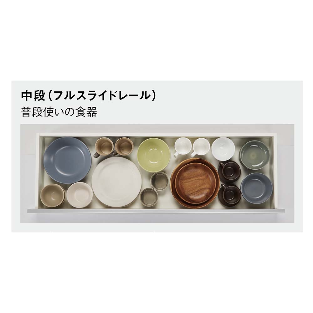 【中段引き出し(フルスライドレール)】皿や茶碗など普段使いの食器は中段に。