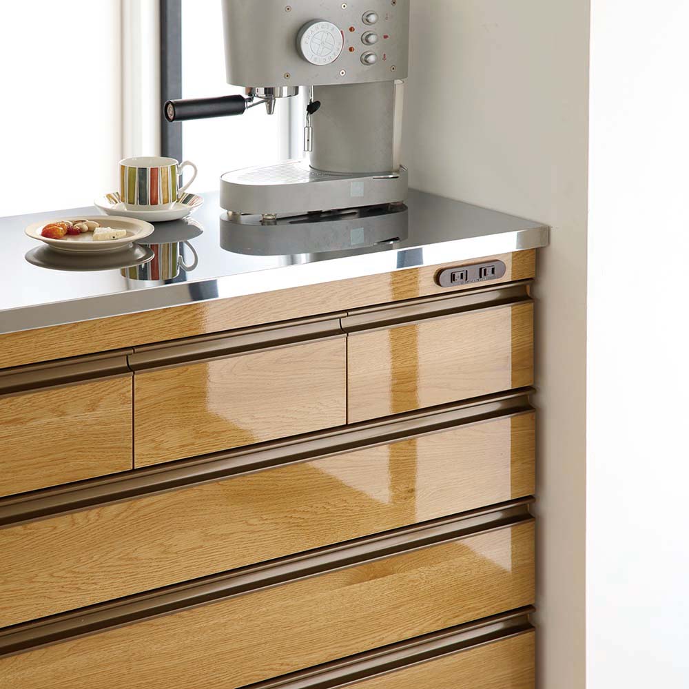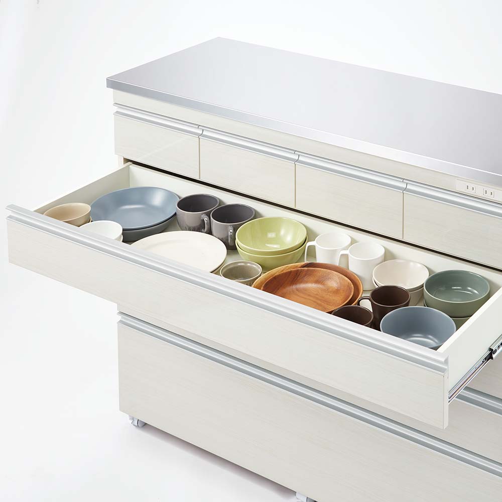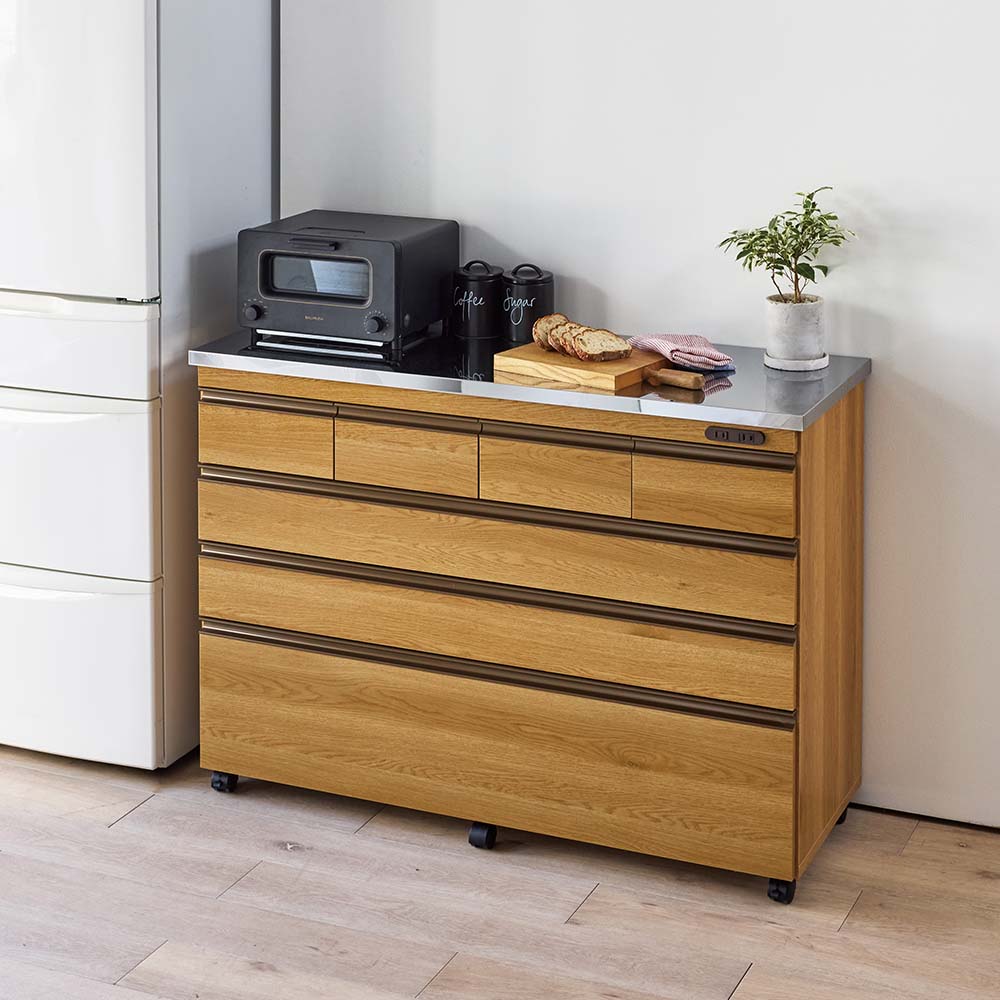 使いやすさと安心感を両立したステンレス天板カウンター。天板は作業台として使いやすく、深さの違う引き出し付き。作業と収納と収納がこれ一台でこなせます。高さは4段、5段の2タイプ、幅は、60cm・90cm・120cmの3タイプ。キャスター付きなので、簡単に移動が出来てお掃除もラクラク。背面も化粧仕上げでキッチンとダイニングの間仕切りにしてアイランドキッチンのようにも使えます。天板までしっかり使えるから、作業スペースも広がる水や熱に強いステンレス天板は、調理中の一時置きにも頼れる存在。熱い鍋も濡れたままの食器も気兼ねなく置けるので、キッチンの作業台としても重宝します。圧迫感がないから、空間も広々背の高い一般的なキッチンボードや食器棚と比較し、カウンタータイプの本商品は重心が低いので、万が一の災害時にも転倒リスクが少なく安心です。背が高くないのでキッチンやダイニングにゆとり感が生まれ、部屋全体が明るく見えるのも嬉しいポイント。出し入れしやすく、使いやすい高さ上段はカトラリーや調味料などの小物類に、下段のフルスライドレール付き引き出しは、かさばるストック食材や調理器具までしっかり収納。高い位置に手を伸ばすことなく、毎日の家事をラクにしてくれます。清潔感と高級感を両立した、ステンレス天板キラリと輝くステンレスは、水や汚れに強く、さっと拭くだけでお手入れも簡単。作業台としても、小型家電を置くレンジ台としても、幅広く活躍します。背面もきれいだから、間仕切り使いにも背面まで化粧仕上げされているので、キッチンとダイニングの間に置いても美しく。生活感の出やすいキッチン側を自然に目隠しして、ダイニングからの印象もすっきり整います。移動がラクでお掃除しやすいキャスター付きだから中身を入れたままでも移動がスムーズ。ちょっと動かして床をお掃除するときも便利です。キャスター(前輪)にはストッパー付きで安心。家電に便利な2口コンセント(計1500W)付き正面上部には電子レンジ、コーヒーメーカー、パン焼き機、トースターなどの家電に便利なコンセント付です。