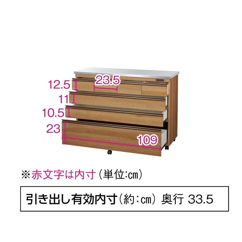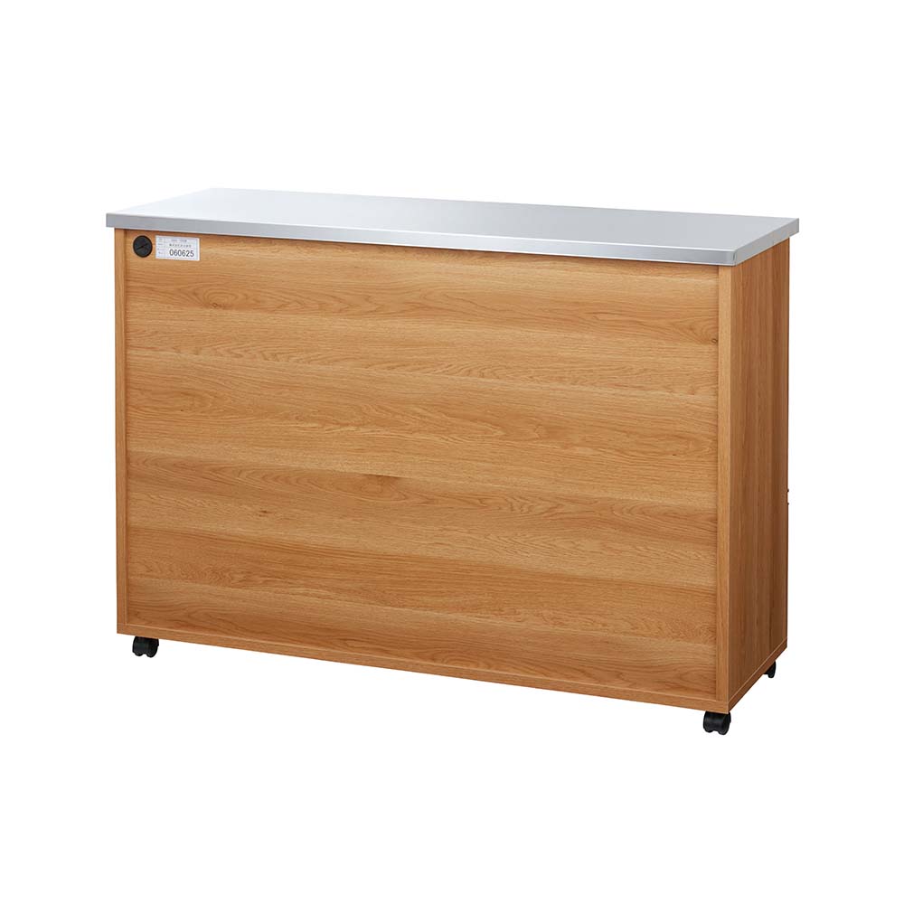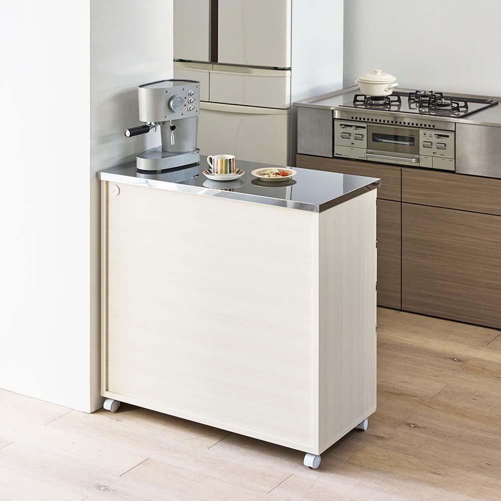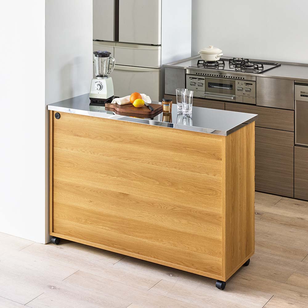 使いやすさと安心感を両立したステンレス天板カウンター。天板は作業台として使いやすく、深さの違う引き出し付き。作業と収納と収納がこれ一台でこなせます。高さは4段、5段の2タイプ、幅は、60cm・90cm・120cmの3タイプ。キャスター付きなので、簡単に移動が出来てお掃除もラクラク。背面も化粧仕上げでキッチンとダイニングの間仕切りにしてアイランドキッチンのようにも使えます。天板までしっかり使えるから、作業スペースも広がる水や熱に強いステンレス天板は、調理中の一時置きにも頼れる存在。熱い鍋も濡れたままの食器も気兼ねなく置けるので、キッチンの作業台としても重宝します。圧迫感がないから、空間も広々背の高い一般的なキッチンボードや食器棚と比較し、カウンタータイプの本商品は重心が低いので、万が一の災害時にも転倒リスクが少なく安心です。背が高くないのでキッチンやダイニングにゆとり感が生まれ、部屋全体が明るく見えるのも嬉しいポイント。出し入れしやすく、使いやすい高さ上段はカトラリーや調味料などの小物類に、下段のフルスライドレール付き引き出しは、かさばるストック食材や調理器具までしっかり収納。高い位置に手を伸ばすことなく、毎日の家事をラクにしてくれます。清潔感と高級感を両立した、ステンレス天板キラリと輝くステンレスは、水や汚れに強く、さっと拭くだけでお手入れも簡単。作業台としても、小型家電を置くレンジ台としても、幅広く活躍します。背面もきれいだから、間仕切り使いにも背面まで化粧仕上げされているので、キッチンとダイニングの間に置いても美しく。生活感の出やすいキッチン側を自然に目隠しして、ダイニングからの印象もすっきり整います。移動がラクでお掃除しやすいキャスター付きだから中身を入れたままでも移動がスムーズ。ちょっと動かして床をお掃除するときも便利です。キャスター(前輪)にはストッパー付きで安心。家電に便利な2口コンセント(計1500W)付き正面上部には電子レンジ、コーヒーメーカー、パン焼き機、トースターなどの家電に便利なコンセント付です。