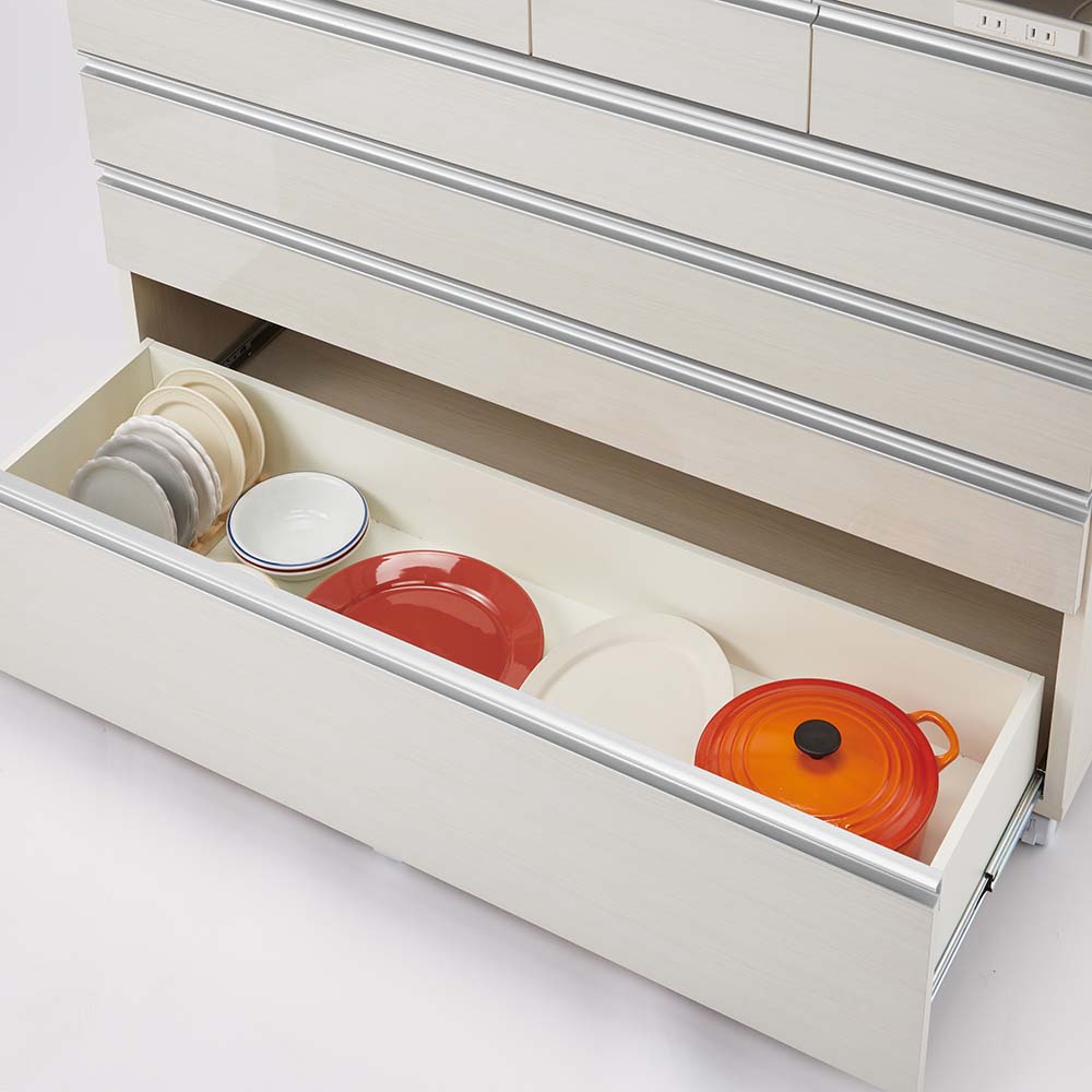 【中段引き出し(フルスライドレール)】皿や茶碗など普段使いの食器は中段に。