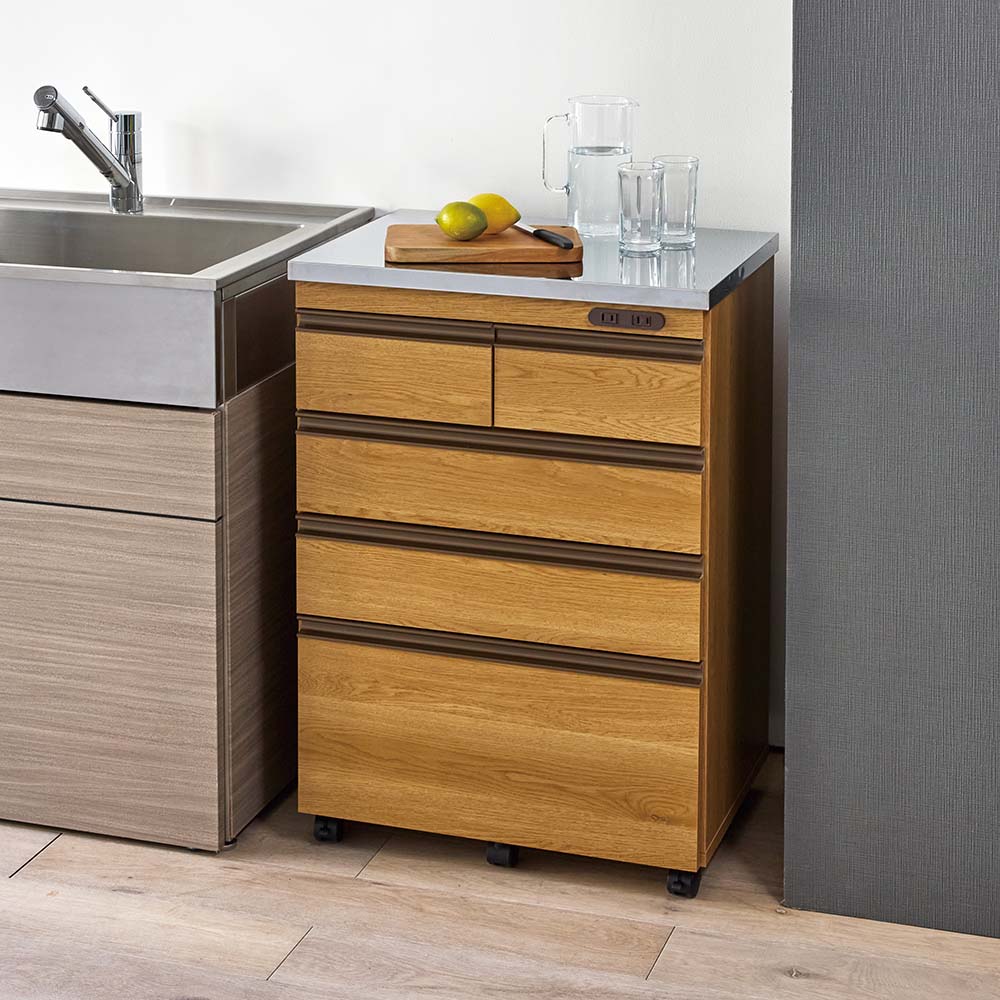 使いやすさと安心感を両立したステンレス天板カウンター。天板は作業台として使いやすく、深さの違う引き出し付き。作業と収納と収納がこれ一台でこなせます。高さは4段、5段の2タイプ、幅は、60cm・90cm・120cmの3タイプ。キャスター付きなので、簡単に移動が出来てお掃除もラクラク。背面も化粧仕上げでキッチンとダイニングの間仕切りにしてアイランドキッチンのようにも使えます。天板までしっかり使えるから、作業スペースも広がる水や熱に強いステンレス天板は、調理中の一時置きにも頼れる存在。熱い鍋も濡れたままの食器も気兼ねなく置けるので、キッチンの作業台としても重宝します。圧迫感がないから、空間も広々背の高い一般的なキッチンボードや食器棚と比較し、カウンタータイプの本商品は重心が低いので、万が一の災害時にも転倒リスクが少なく安心です。背が高くないのでキッチンやダイニングにゆとり感が生まれ、部屋全体が明るく見えるのも嬉しいポイント。出し入れしやすく、使いやすい高さ上段はカトラリーや調味料などの小物類に、下段のフルスライドレール付き引き出しは、かさばるストック食材や調理器具までしっかり収納。高い位置に手を伸ばすことなく、毎日の家事をラクにしてくれます。清潔感と高級感を両立した、ステンレス天板キラリと輝くステンレスは、水や汚れに強く、さっと拭くだけでお手入れも簡単。作業台としても、小型家電を置くレンジ台としても、幅広く活躍します。背面もきれいだから、間仕切り使いにも背面まで化粧仕上げされているので、キッチンとダイニングの間に置いても美しく。生活感の出やすいキッチン側を自然に目隠しして、ダイニングからの印象もすっきり整います。移動がラクでお掃除しやすいキャスター付きだから中身を入れたままでも移動がスムーズ。ちょっと動かして床をお掃除するときも便利です。キャスター(前輪)にはストッパー付きで安心。家電に便利な2口コンセント(計1500W)付き正面上部には電子レンジ、コーヒーメーカー、パン焼き機、トースターなどの家電に便利なコンセント付です。