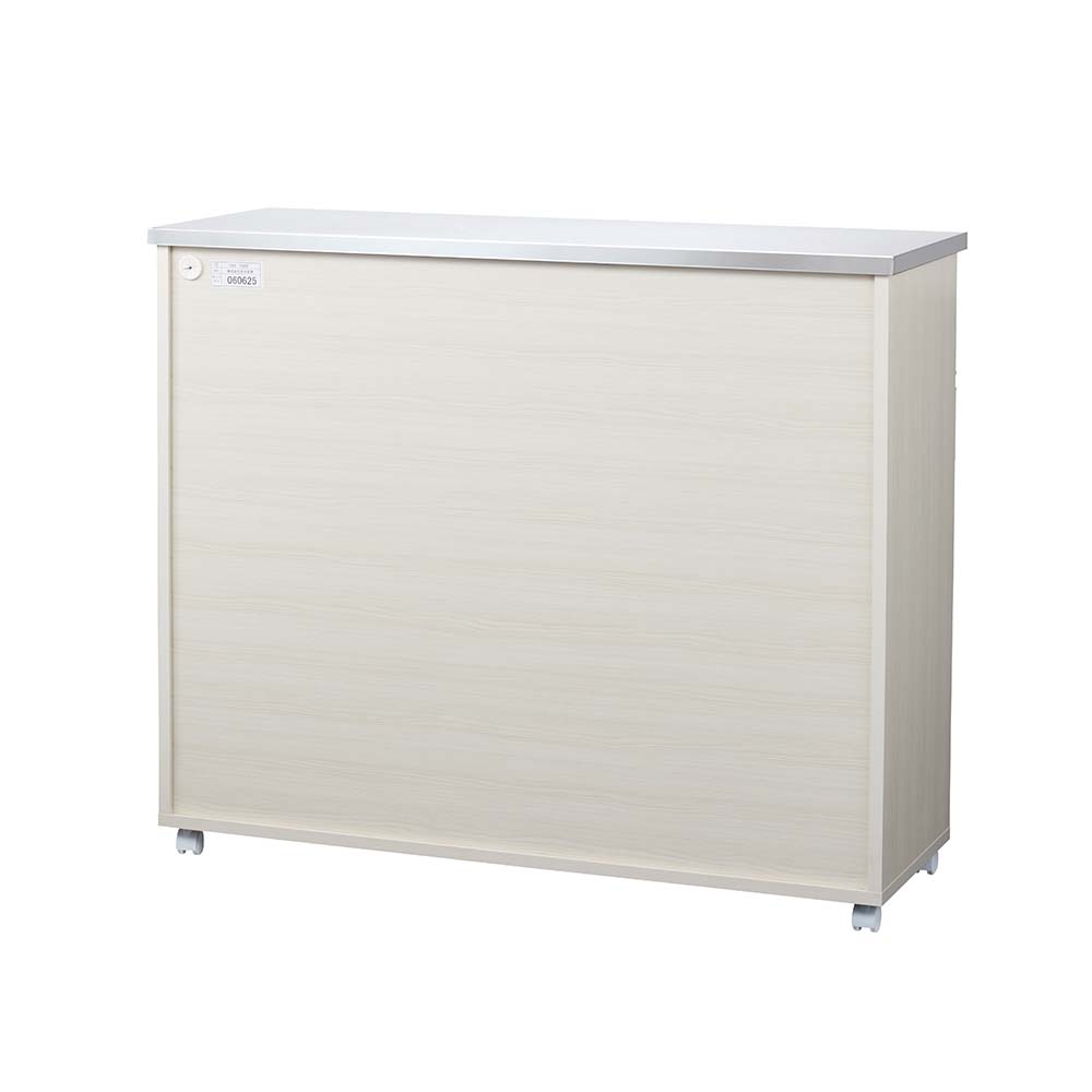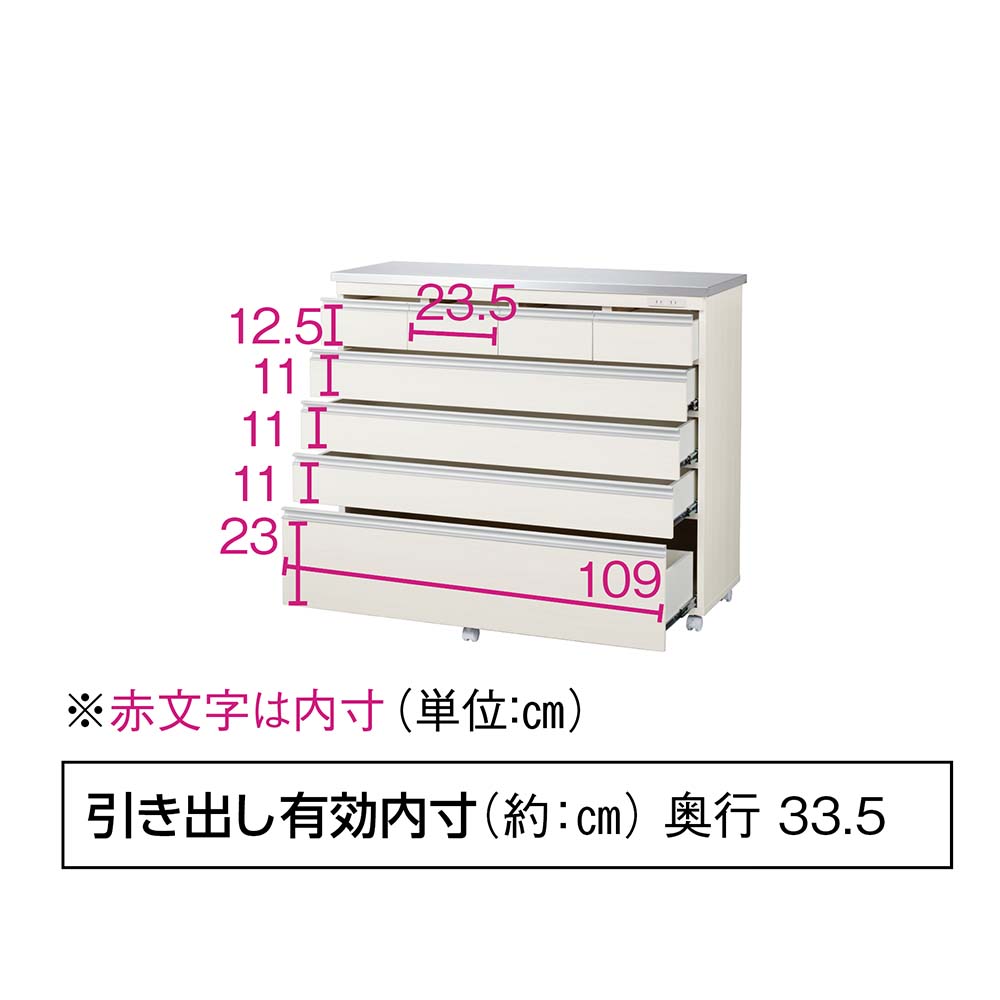 使いやすさと安心感を両立したステンレス天板カウンター。天板は作業台として使いやすく、深さの違う引き出し付き。作業と収納と収納がこれ一台でこなせます。高さは4段、5段の2タイプ、幅は、60cm・90cm・120cmの3タイプ。キャスター付きなので、簡単に移動が出来てお掃除もラクラク。背面も化粧仕上げでキッチンとダイニングの間仕切りにしてアイランドキッチンのようにも使えます。天板までしっかり使えるから、作業スペースも広がる水や熱に強いステンレス天板は、調理中の一時置きにも頼れる存在。熱い鍋も濡れたままの食器も気兼ねなく置けるので、キッチンの作業台としても重宝します。圧迫感がないから、空間も広々背の高い一般的なキッチンボードや食器棚と比較し、カウンタータイプの本商品は重心が低いので、万が一の災害時にも転倒リスクが少なく安心です。背が高くないのでキッチンやダイニングにゆとり感が生まれ、部屋全体が明るく見えるのも嬉しいポイント。出し入れしやすく、使いやすい高さ上段はカトラリーや調味料などの小物類に、下段のフルスライドレール付き引き出しは、かさばるストック食材や調理器具までしっかり収納。高い位置に手を伸ばすことなく、毎日の家事をラクにしてくれます。清潔感と高級感を両立した、ステンレス天板キラリと輝くステンレスは、水や汚れに強く、さっと拭くだけでお手入れも簡単。作業台としても、小型家電を置くレンジ台としても、幅広く活躍します。背面もきれいだから、間仕切り使いにも背面まで化粧仕上げされているので、キッチンとダイニングの間に置いても美しく。生活感の出やすいキッチン側を自然に目隠しして、ダイニングからの印象もすっきり整います。移動がラクでお掃除しやすいキャスター付きだから中身を入れたままでも移動がスムーズ。ちょっと動かして床をお掃除するときも便利です。キャスター(前輪)にはストッパー付きで安心。家電に便利な2口コンセント(計1500W)付き正面上部には電子レンジ、コーヒーメーカー、パン焼き機、トースターなどの家電に便利なコンセント付です。
