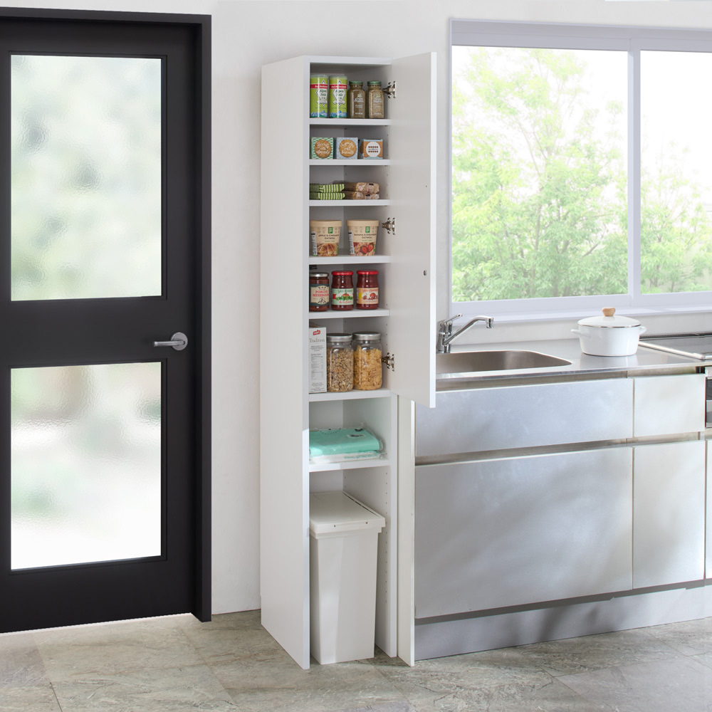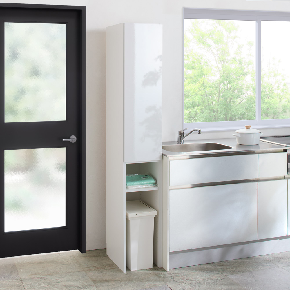 ゴミ箱、重くてかさばる食品ストック、ロボット掃除機などの置き場に、何かと便利な下段オープン棚。すぐに使える完成品でのお届けで、組立に自信がない・手間はかけたくない方も安心してご購入頂けます!底板がない下段オープンスペースが大活躍するキッチンストッカー●下段には底板がないから、重くてかさばるモノの収納場所として活躍します。●オープン部は高さ78cm。縦型のゴミ箱もスッキリ収まります。●コードを逃がせる仕様だから、ロボット掃除機の充電ベース置き場にも最適。●ケースで購入する飲料水や生活用品のストックもたっぷり収納できます。届いたその日からすぐに使える完成品でお届けします●完成品で届くので、組み立てが苦手な人も安心してお使いいただけます。●扉には清潔感と高級感のある光沢素材を使用。冷蔵庫と並べた時の統一感も好印象。●扉は軽く押すだけで開くプッシュオープン式。取っ手がないので見た目もスマートです。●前後・左右の調整が可能で、スムーズに開閉する蝶番を採用。置き場に困る物の定位置が決まって、キッチンはスッキリ●上段の扉収納と下段のオープン収納を使い分けて、収納上手なキッチンが完成します。●固定棚2枚の他に、可動棚板5枚付き。収納したい物に合わせて高さが調節できます。●大きく開いて探しやすく、出し入れしやすい扉収納は、閉じればスッキリ片付いたキッチンに。●下段のオープンスペースは、廃品回収に出す物や防災用品など、収納に困る物の置き場にも最適。スペースや使い方に合わせて4サイズが選べます●狭いキッチンにも置ける幅30cmからたっぷり収納できる幅80cmまで、4サイズご用意しました。●下段のオープンスペースに、市販のゴミ箱やストック用ワゴンが収納しやすいサイズ設計です。●幅30cmタイプと45cmタイプの扉部は、左右どちら開きにも付け替え可能です。●幅60cmタイプと80cmタイプの扉部は、片方だけでも開けられる観音開きです。シリーズ商品のご案内組立不要! 完成品ですぐに使える下段オープン収納庫は以下のシリーズ商品がございます。※このページは幅30cmタイプの販売ページです。・幅30cmタイプ・幅45cmタイプ・幅60cmタイプ・幅80cmタイプ