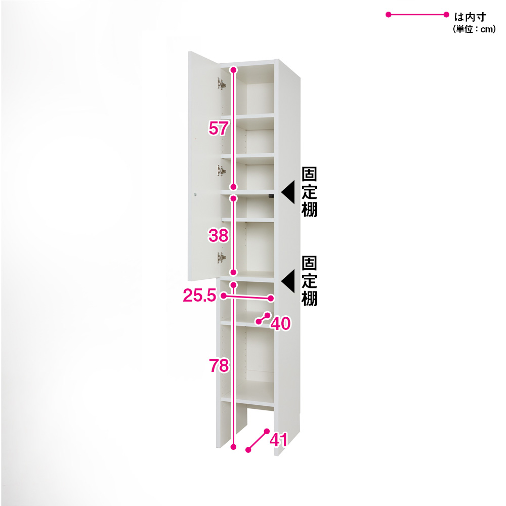 ※赤文字は内寸(単位:cm) 棚板有効内寸約:幅25.5cm奥行40cm(金具部分除く) オープン部有効内寸約:幅25.5cm奥行41cm