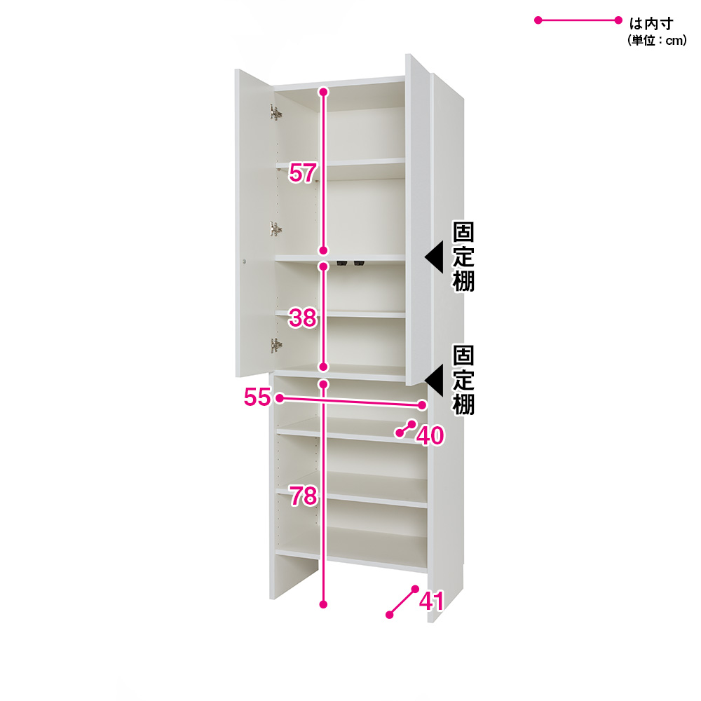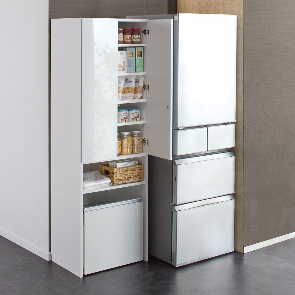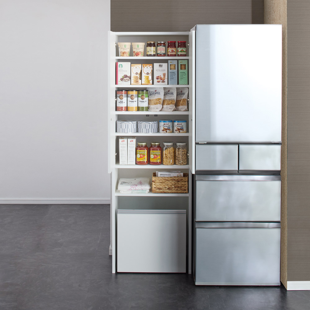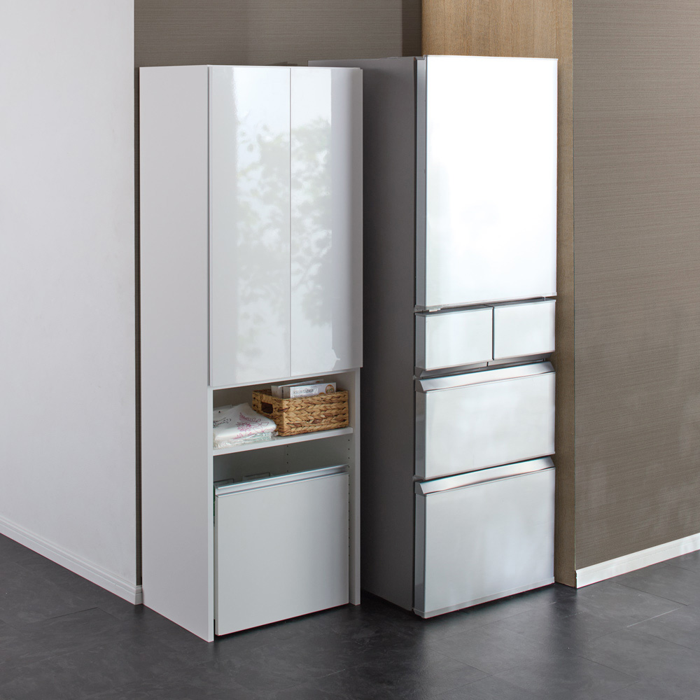 ゴミ箱、重くてかさばる食品ストック、ロボット掃除機などの置き場に、何かと便利な下段オープン棚。すぐに使える完成品でのお届けで、組立に自信がない・手間はかけたくない方も安心してご購入頂けます!底板がない下段オープンスペースが大活躍するキッチンストッカー●下段には底板がないから、重くてかさばるモノの収納場所として活躍します。●オープン部は高さ78cm。縦型のゴミ箱もスッキリ収まります。●コードを逃がせる仕様だから、ロボット掃除機の充電ベース置き場にも最適。●ケースで購入する飲料水や生活用品のストックもたっぷり収納できます。届いたその日からすぐに使える完成品でお届けします●完成品で届くので、組み立てが苦手な人も安心してお使いいただけます。●扉には清潔感と高級感のある光沢素材を使用。冷蔵庫と並べた時の統一感も好印象。●扉は軽く押すだけで開くプッシュオープン式。取っ手がないので見た目もスマートです。●前後・左右の調整が可能で、スムーズに開閉する蝶番を採用。置き場に困る物の定位置が決まって、キッチンはスッキリ●上段の扉収納と下段のオープン収納を使い分けて、収納上手なキッチンが完成します。●固定棚2枚の他に、可動棚板5枚付き。収納したい物に合わせて高さが調節できます。●大きく開いて探しやすく、出し入れしやすい扉収納は、閉じればスッキリ片付いたキッチンに。●下段のオープンスペースは、廃品回収に出す物や防災用品など、収納に困る物の置き場にも最適。スペースや使い方に合わせて4サイズが選べます●狭いキッチンにも置ける幅30cmからたっぷり収納できる幅80cmまで、4サイズご用意しました。●下段のオープンスペースに、市販のゴミ箱やストック用ワゴンが収納しやすいサイズ設計です。●幅30cmタイプと45cmタイプの扉部は、左右どちら開きにも付け替え可能です。●幅60cmタイプと80cmタイプの扉部は、片方だけでも開けられる観音開きです。シリーズ商品のご案内組立不要! 完成品ですぐに使える下段オープン収納庫は以下のシリーズ商品がございます。※このページは幅60cmタイプの販売ページです。・幅30cmタイプ・幅45cmタイプ・幅60cmタイプ・幅80cmタイプ