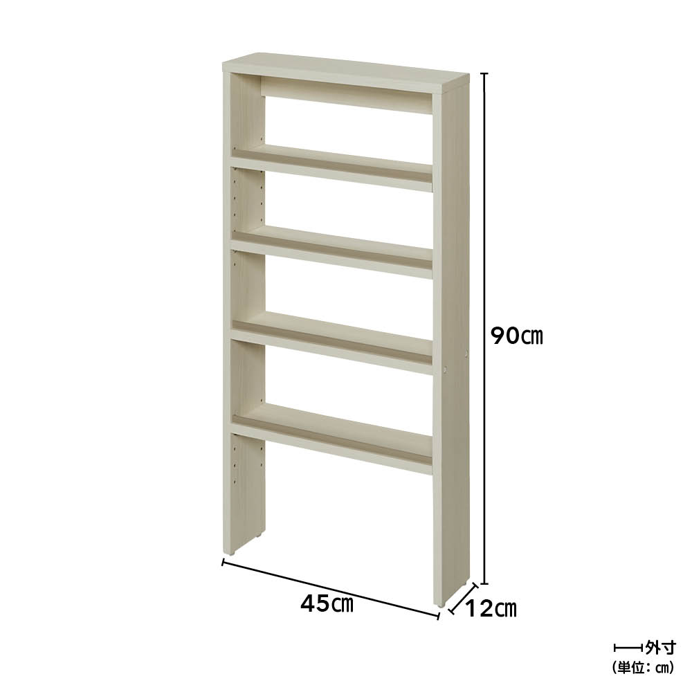 奥行12cmの超薄型!キッチンや廊下、洗面所、リビングなど広さにゆとりのないどんな場所も、突っ張り不要でスマートな収納空間に。簡単設置で壁にぴったり取り付けられるから、安定感も安心です。ブラウン 写真左からロータイプ高さ90cm幅80cm、ロータイプ高さ90cm幅60cm突っ張らずに置ける奥行12cmの超薄型ここには置けない…を覆す、突っ張らなくても壁にピッタリ設置できる超薄型ラック。奥行が浅いカウンター下のスペースにもすっきりコンパクトに設置可能な奥行12cm。背板がないので壁のコンセントも生かせて、電気ポットなどキッチン家電の使用にも便利です。 ※ぴったり横にすると金具のロックがやりにくいです。写真上段:ホワイト木目 写真下段:ブラウン丁寧な造りの日本製壁ピタ設置で突っ張らずに置ける超薄型ラックのロータイプは、幅は45cm、60cm、80cmの3タイプ、色はホワイト木目、ブラウンの2色があり、お部屋に合わせてお選びいただけます。国内メーカーが丁寧に仕上げました。突っ張らないから見た目スッキリ突っ張り式のラックでは突っ張り金具が必要となり、どうしても天板上がごちゃついた印象に。突っ張らずに置ける超薄型ラックなら、壁にピッタリ設置する方式なので突っ張り金具もなく、すっきり見えます。石膏ボードの壁に付属の固定具でカンタン設置!設置跡が目立ちにくいから安心壁紙の内側が石膏ボード製の壁に専用の針で取り付けられます。お引越しなどで取り外した際も針穴が目立ちにくいので、賃貸のお部屋でも安心です。物が落ちにくいこぼれ止め付き3cm間隔で設置できる可動棚板は耐荷重約5kg。棚板には立ち上がりがあるのでボトル類などが落ちにくく安心です。棚板の奥行は12cm。背板がなく、こぼれ止めも取り外せるので、薄型でも棚板の奥行を最大限に生かせます。背板がないのでコンセントも生かせます背中の板がないためスイッチやコンセントを塞ぐことなく使え、携帯の充電や小型家電の使用にも便利です。ホワイト木目 写真左からハイタイプ高さ180cm幅80cm、ロータイプ高さ90cm幅45cm。シリーズ商品にはハイタイプ(別売り)もあります別売りのハイタイプ(高さ180cm)と組み合わせることで、お部屋に合わせて自由に収納空間を作れます。たとえば窓下にロータイプ、横にハイタイプを並べてもちょうどいいバランスに。最下段の下はお掃除ロボットの格納場所としても。