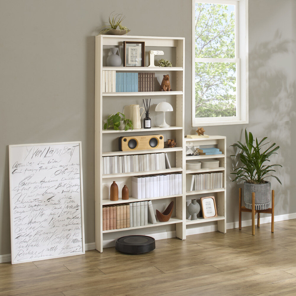 コーディネート例(ア)ホワイト木目 うちには無理…を覆す、超薄型の奥行12cm。石膏ボードの壁に付属の壁面固定具で誰でも簡単に設置でき、取り外し後は壁の針跡も目立ちません。 ※写真左からハイタイプ高さ180cm幅80cm、ロータイプ高さ90cm幅45cm。