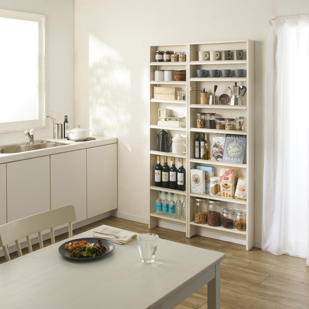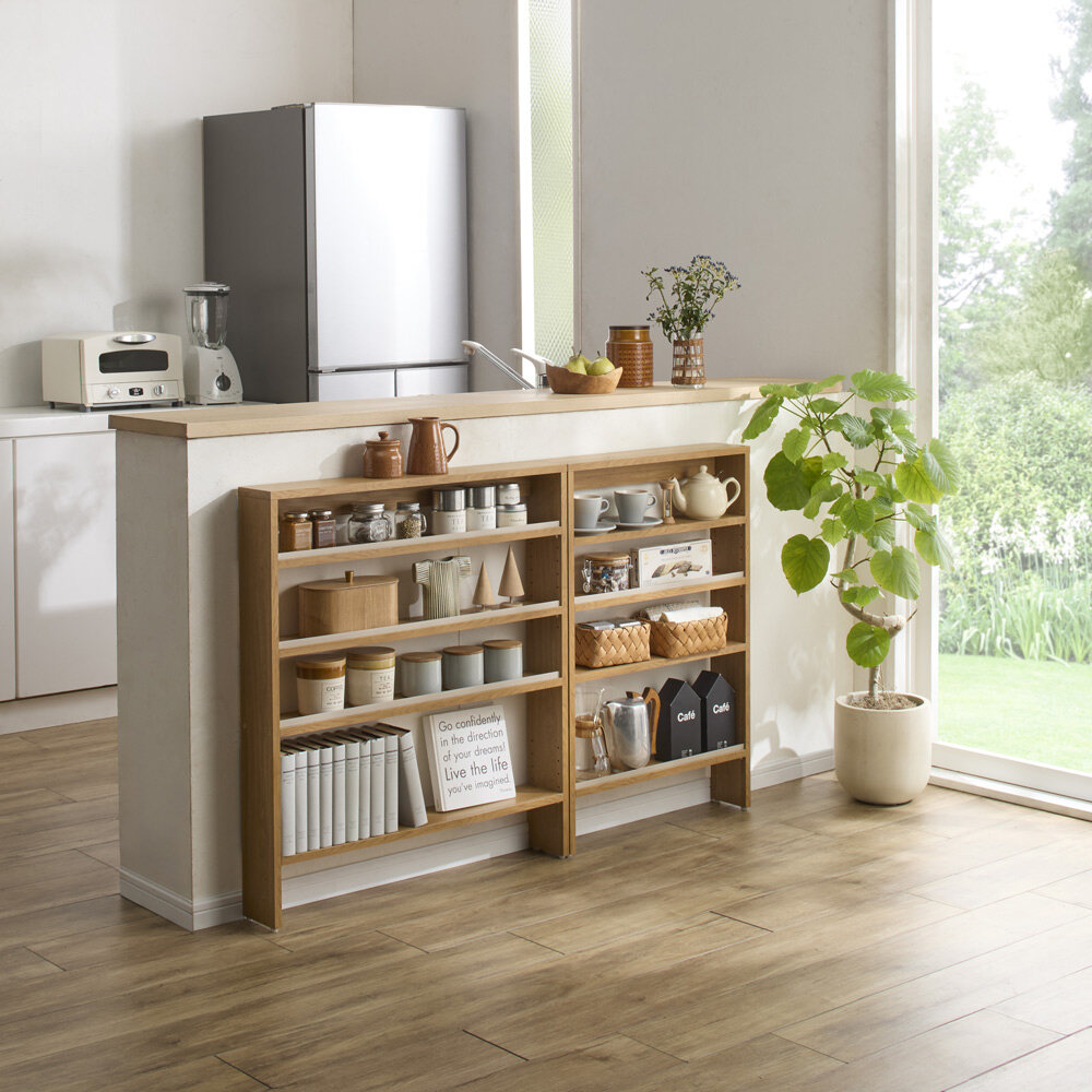 奥行12cmの超薄型!キッチンや廊下、洗面所、リビングなど広さにゆとりのないどんな場所も、突っ張り不要でスマートな収納空間に。簡単設置で壁にぴったり取り付けられるから、安定感も安心です。ブラウン 写真左からロータイプ高さ90cm幅80cm、ロータイプ高さ90cm幅60cm突っ張らずに置ける奥行12cmの超薄型ここには置けない…を覆す、突っ張らなくても壁にピッタリ設置できる超薄型ラック。奥行が浅いカウンター下のスペースにもすっきりコンパクトに設置可能な奥行12cm。背板がないので壁のコンセントも生かせて、電気ポットなどキッチン家電の使用にも便利です。 ※ぴったり横にすると金具のロックがやりにくいです。写真上段:ホワイト木目 写真下段:ブラウン丁寧な造りの日本製壁ピタ設置で突っ張らずに置ける超薄型ラックのロータイプは、幅は45cm、60cm、80cmの3タイプ、色はホワイト木目、ブラウンの2色があり、お部屋に合わせてお選びいただけます。国内メーカーが丁寧に仕上げました。突っ張らないから見た目スッキリ突っ張り式のラックでは突っ張り金具が必要となり、どうしても天板上がごちゃついた印象に。突っ張らずに置ける超薄型ラックなら、壁にピッタリ設置する方式なので突っ張り金具もなく、すっきり見えます。石膏ボードの壁に付属の固定具でカンタン設置!設置跡が目立ちにくいから安心壁紙の内側が石膏ボード製の壁に専用の針で取り付けられます。お引越しなどで取り外した際も針穴が目立ちにくいので、賃貸のお部屋でも安心です。物が落ちにくいこぼれ止め付き3cm間隔で設置できる可動棚板は耐荷重約5kg。棚板には立ち上がりがあるのでボトル類などが落ちにくく安心です。棚板の奥行は12cm。背板がなく、こぼれ止めも取り外せるので、薄型でも棚板の奥行を最大限に生かせます。背板がないのでコンセントも生かせます背中の板がないためスイッチやコンセントを塞ぐことなく使え、携帯の充電や小型家電の使用にも便利です。ホワイト木目 写真左からハイタイプ高さ180cm幅80cm、ロータイプ高さ90cm幅45cm。シリーズ商品にはハイタイプ(別売り)もあります別売りのハイタイプ(高さ180cm)と組み合わせることで、お部屋に合わせて自由に収納空間を作れます。たとえば窓下にロータイプ、横にハイタイプを並べてもちょうどいいバランスに。最下段の下はお掃除ロボットの格納場所としても。
