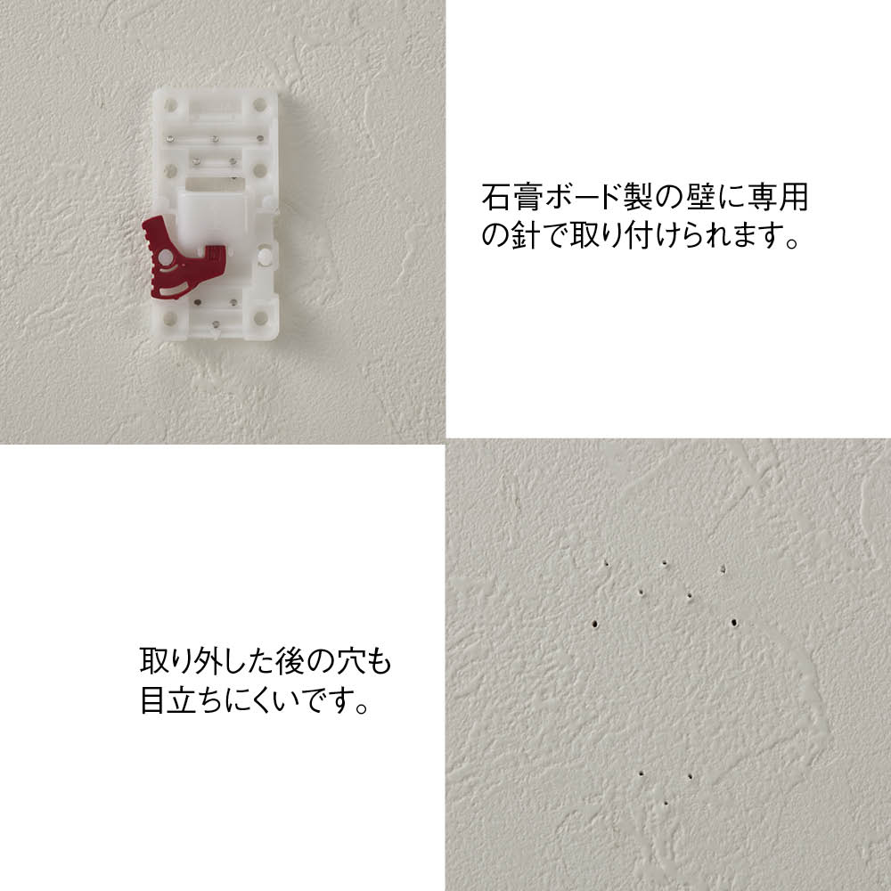 石膏ボードの壁に付属の壁面固定具で誰でも簡単に設置でき、取り外し後は壁の針跡も目立ちません。